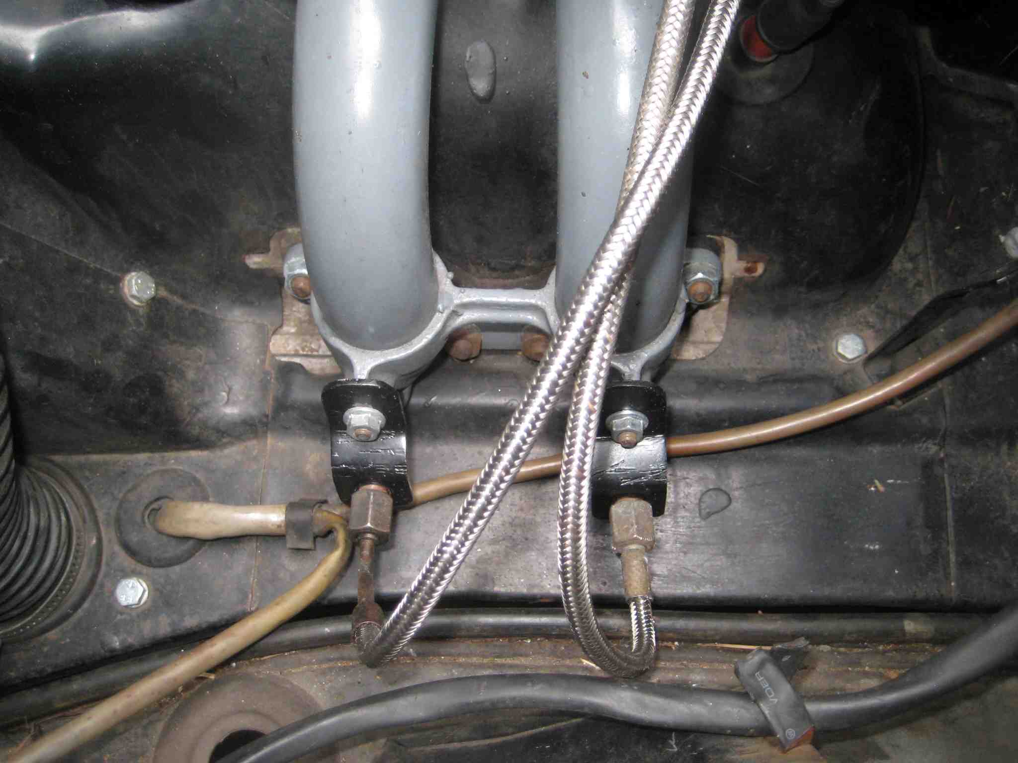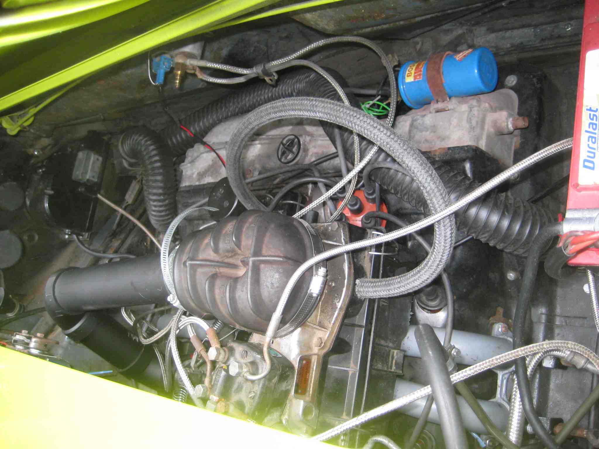 Fuel distributor – VW Rabbit Warm up Regulator- VW Rabbit Fuel lines-Audi Fuel Injectors-Audi Fuel Pump, Filter, and Accumulator – Mercedes 300 class And assorted flexible hoses and fittings from various German cars I used stuff that was readily available at the local junkyard and I spent less than $150 putting this system together. The easiest route though would have been to just get everything off a VW rabbit and be done with it but the junkyard didn't have a complete Rabbit at the time. The pictures show my initial installation of everything. I’ll clean up some of my workings now that I know the system works to my liking. The airbox/ fuel distributor is simply bolted to the intake runners, the warm up regulator is mounted to the firewall, and the Mercedes fuel pump assembly is mounted on the firewall under the engine. Sorry for the crappy pics... (IMG:style_emoticons/default/dry.gif) |
