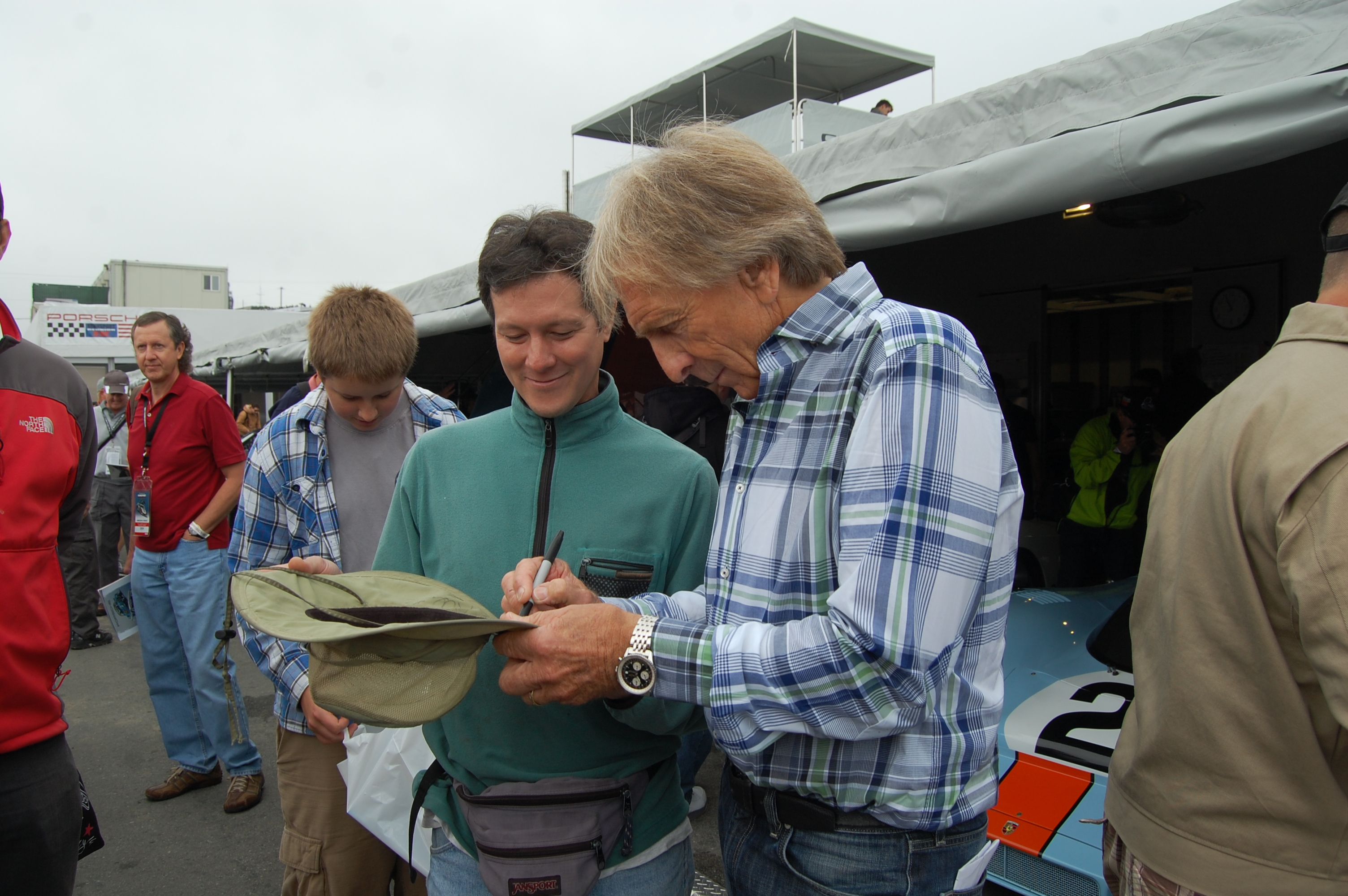 rennsport on saturday was so awesome. sun took awhile to come out but, we're only mildly sunburnt for it. been to historic events that featured porsche as the marque but this blew 'em away! i'm sure i'll wonder if it was all just a dream tomorrow... mr. bell was kind enough to sign an autograph or two between promotional gigs for speed channel. nice hat hair, dork! |