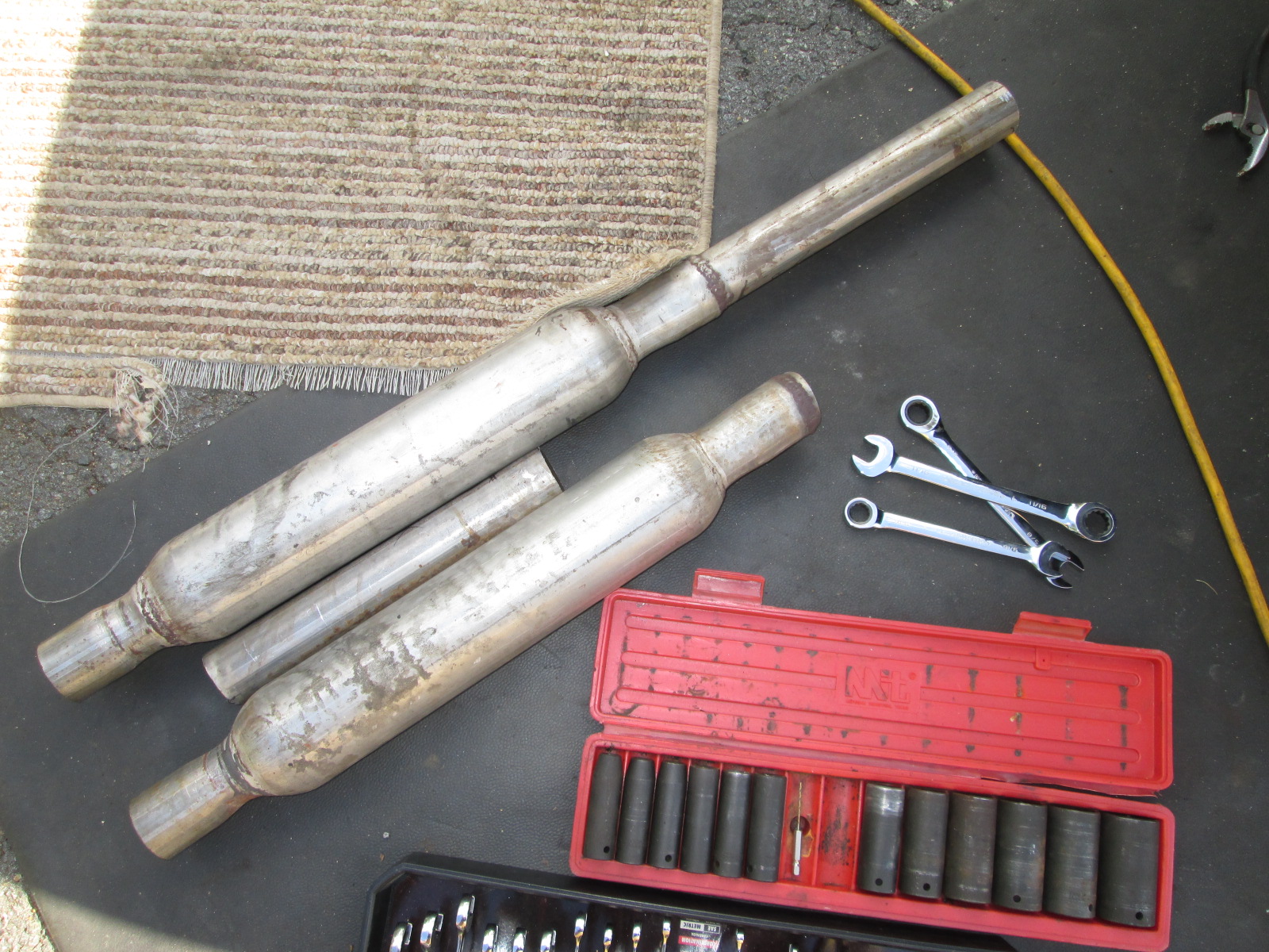 magnaflows are in and NO MORE DRONE. you guys were right to guide to toward magnaflows, i almost bought walkers. exhaust is a lot quieter and the rear section is higher off ground. tomorrow i will decide how to fab up a hanger. i just got it on ground and wheels back on and took it for a drive, so much more pleasant to drive, almost civilized (IMG:style_emoticons/default/biggrin.gif) but now i can hear more squeaks and rattles (IMG:style_emoticons/default/sad.gif)