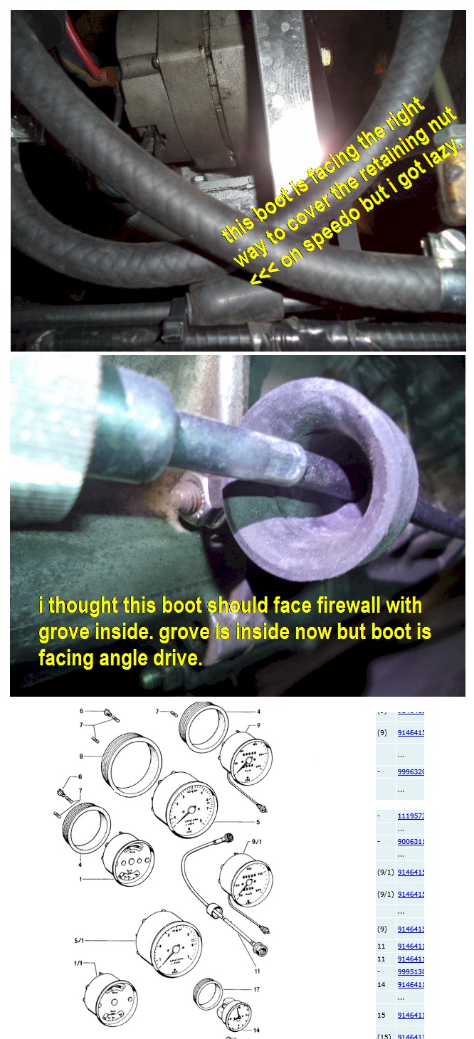 speedo installed (IMG:style_emoticons/default/smile.gif) but I got a boots question. I thought big boot should be facing firewall? not angle drive? if this boot covers angle drive, what covers the hole in the firewall, the small boot? makes sense to me now. it is just when I rcvd it, the speedo nut was lodged in the smaller boot. my sbc 307 seems to hum all the way to ALMOST 5000 rpms. though I keep it around <3k most of the time. still trying to get used to driving a stick again.