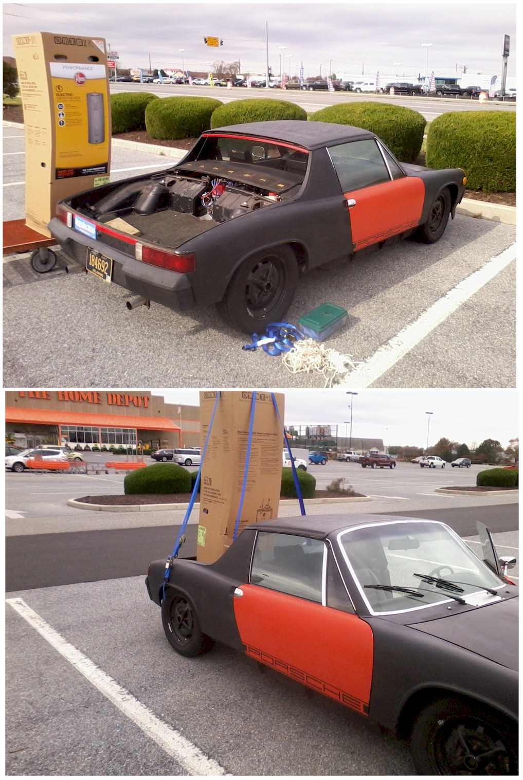 this is getting ridiculous. I really need a pickup truck. my hot water heater broke and I needed to replace it today. Porsche 914 to the rescue. even had to remove the trunk lid to pull this off. I'm curious if it made it home safely without falling out. Around here in Dallas for $20 you can rent one of their trucks for a little over an hour. I have done this many times over the years. --- bill |
