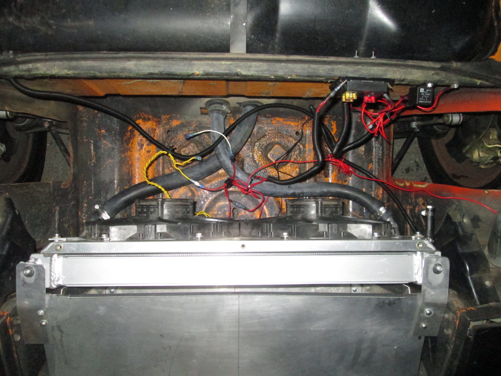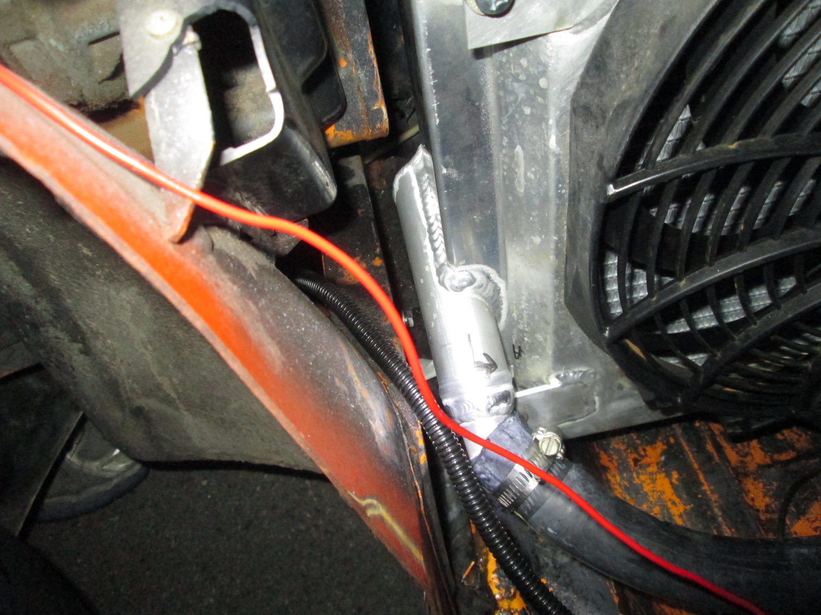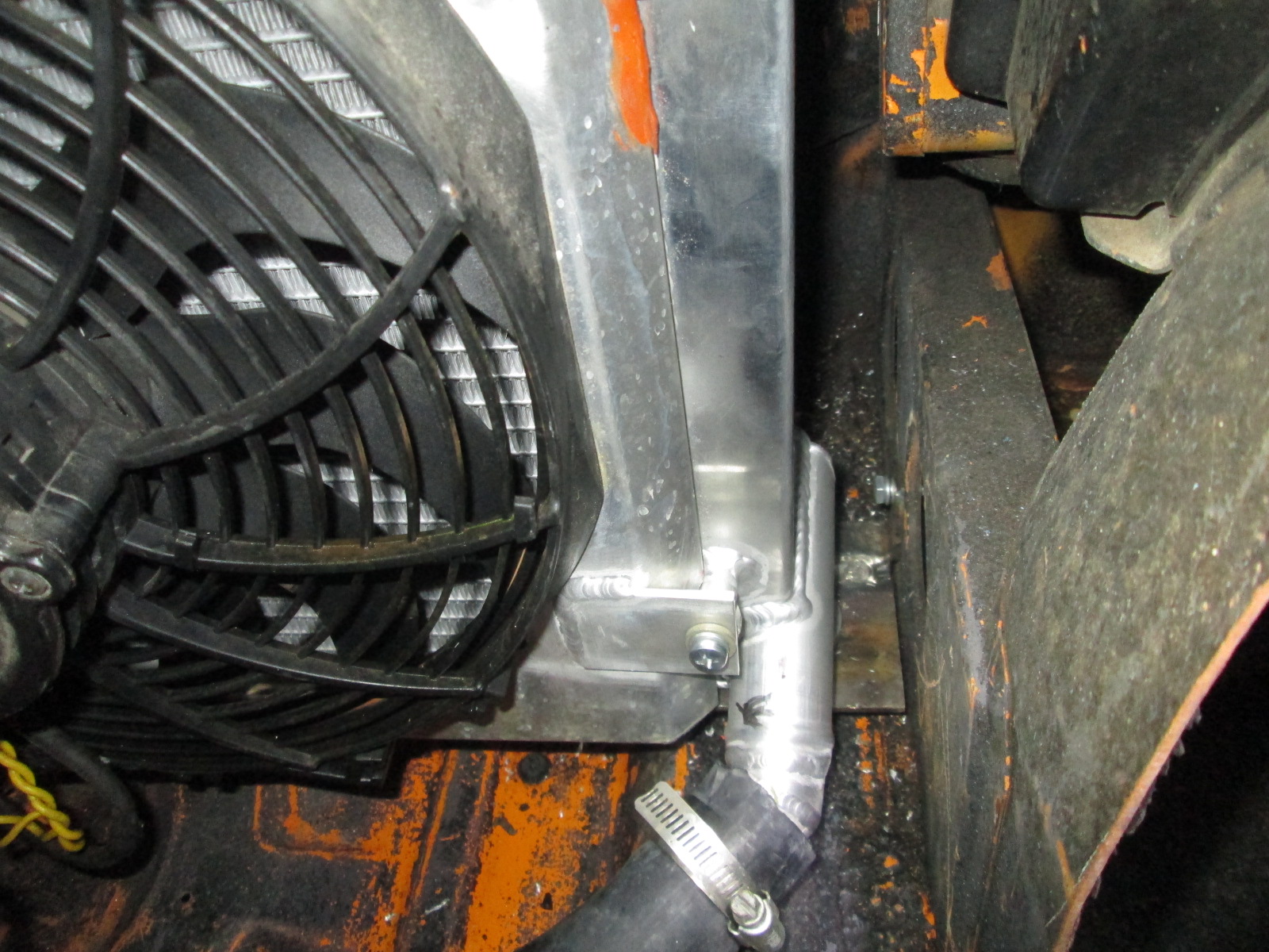 hoses connected. fans are manual ON until i get a sensor installed. ran car for about 10 mins, letting it cool down, will recheck water level then. my welding resulted in one upright not being perfectly symetrical to the other, thus the larger gap at top on the drivers side (IMG:style_emoticons/default/sad.gif) (IMG:style_emoticons/default/beer3.gif)