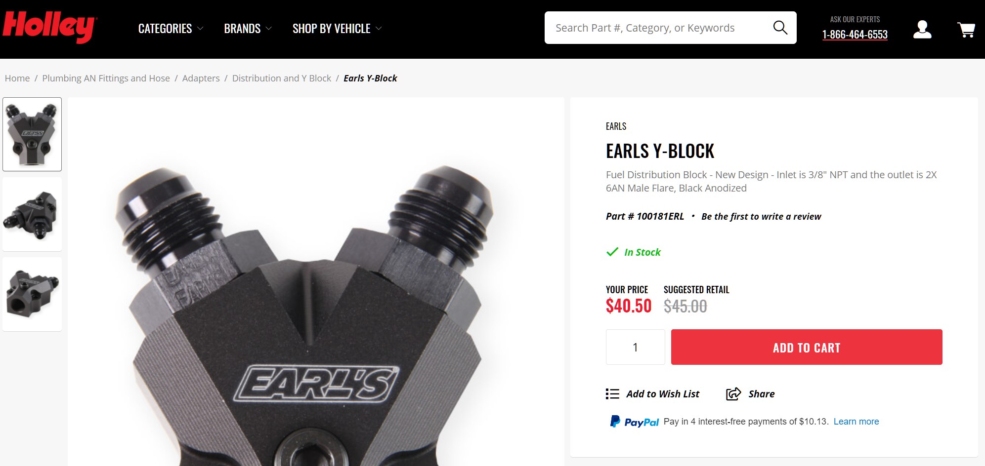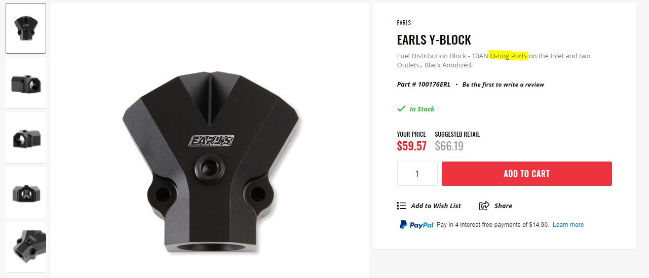 this y was seeping at the bottom but i added some gasoila thread sealant and that worked. but honestly not sure if its the right fitting - maybe i need an o-ring there? -steve From the looks of the fitting, the 2 outputs of the "Y" have adaptors threaded all the way to the body which lets us assume there is an o-ring in there. That being said, at the inlet your fitting doesn't go all the way. Is the Earl's fitting really a female NPT thread at that end? Seems to me it probably is the same setup as the 2 outlets. Also, your male NPT doesn't seem to be threaded very deep in for an NPT, another sign that these might not be matching. Actually, just found this. O-ring is your answer! https://www.holley.com/products/plumbing_an...parts/100176ERL |