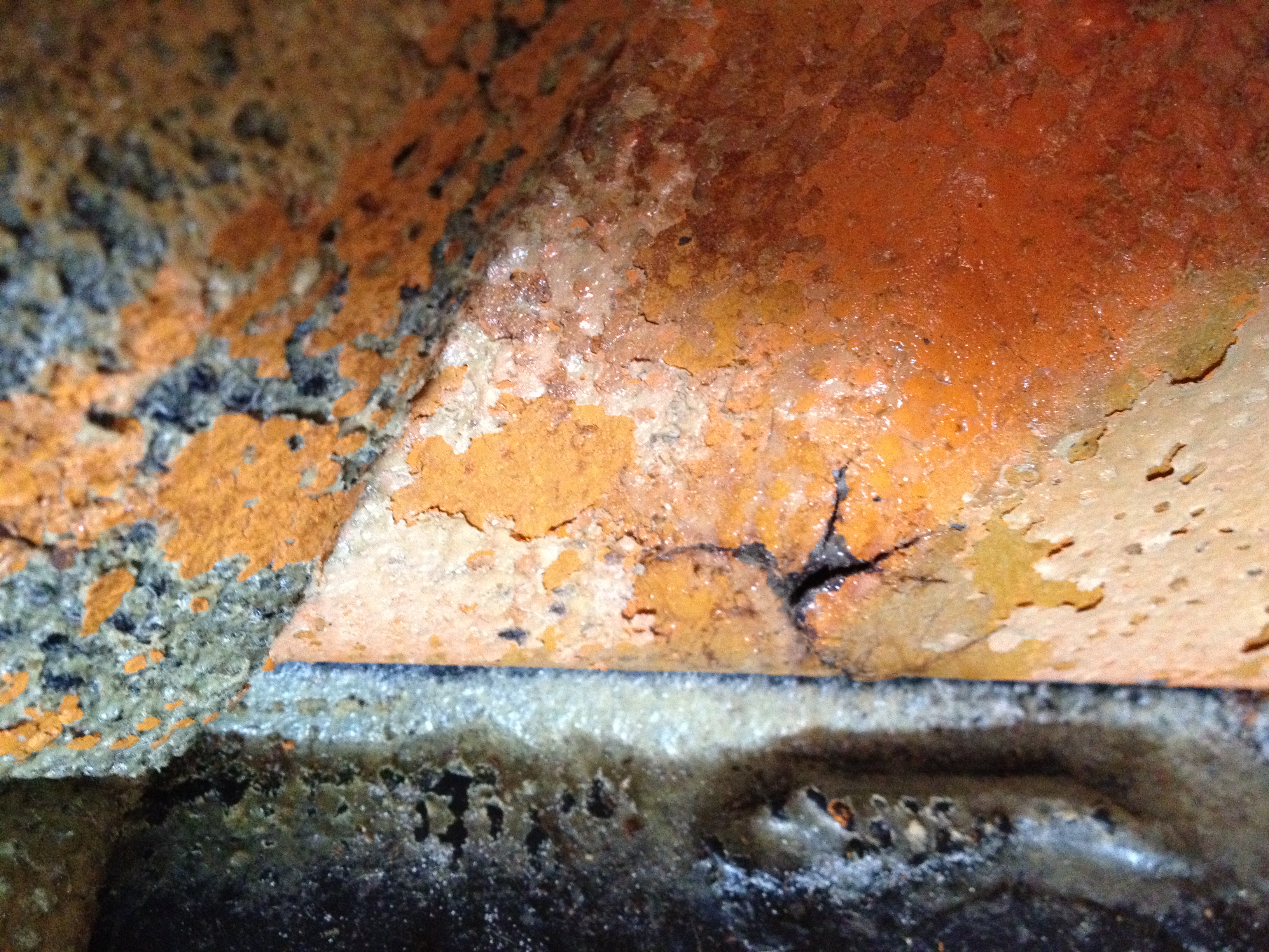 We'll I'm almost done tearing the car done for my "re-build" and came across this surprise tonight. The inside of the drives side longitudinal is cracked. That is a crack in the metal, there is no tar (removed long ago). Anyone ever seen that?