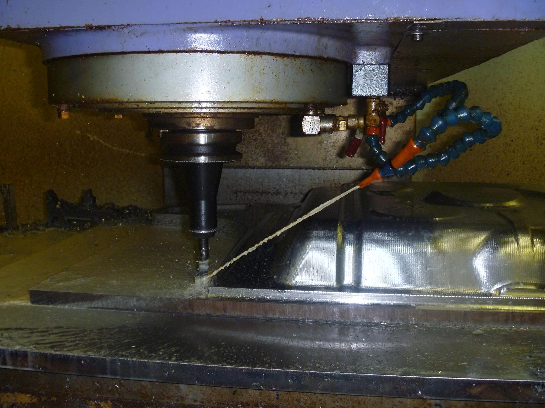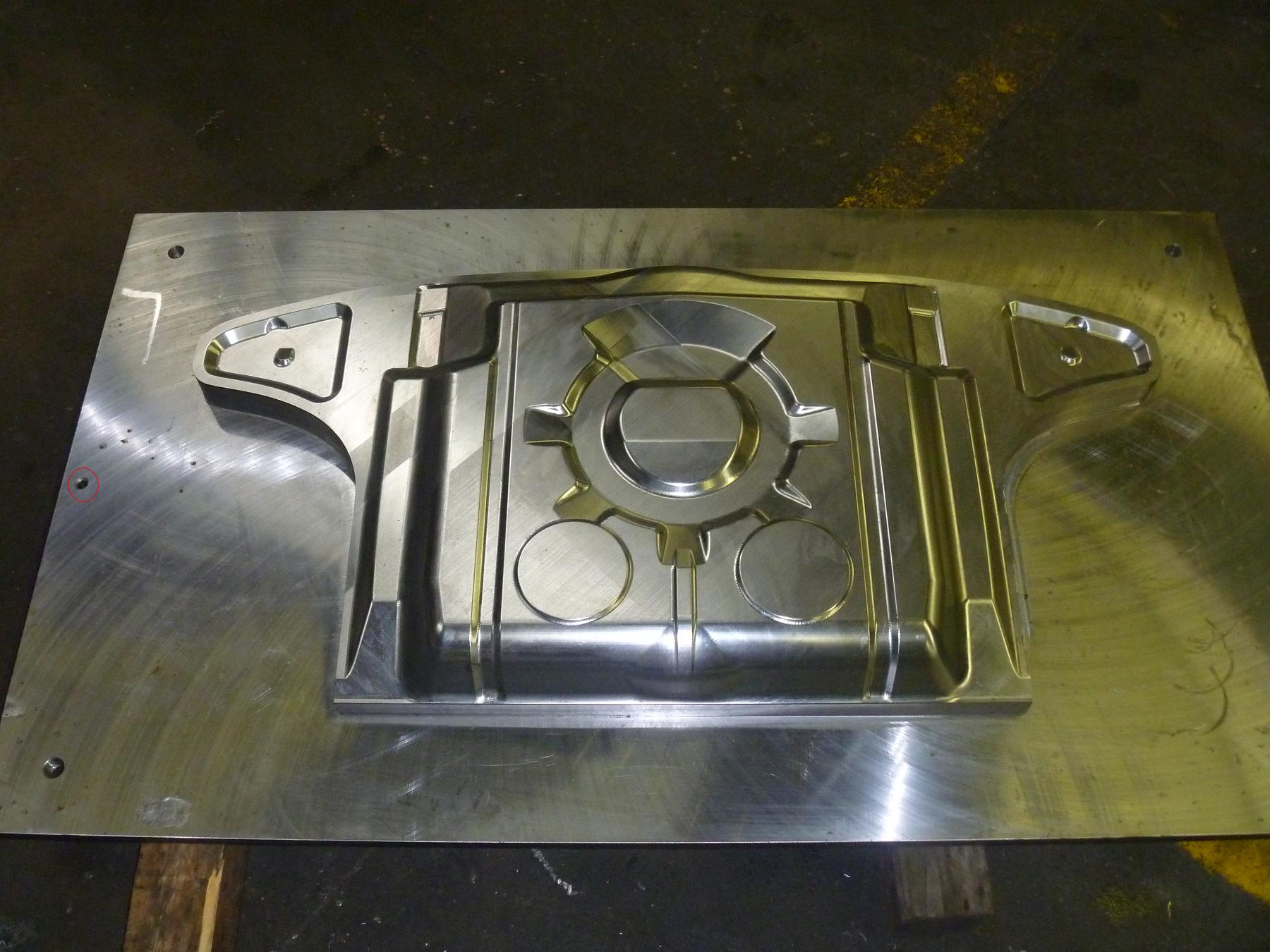 The male half is done now, and I am starting the prep work for the female side. In total the finishing bit ran for about 280 hours. I had to take two passes because about every 24hours I had to change the carbide insert. After putting in a new carbide, the height difference would be .003-.005 of an inch. After the final bit was finished, I drilled and reamed a hole through the mounting plate into the top of the table(circled in red). The reason I had to do this is because I machined all the way around the die and there were no flat edges to pick up off of if I ever wanted to put the die bad onto the mill for any reason. I then recorded the machine coordinates on the mounting plate to ensure the datum point is in the exact same location every time. Now I still have to polish this die, which will most likely take a full two weeks. |
