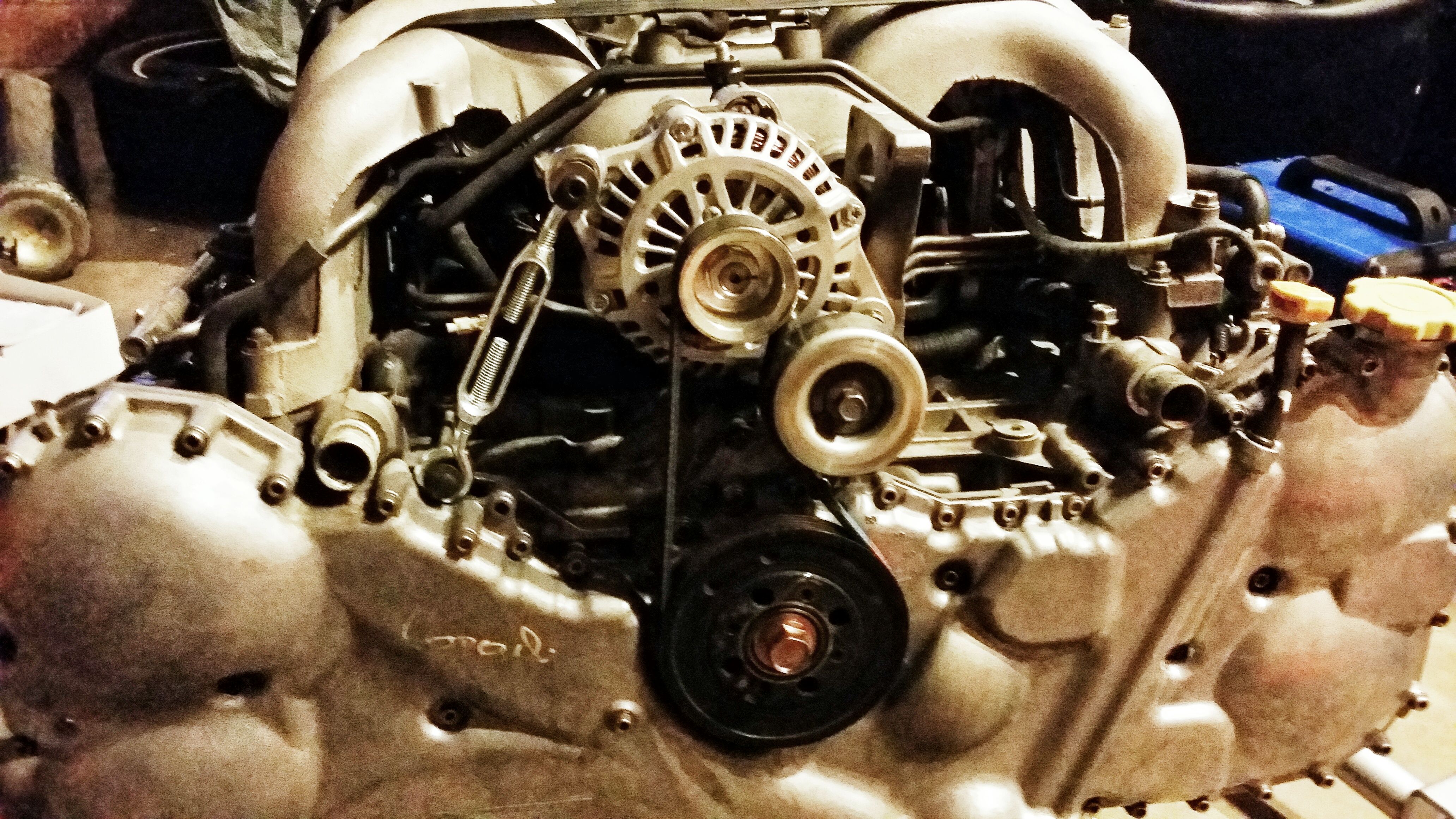 I also got the turnbuckle belt tensioner working. I tested the fit tonight, tomorrow I'll cut off the eye loops and weld on flat brackets in their place. It should work with cars running AC too, just a slightly different belt routing. |