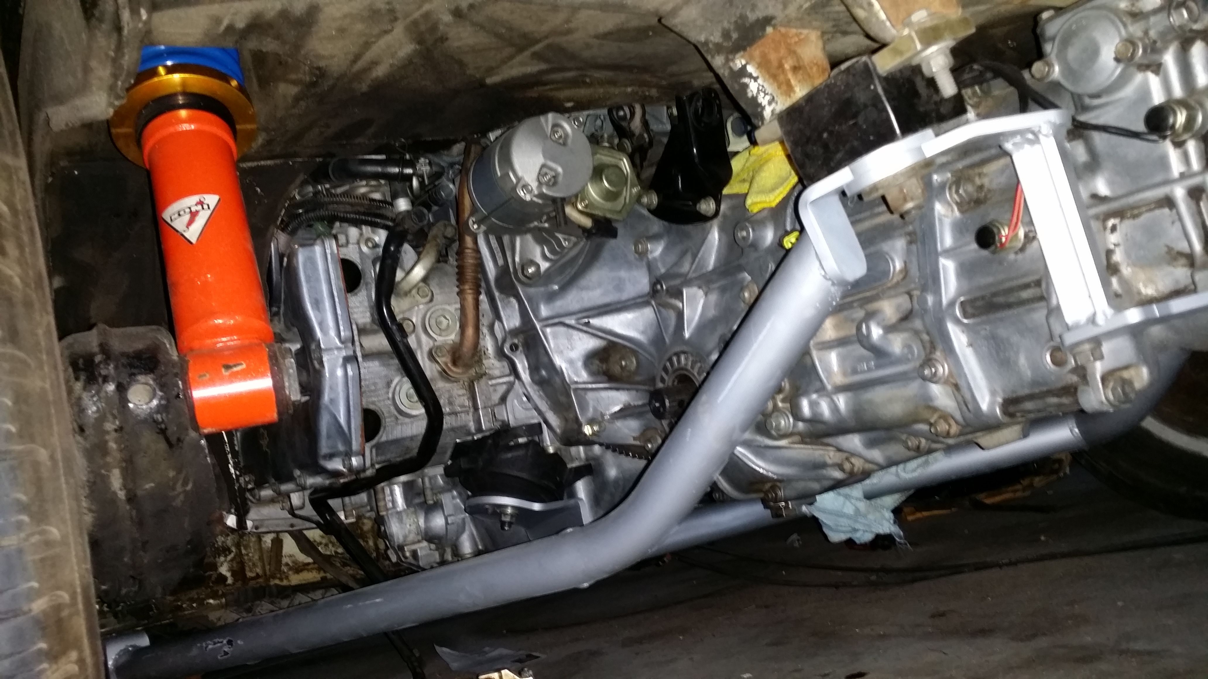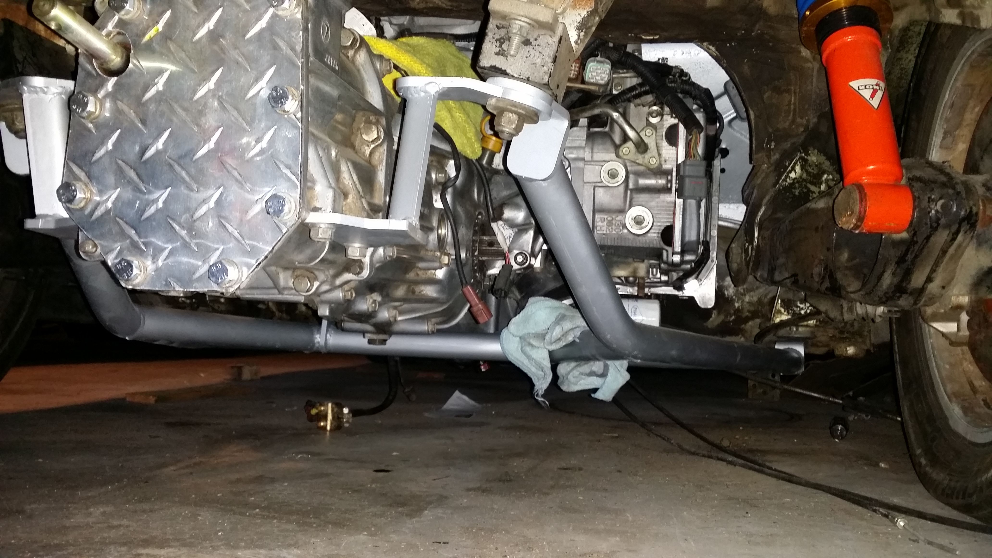 I finally got the engine in! No clearance issues to speak of as far as fit goes. I'll have to cut some space for the intake, and likely a bit of the top of the cable clutch fork, but the engine is in! Only 4 inches of ground clearance though, and even less once the exhaust is hung below it.