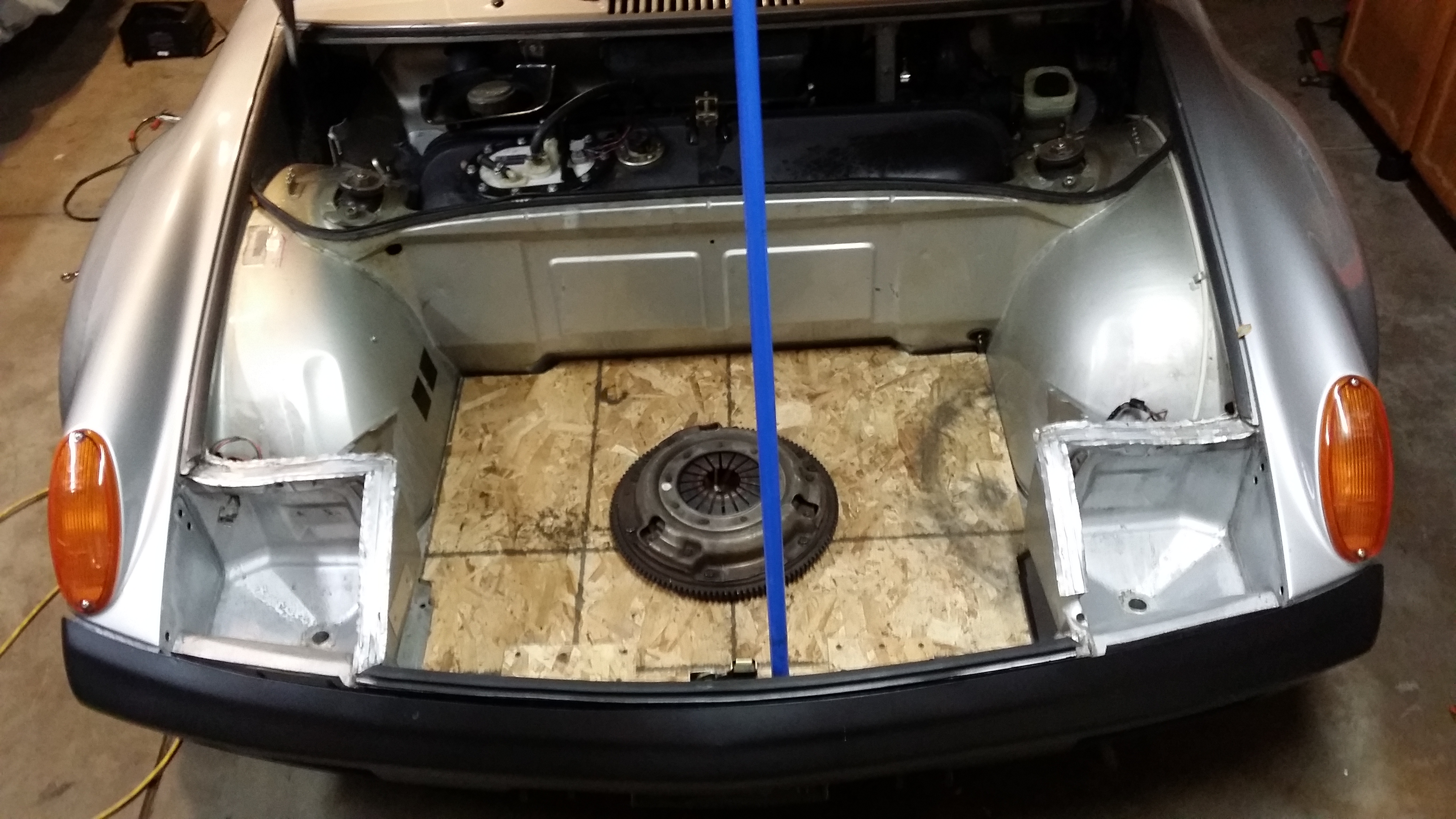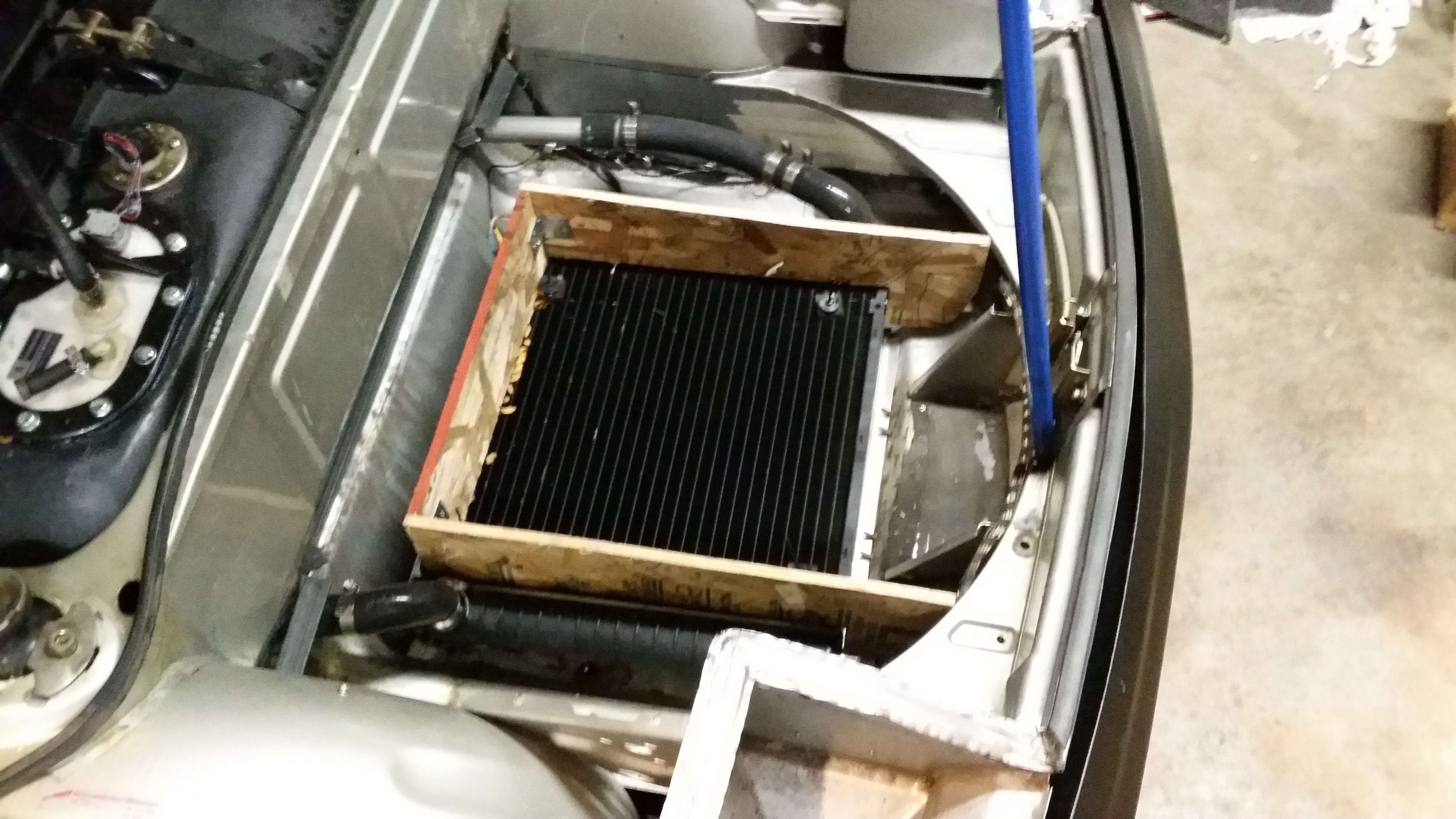 I'm also mocking up my plans for conserving the front trunk cargo area and test driving as much as possible to look at its effect on cooling. So far it seems to work well enough! The flywheel is screwed down as a weight to hold the board in place. Attached thumbnail(s) |