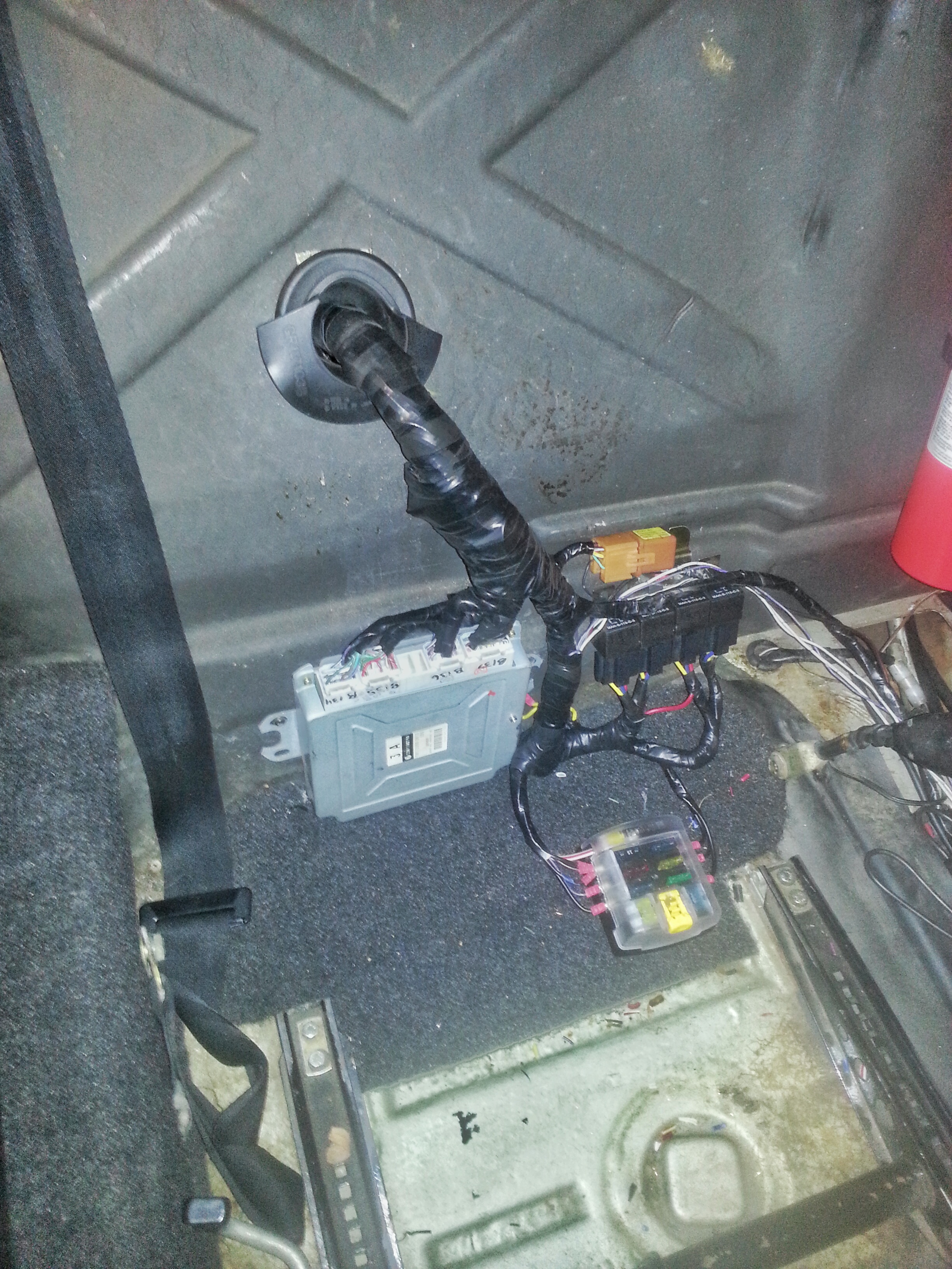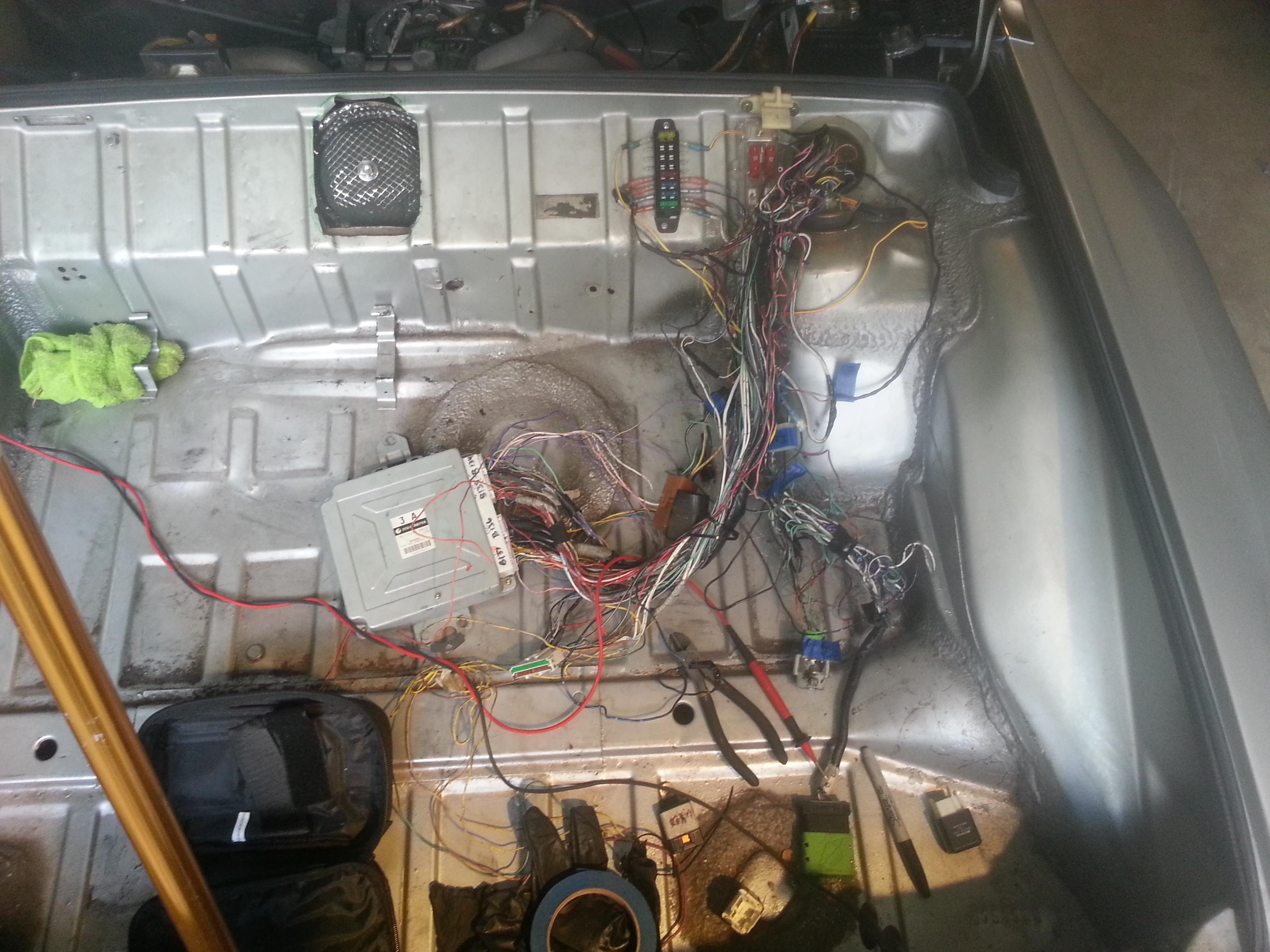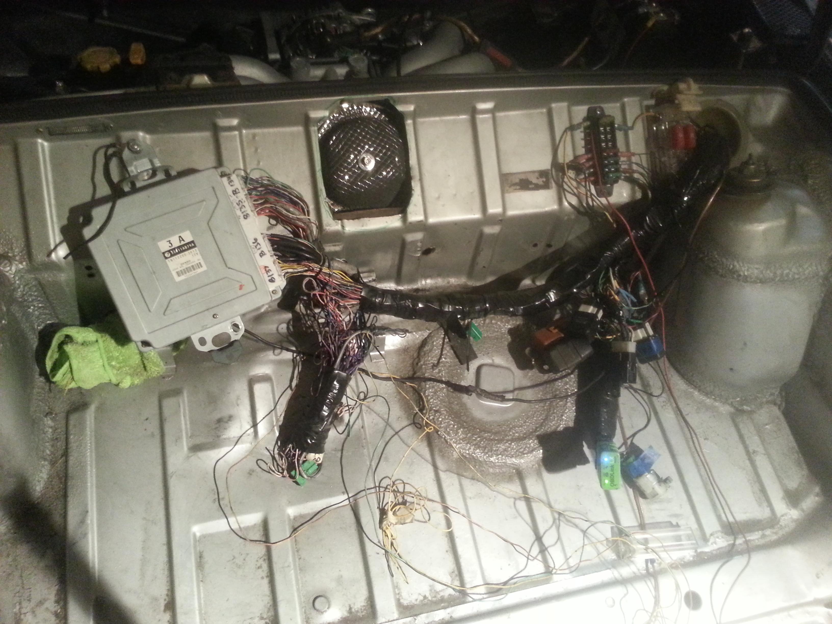 Ive been driving the car quite a bit since my last update. My plan with the car has always been to maximize driving time and minimize time on jackstands. With that in mind i did a lot of things "good enough" during the initial build. Now that its been two years without serious mishap im going to start refining things a bit. Below is a list of pet peeves on my project im going to work out! Cooling system barely adequate Cable clutch gives poor pedal feel No heat Intake extends into the rear trunk No flip up headlights No trunk supports Sloppy ecu wiring (temporary wiring) I started earlier this week rerouting and reorganizing the wiring harness to get it out of the trunk. It's till not quite done, but I dont want to finish it until i figure out where to hard mount the obdII port! Attached thumbnail(s) |