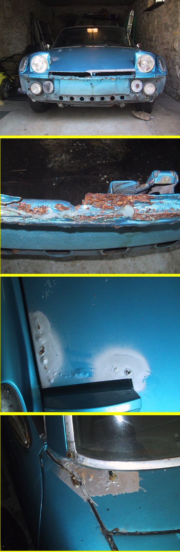 I am trying to get the car to be rust-free, but it is going to be a weekly driver car, not a show car. I will want it to look nice, though. So is it a crime to save money by doing some fiberglass/bondo repairs on my own for areas that really aren't structural at all? I will have a body shop do anything important, of course. I have attached a picture (of course). I will be removing everything from the car on my own, so I'll post pics and ask questions as I get to them. Pic 1 shows that car looks decent from afar. no major damage Pic 2 shows the rust where the hood seal goes. This is pretty bad. I can get it all out of there, but how do you fix that? Inexpensively... without welding on a whole new front? Can I do something with a f/g hood? I plan to replace the whole front hood (and rear probably) anyway. Pic 3 shows why I plan to replace the hood. There's plenty more of that kind of thing Pic 4 shows some troublesome rusting. It's not bad on the underside of this, though (I looked inside the fender and such). But, what can I do to fix it (again, inexpensively). I imagine the rain channel in there is necessary. I plan to get an air-compressor and some air tools, so any recommendations on that is great as well. I've been watching the rustoration thread and i would like to get a similar tool to his grinder with that kickin' brush thing! Where could I locate? Again, I need to keep this reasonable in cost. The idea is I WANT to do as much as I can on my own. I like working on the car. I will turn it over to a professional as soon as welding is involved, though. I can f/g and filler alright, though. Attached thumbnail(s)