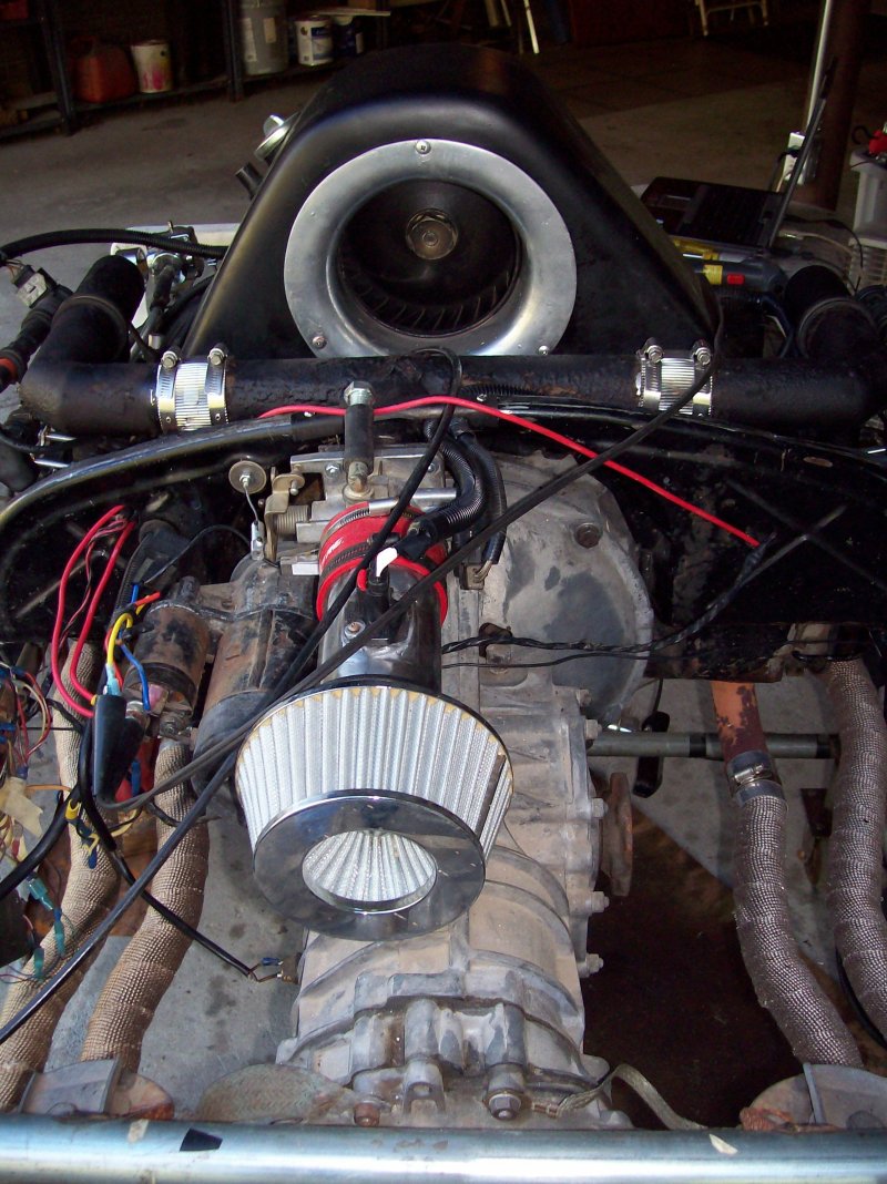 ![]() The engine is a 1911 I built to run D-Jet injection, originally intended for a customer's car, but he abandoned his project and left everything to me several years ago. I was running it with Dual Delortos with SSI HE's and a Tangerine IV muffler. It was my cold weather engine. The purpose of the current project was to develop an inexpensive FI setup which accomodates my horizontal cooling system. Stock type plenum systems won't fit over the flat fan. Systems which use ITBs generally aren't inexpensive, and are better suited to larger displacement, higher performance engines. Over the years I've collected a good selection of DJet hardware, both 1.7 and 2.0, so that seemed like the best place to start. So far I've only spent about $100, that's counting the small assortment of overstock materials and scraps already on hand at CFR. The only new purchases were the two silicone intake boots which connect the intake duct to the TBs. ![]() The injection system is all 914 DJet: Two 1.7L throttle bodies are mounted on separate tubular plenums, fabricated from the flange end of stock 1.7 intake runners and throttle body mounts from stock 1.7 plenums. The injectors are from a 2.0. The MPS is an AA special 2 liter unit, purchased in 1994 for my ITB race car. The ECU is a '73 2 liter unit. The air filter box is a modified 2 liter unit with a cold air intake inside the left rear fender well. The AAR is from a 1.7L. There is no decel valve or cold start valve. There's a balance tube between the two plenums - with take-offs for the MPS and the AAR. The TPS is on one of the TBs. The distributor vacuum advance and retard are connected to one of the TBs. ![]() I've already driven the car with K&N air filters mounted directly on the TBs. It runs great, but was rather loud right behind my head. Based on my A/F monitor, the mixture is almost perfect already. It idles smoothly at 850 rpm. The range of the idle mixture knob on the ECU allows me to set the idle too rich, too lean, or just right. We had to make special idle adjustment screws for the TBs to make the bypass hole smaller than normal, since each TB only feeds two cylinders. ![]() The relay board was moved up and back to accomodate the airbox. The airbox will be powdercoated now that the installation is finalized. I have a little more hose and wiring cleanup to do, but the wiring harness is totally stock, just routed a little differently across the engine. We did the install initially without surround tin, but the engine runs hotter than I like when it sits in traffic. Adding the tin is tomorrow's project. |