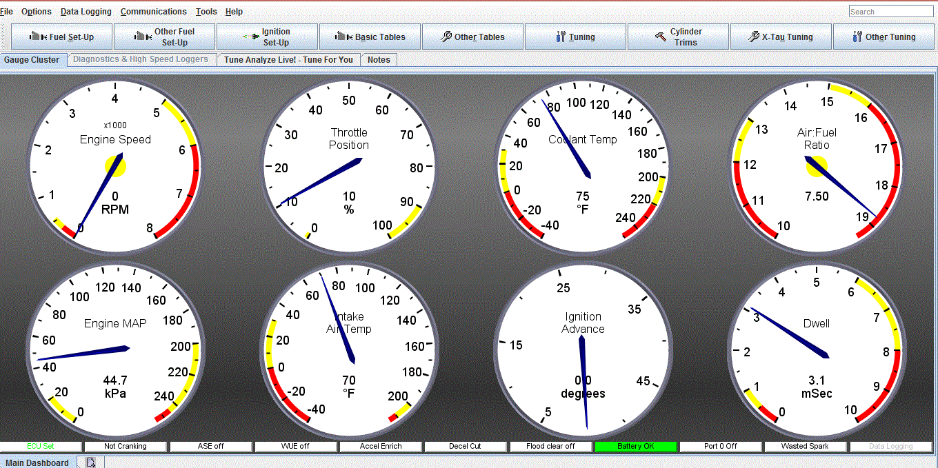 Sensors are calibrated and seem to be working correctly. I did run into a hiccup trying to update the ECU to the latest firmware. The installer would not install the firmware. More investigation is required, but I followed the printed firmware updater instructions to the letter. Push comes to shove, I just run with the current installed firmware, which is 1 rev behind (for now). Next step is fuel, and make sure my fuel system does not leak when pressurized. You will note there is a "coolant temp" gauge. That is actually the head temp at the stock location (as opposed to under a spark plug). I have an under the spark plug CHT for the gauge in the car, giving reading for Cyl 3. Eventually I will install the 4 way. But first things first.... I also learned today that my throttle sticks open a little. There is something it grabs on before it gets fully closed. Thats why in the screen shot its reading at 10% open instead of fully closed. I still have a few mysteries to work out with the spark tables. I set the offset to 295 degrees per Mark's instructions, but did not see where to set the initial cranking advance to 12 degrees. Still in the steep part of the learning curve for this software. Zach |