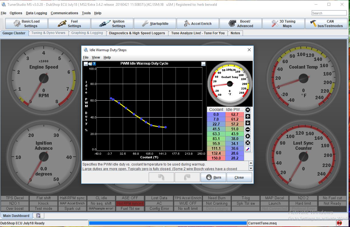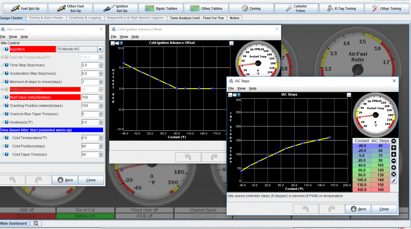 Second, 15-Minute Warmup is for stepper IAC valves. Set Idle Control Algorithm to 'PWM Warmup'. PWM Frequency is one of those settings that will be different for different valves. I don't know what this setting should be yet. I suspect that a high number (too frequent) will make the valve not close all the way, and a low number (too sporadic) will make the valve not open all the way. Start Value should be the number that makes the valve open completely. You should be able to check this visually. Turn the key on and it should default to this Start Value, if you look and it's not open all the way, you need a bigger number OR a higher frequency. **(You can probably use this setting to test the closing efficacy as well by setting start value to 0 and seeing if the valve closes completely when you turn the key on). Cranking Position sets the minimum open position while cranking. I suspect this relates mostly to hot start conditions where you don't want to be cranking with the valve completely open. So I would plan on fiddling with this number once you've got the other settings and cold-start dialed in. Crank-to-Run Taper is the amount of time that the ECU will blend/transition from the cranking value to the HeadTemp based value. If, after starting, the idle is 'high for too long', this would be the setting the fiddle with. **You might be able to set this to 0 or 1 and then extend it as you see fit, if you really want to get it perfect. I think you can figure out the rest from there... Note: this post is based on my reading and general understanding of what's going on. I haven't gone through this process myself yet. So these are not answers just best guesses. |