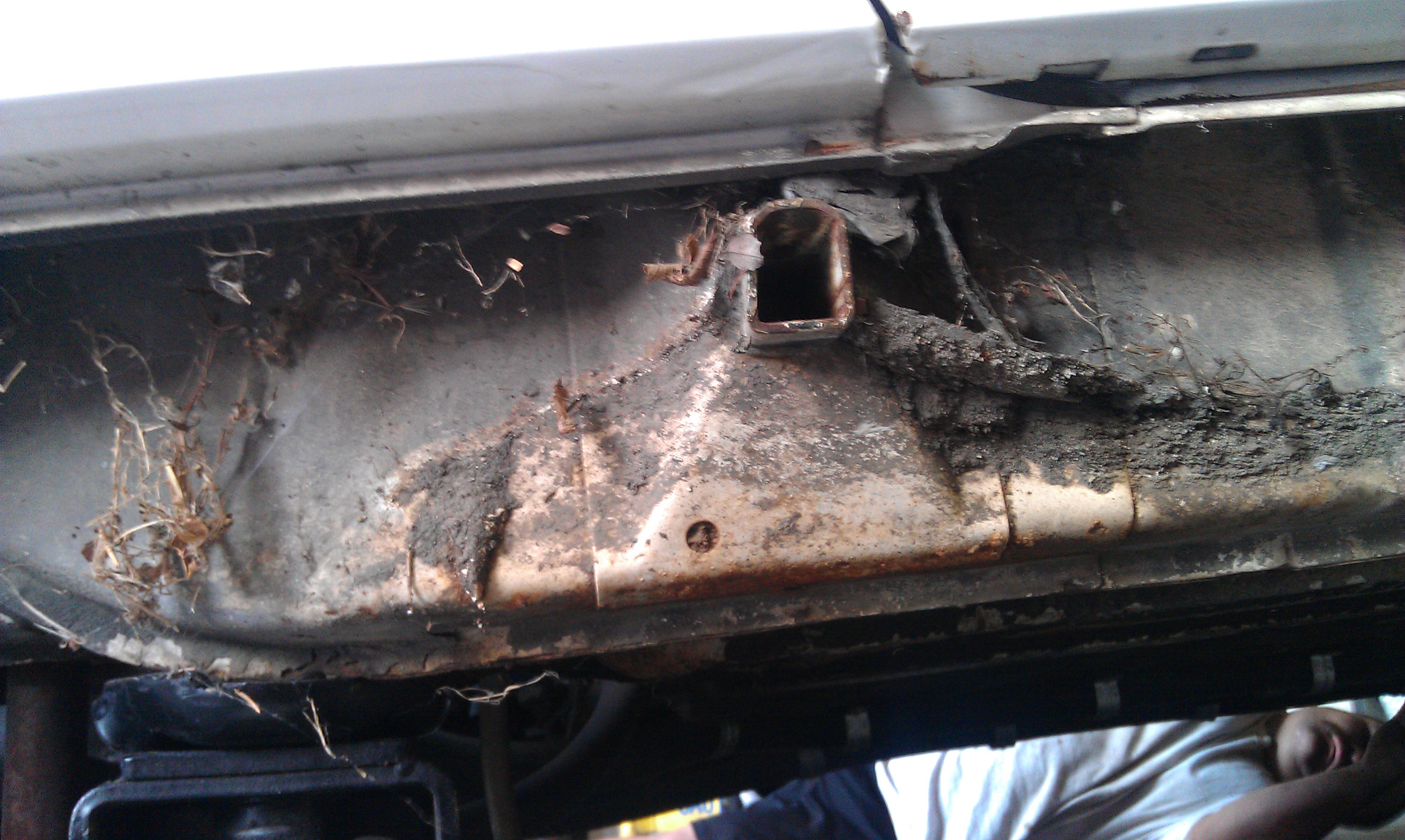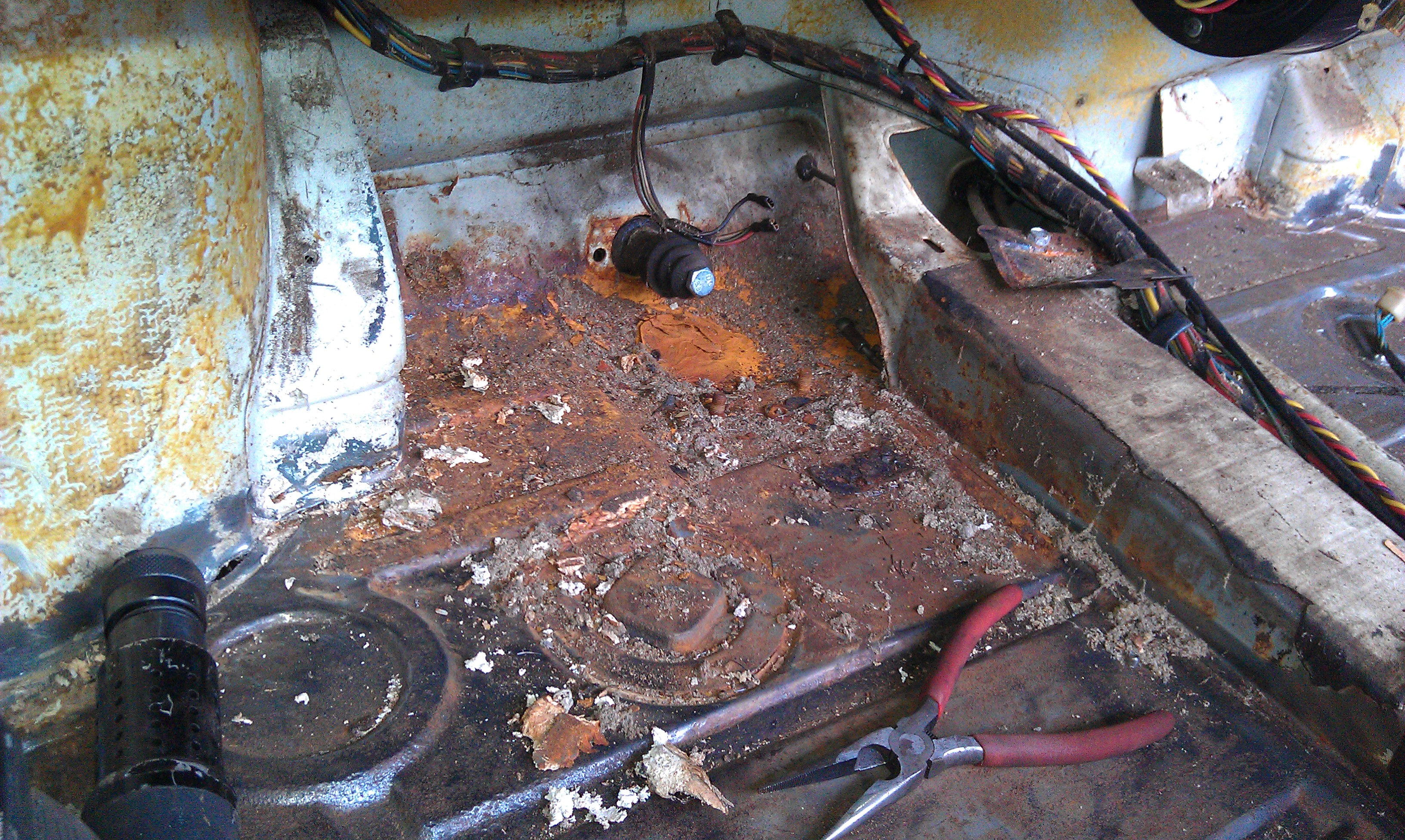 A little history: I bought the 1975 2.0 in 1988 as my daily driver. Drove it like I stole it (IMG:style_emoticons/default/driving.gif) for a few years until I could hear the rods starting to loosen up. Started pricing stock rebuilds and was trying to figure out how to make that work on my late 20's single guy budget. I read an article about Renegade in VW/Porsche and realized that I drove within a mile of their Santa Fe Springs shop every day on my commute. I stopped in and went for a ride in their 500hp shop car. I got back in my car and floored it on the way up the freeway on ramp. Right then, my car's fate was sealed. I scraped together the cash for their basic conversion kit with cooling (nothing like the product that they sell now). Three years went by and I was able to make the car barely operational, but my fabrication skills weren't up to snuff and I started spending my time screwing around with electric car conversions (including a 914 conversion). Fast forward to 2004. I'm now married and have a better job. The wife suggests that I need to "make it go or make it gone." It makes sense. I send the car to Renegade's new shop in Las Vegas (new owners too). The old cooling system has rotted away in the mean time and the new system is much more effective. I go with their new cooling system, their trans, new adapter and clutch package, build a new 327 with aluminum heads, a 911 front end, convert to 5 lug rears, get a set of 6x15 fuchs, etc. etc. The car comes back in a month and costs a small fortune. The car drives great, but I immediately start thinking about what's next. The gearing is great, but as a 4 speed, it always feels like it needs one more gear for freeway cruising. I eventually find a 915 gearbox with 3:10 R&P. I had it flipped with new gears, reinforcements and LSD. The new box has the same gearing in the first 4 gears as the Renegade box with an extra overdrive that drop the 70mph rpm to about 2100. I keep an eye out for other deals and find a set of steel flares (probably from the original group buy), a set of 7" and 9" Fuchs 16's, MAF fuel injection for the V8 and a bunch of other small parts. The pile of "upgrades" slowly grows over the years. Fast forward to 2011. At some point, I need to empty the 16' box trailer in the driveway to move my 1916 Model T. I haul out an amazing hoard of 914 goodies. Why is all this stuff in a trailer and not in the 914? I need to get off my butt again... Last week I delivered the car to Sean at SD Autosports in San Diego. There's been a few leaks in the last couple of years and I infested rust into a relatively rust free car (IMG:style_emoticons/default/slap.gif) . The pics are: under the driver's seat, under the passenger seat, and the same area before removing the tar. I thought that the passenger side looked OK, but it appears much worse once the tar was removed. It's actually not as bad as it looks, wirebrushing, rust treatment and new paint and that area will be good to go. The driver's side might need some new metal... Attached image(s)