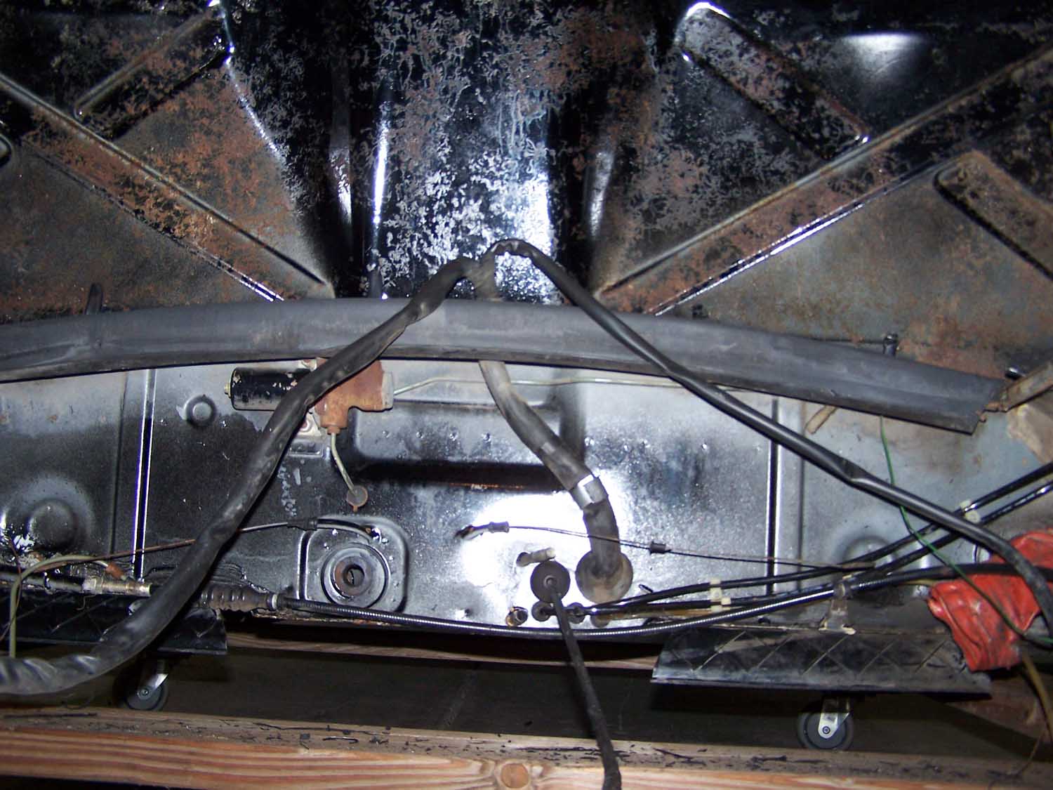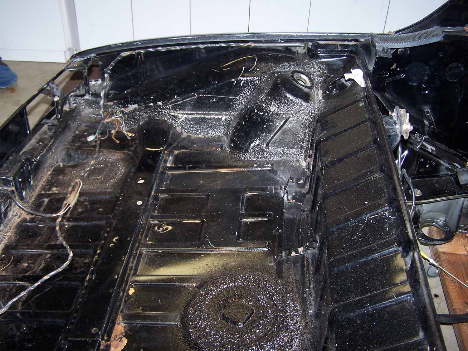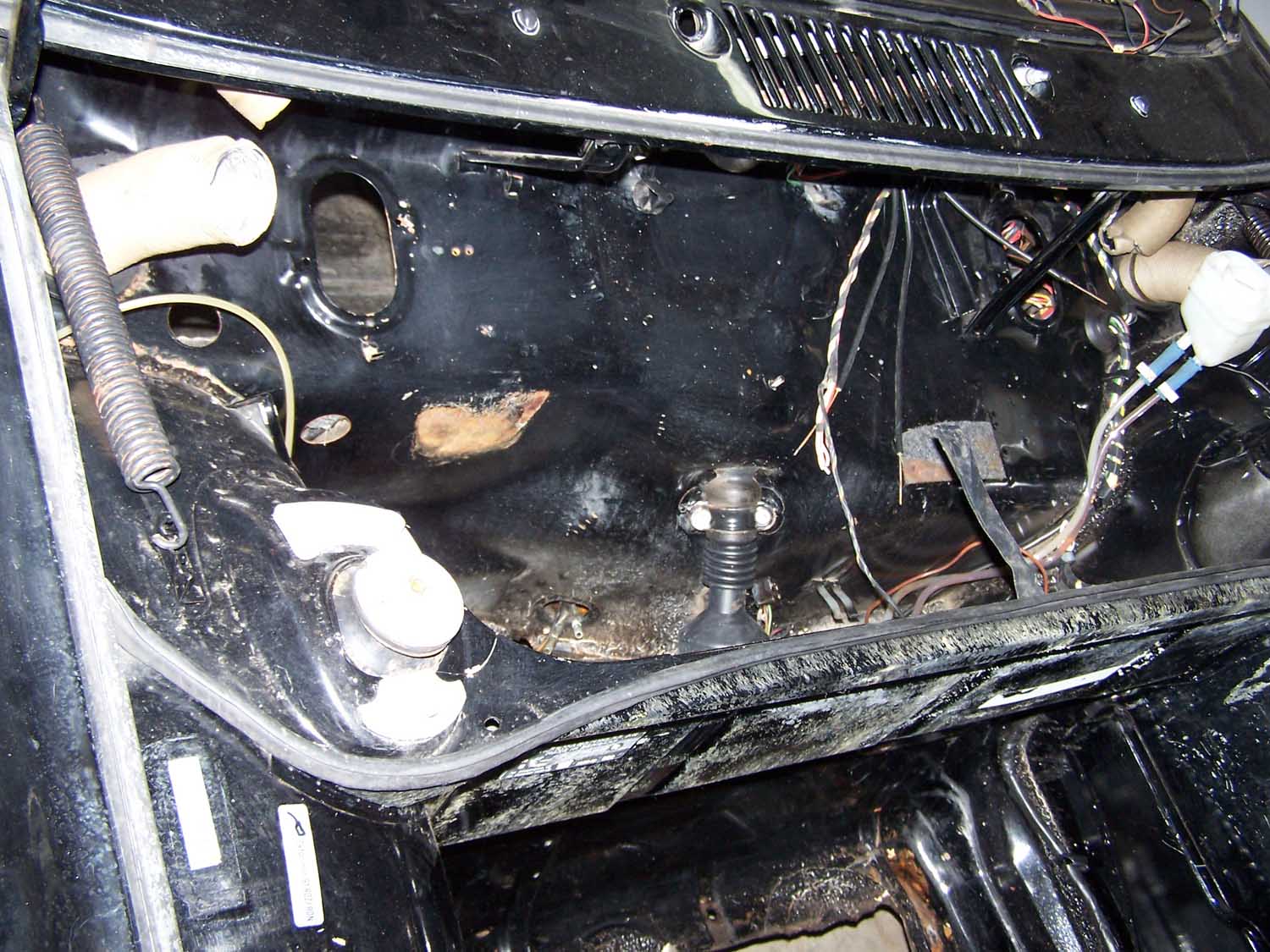 QUOTE looks like the new tub used to be yellow That yellow is the color of the original dash! I have heard that they used to use what parts they had left at the end of the previous model year first. The car is black with a black paint code and has only had a light second coat put over the original paint! It is one of the cleaner bare tubs I have seen! It has a small amount of rust in the drivers rear floor because the PO added a trunk pull and cut a large hole in the firewall for the water to flow right in! I can see no evidance that the car has ever been in an accedent! |