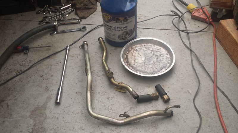 Pulled the thermostat, cooked it and it popped just fine. Had to drop the motor to pull the water pump, which was fine. (IMG:http://www.914world.com/bbs2/uploads_offsite/live.staticflickr.com-431-1559378361.1.jpg) Found the problem with crud buildup in these 2 pipes. One is the heater return, the other is the radiator bypass, which is how the coolant flows when the thermostat is closed. Capped the end, filled with Purple Stuff and left it overnight. Dumped it in the pan and created a chemistry experiment. (IMG:style_emoticons/default/huh.gif) (IMG:http://www.914world.com/bbs2/uploads_offsite/live.staticflickr.com-431-1559378361.2.jpg) Did it proper this time and filled with toxic masculinity (blue) (IMG:style_emoticons/default/laugh.gif) Discovered the new system capacity with the Celica Performance rad and heater core in the fresh air box is nearly 3 gallons. Took 10 top-offs to get it burped. (IMG:http://www.914world.com/bbs2/uploads_offsite/live.staticflickr.com-431-1559378362.3.jpg) (IMG:http://www.914world.com/bbs2/uploads_offsite/live.staticflickr.com-431-1559378362.4.jpg) Then I had a problem with the fans going haywire... cause I didn't get the ECT sender connector snapped in all the way (IMG:style_emoticons/default/headbang.gif) Also had to replace the gauge temp sender as it was reading low. Whinebro fuel pump is still annoyingly loud though it did get quiet for a moment, plus it gets really hot, so to be safe I ordered a Bosch unit off Amazon which should be here Sunday (IMG:style_emoticons/default/piratenanner.gif) Made an appointment at the DMV for Wed. Quick spreadsheeting puts the Ins valuation at $20k. So close yet again.... |
