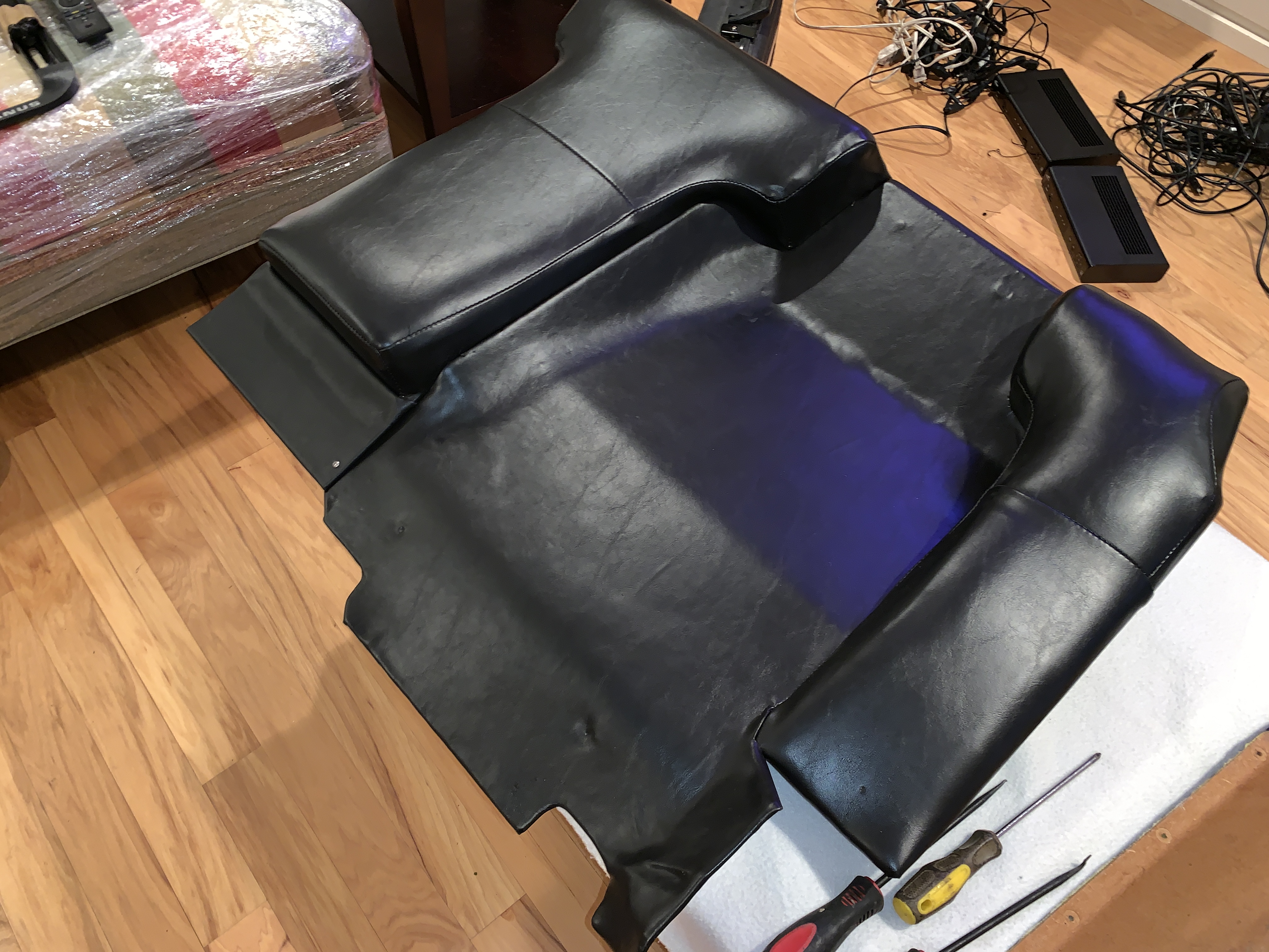 Well since it’s after midnight it was yesterday but I got my backpads back today, my friend Jim knows a guy that does automotive and marine upholstery, and dropped off my original back pad pieces and the material from I 914rubber kit I actually got second hand. Anyway started putting the 3 pieces together and hope to put this in the car tomorrow!