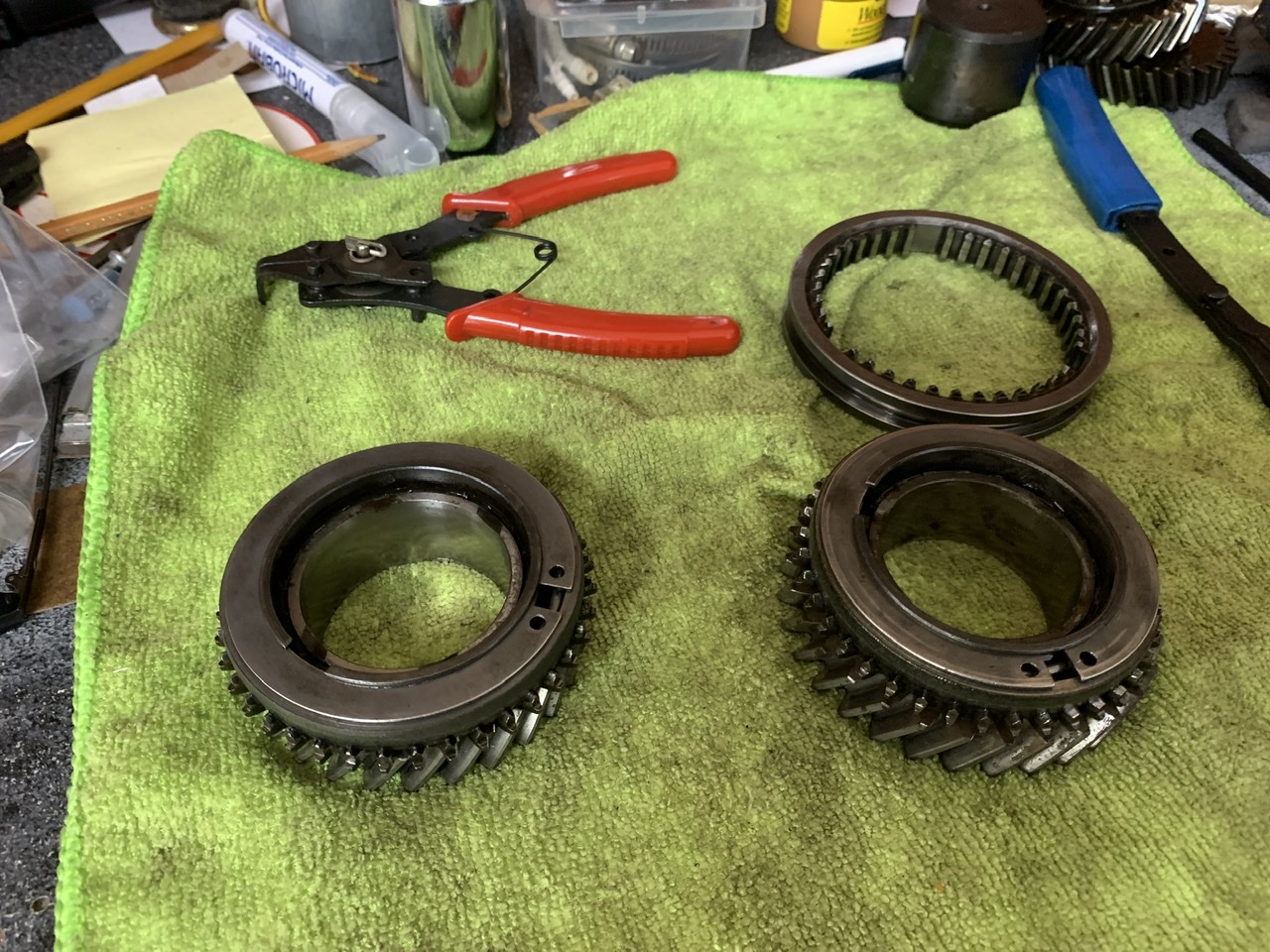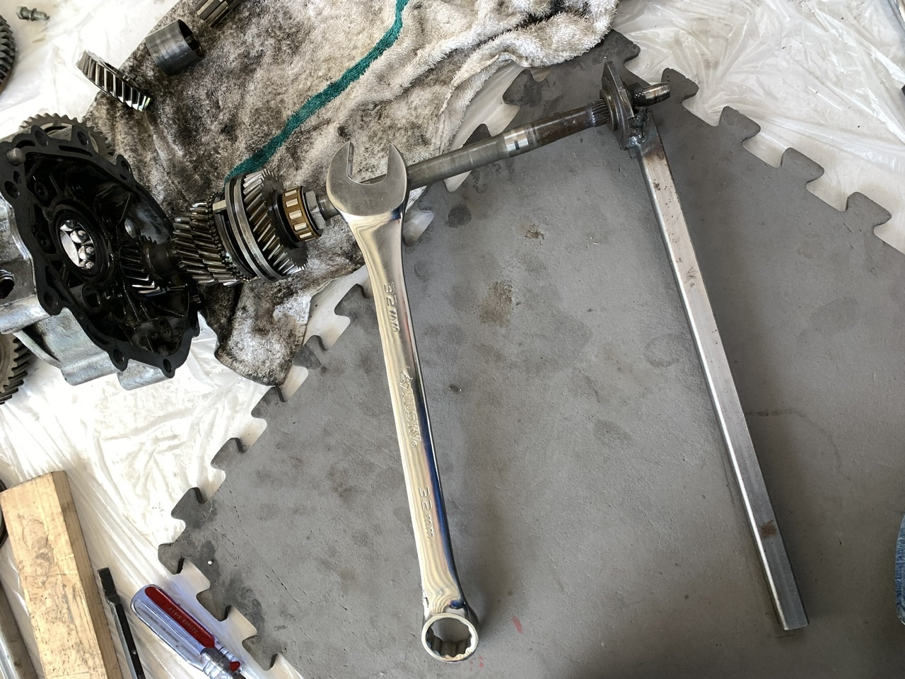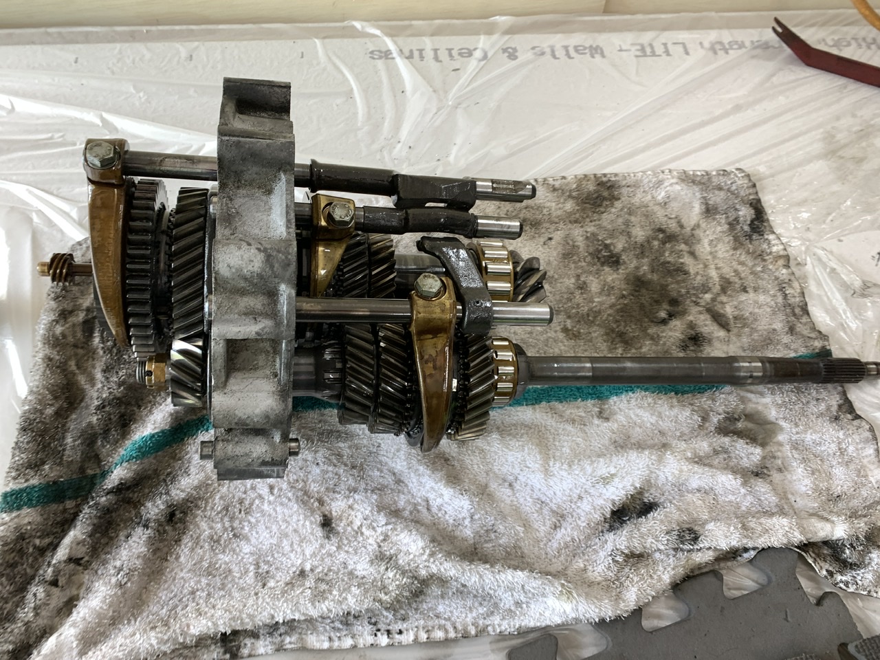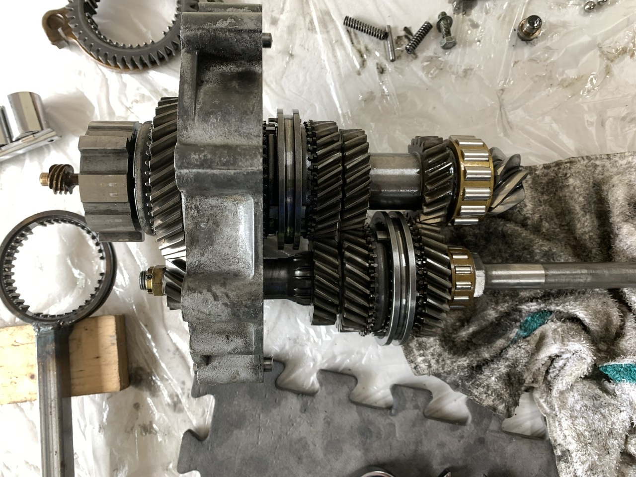 past two days, busy with other stuff, but pulled trans yesterday ,found a cracked transmission/muffler hanger ear , today i got the gear stack pulled and got the original 4&5 back in. i knew i needed a better 4th for the mountains and the 5ths was soo tall it was bad for cooling, great for highway miles. i considered making 4.th a W rather than V, but just KISS put it back to OEM.