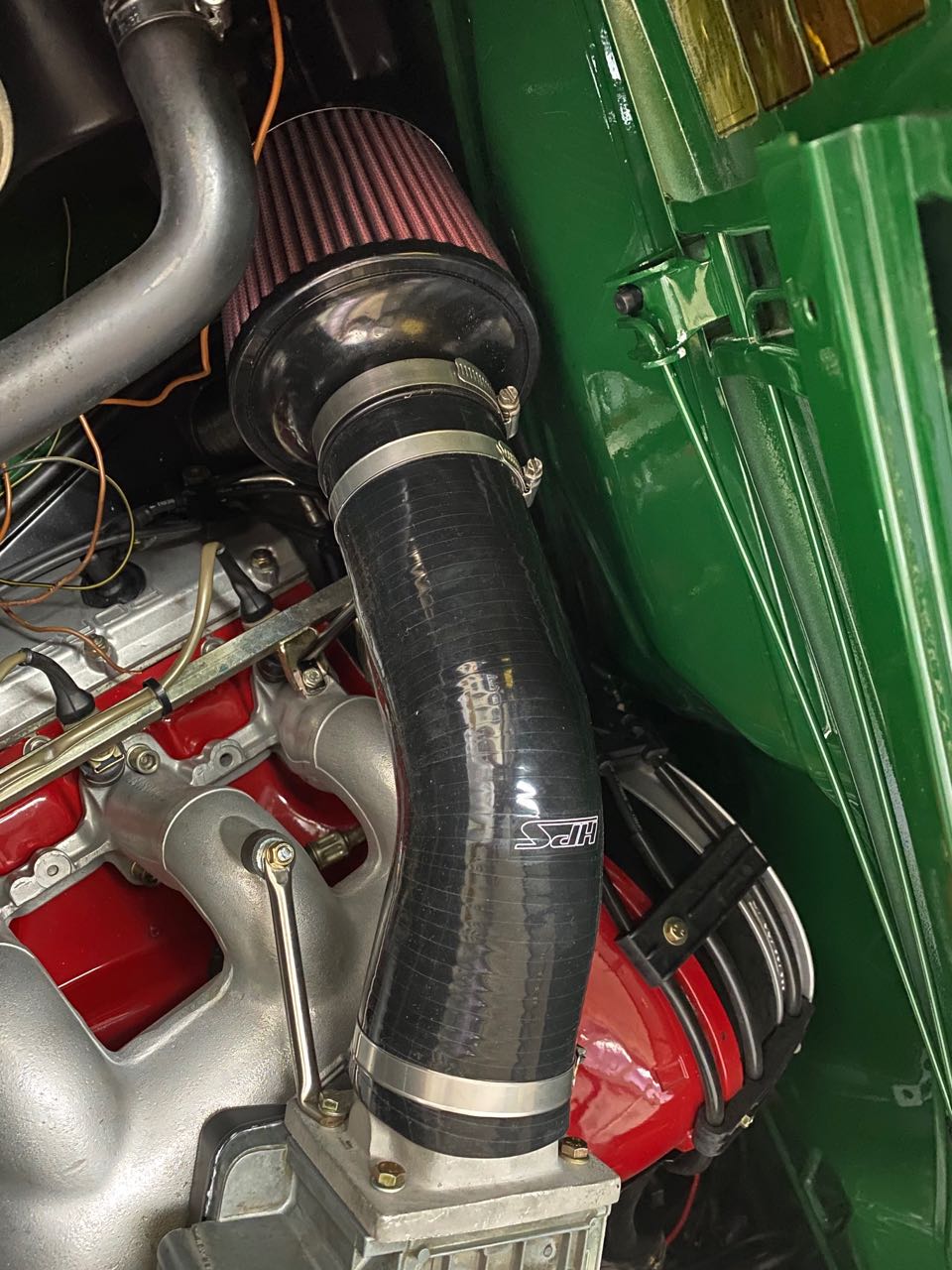 My brother and I spent 2 days (yeah, we are slow at this stuff) fabbing up the mounts and pipe to install the NOS 3.2 airbox I bought. I am very happy with the fit and location. My next evolution is to send out a piece of SS 3" pipe, modified just like the 3" aluminum piece currently installed, to have it powder coated satin black. I think that will look more proper in place. Attached thumbnail(s) |