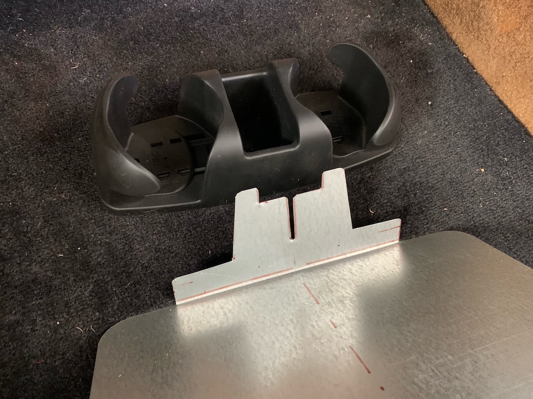 I found this adjustable/locking 2-drink unit by Spill-master (at O'Reilly's) and cut up a piece of zinc-coated sheetmetal to hold it in place: The vertical part of the bracket fits into the underside of the holder: Just enough room for the carpet/mat to hold it in place: Bracket goes under the mat: And the holder goes onto the bracket: et voila! ("and walla!") (IMG:style_emoticons/default/biggrin.gif) The base of the bracket (the part covered by the mat) is 9x12-inch, so I don't think it's going anywhere...and I can always take it out if I decide to get a little crazy G-wise. I used the remaining piece of sheetmetal to make a 2nd version of the bracket with a longer/taller vertical part; it allows the cup holder to sit on the center tunnel instead of the floor: The holder seems a little less steady there, so I've decided this version is going into my old Volvo wagon instead... (IMG:style_emoticons/default/dry.gif) |