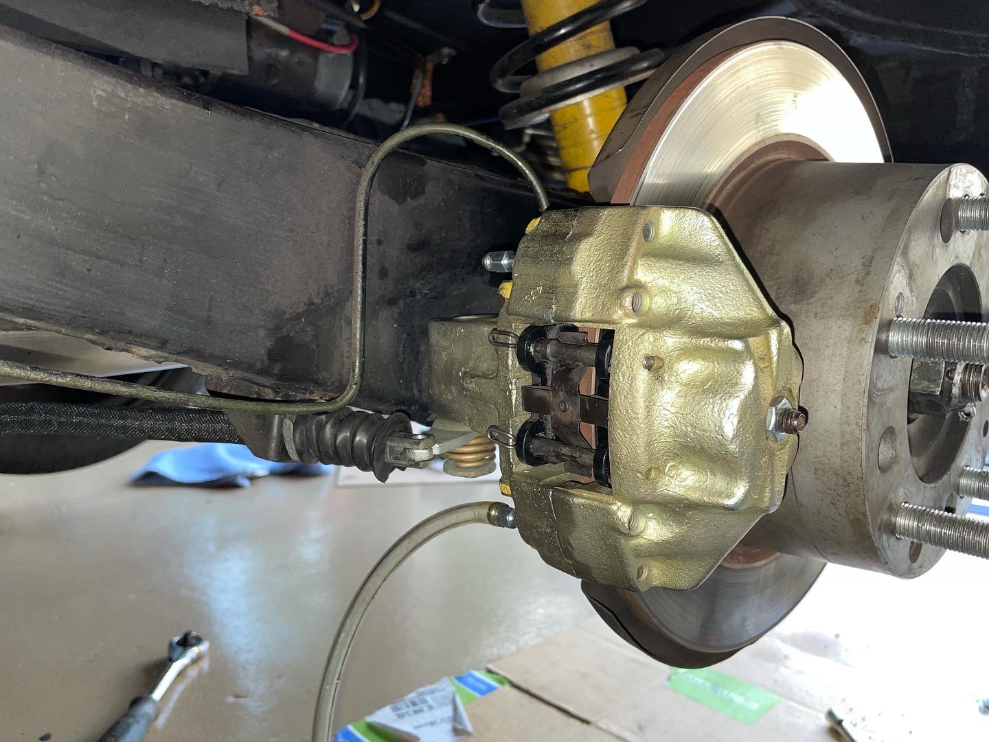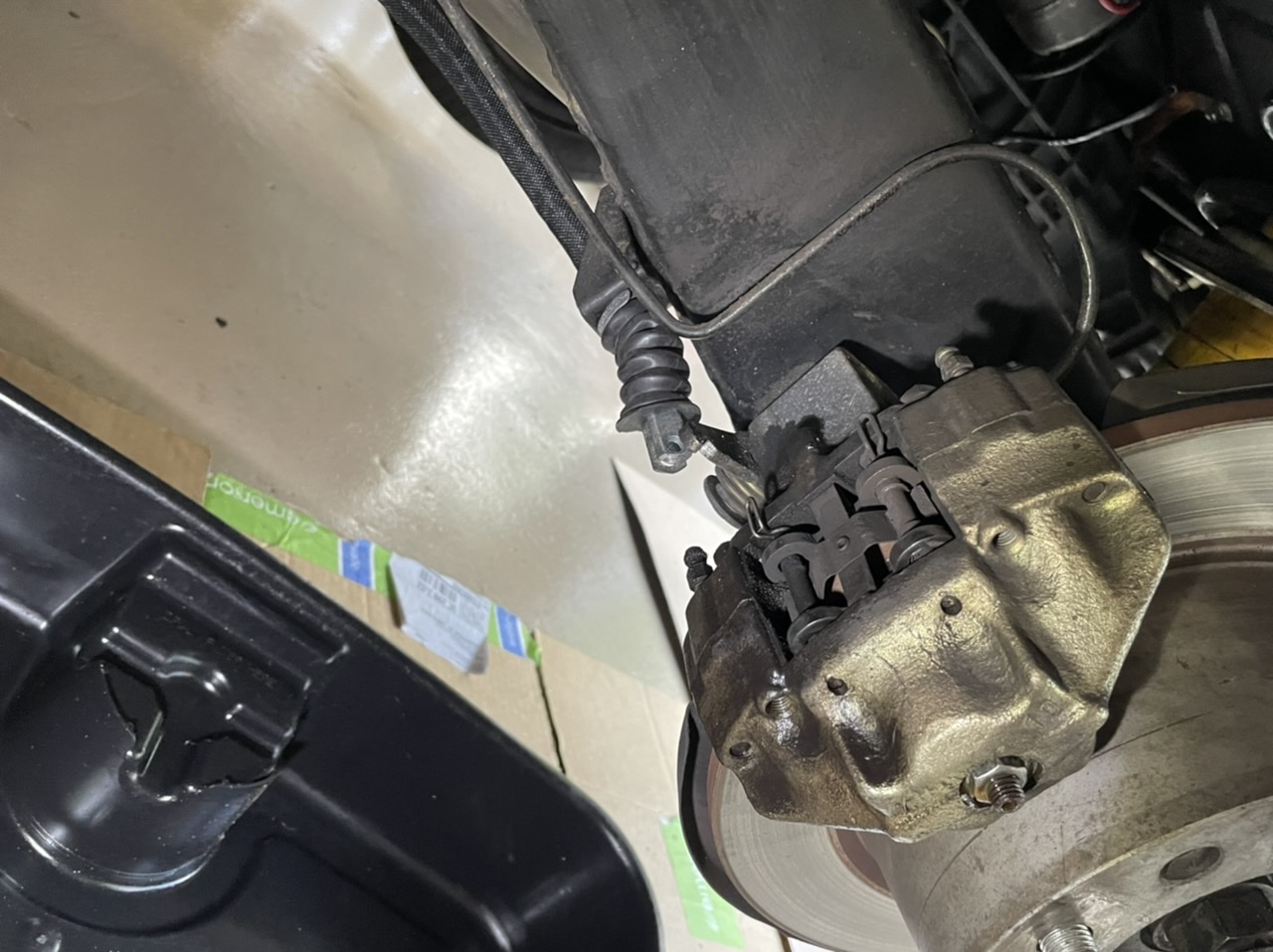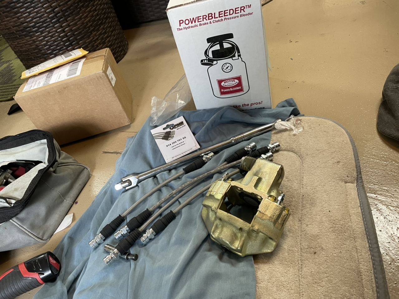 leaking rear caliper so time for swapping this out and new soft lines i’ve had since Eric offered the group buy on them, got a Motiv power bleeder, hope that helps, i did this yesterday and then standard pump and bleed method and still had a slight soft feel so will go thru the whole system tonight not just the one side, but new pads lines an calipers cleans it up hard to believe i did those lines and calipers 8 years ago!