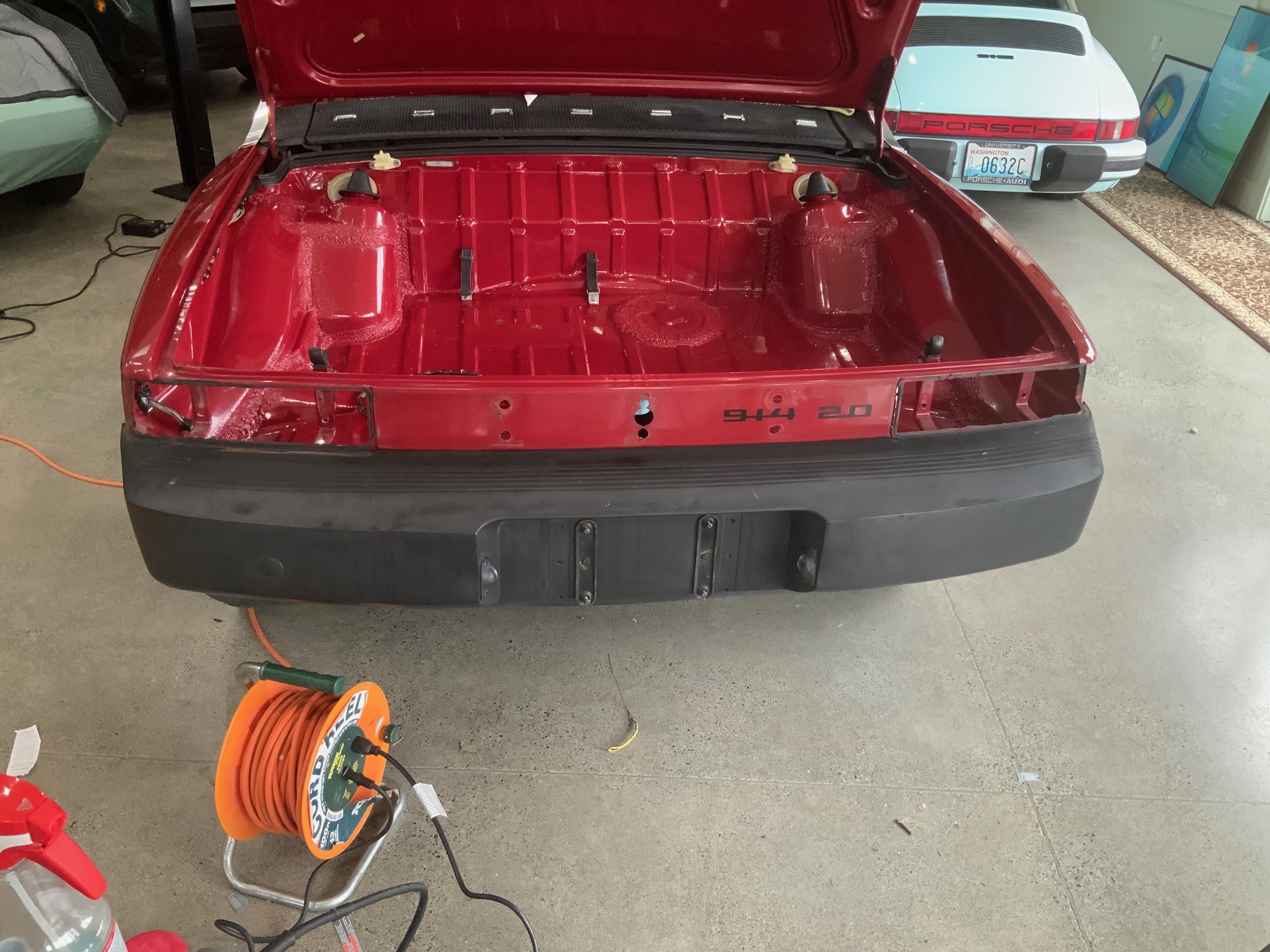 Took the 80’s Porsche plaque off the back and was surprised to find the emblems (IMG:style_emoticons/default/smile.gif). PO used black silicon to stop the taillight water leaks.. also did the fronts!… luckily I have a full NOS set of lights for the car. Looks like some welding and painting to fix this egregiousness!! Going to pull the bumper (IMG:style_emoticons/default/smile.gif)