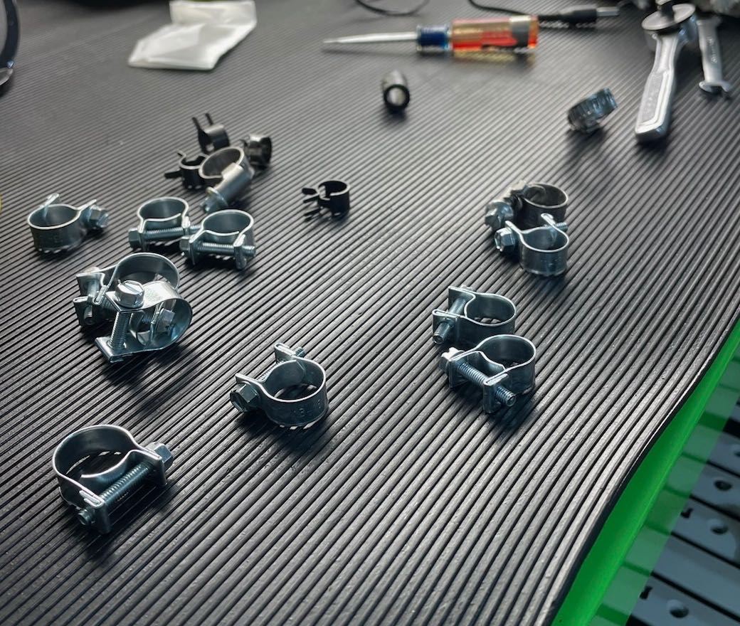 Took it out for a spin last week and upon returning had the odor of gasoline. Now for you guys running carbs, that is normal. My car is Motronic injection and never has a gas smell. Today I popped the engine lid open and had my brother fire her up while I stood on the passenger side looking at where my fuel lines are and immediately spotted a leak coming from one of the lines that had been installed using a typical hose clamp and not a FI hose clamp. Went to the local FLAPS and bought a couple different types of FI hose clamps and returned. I removed the 3 wrong clamps, trimmed the end off the one hose about 1/2" and installed the hose with the new clamps and fired her up- problem solved. I let it run for about 10 minutes and monitored it and dry as a bone and no gas smell.