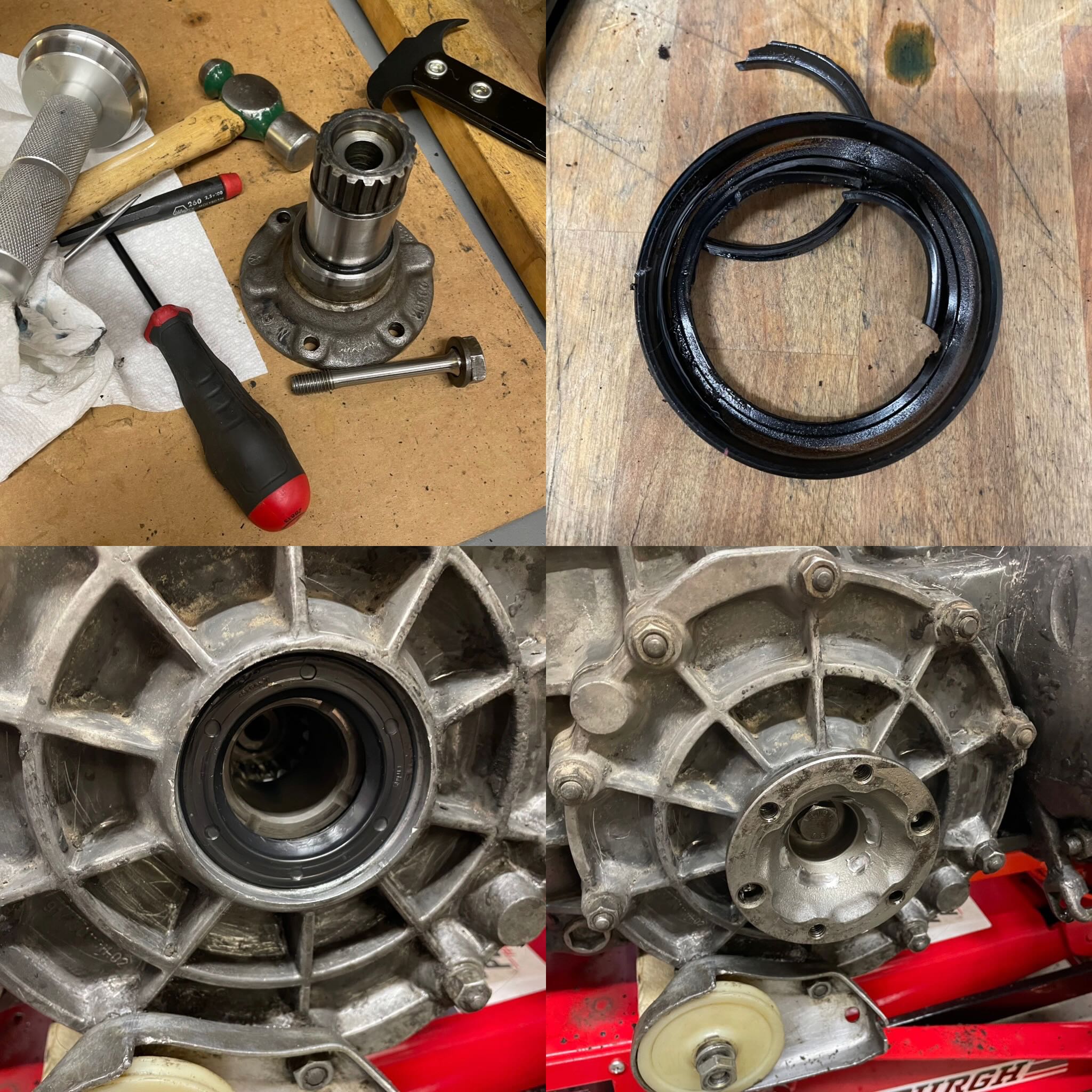 Installed new seals for the transmission flanges to address a slow leak. Put in new-to-me flanges to replace the old ones with messed up, stripped threads. Re-installed oil cooler with fresh seals after cleaning up the air path. The old seals were hard as a rock. I am hoping that solves the dripping off the bottom of the oil filter. All in all a good day of movement on the annual winter project list. |