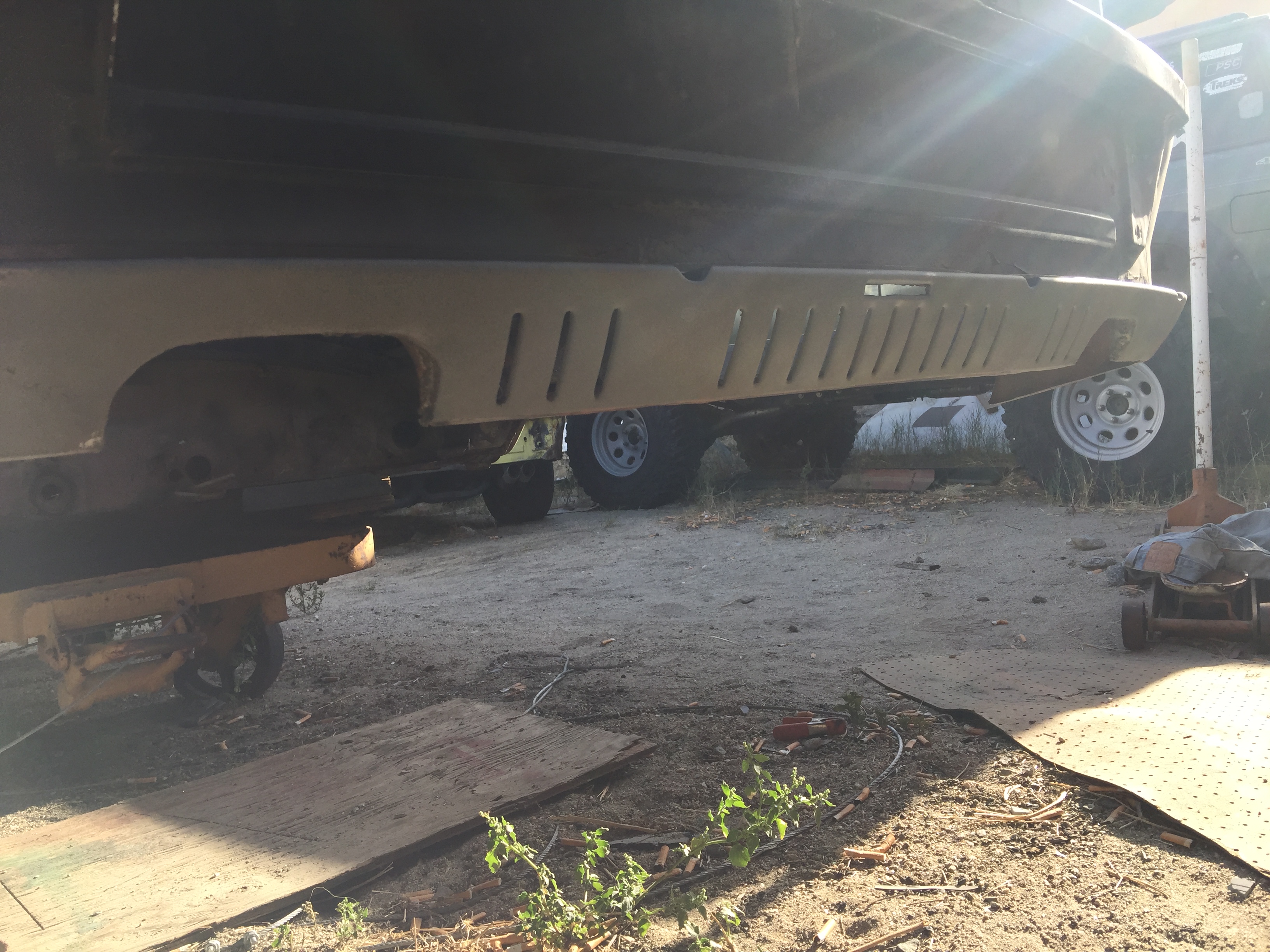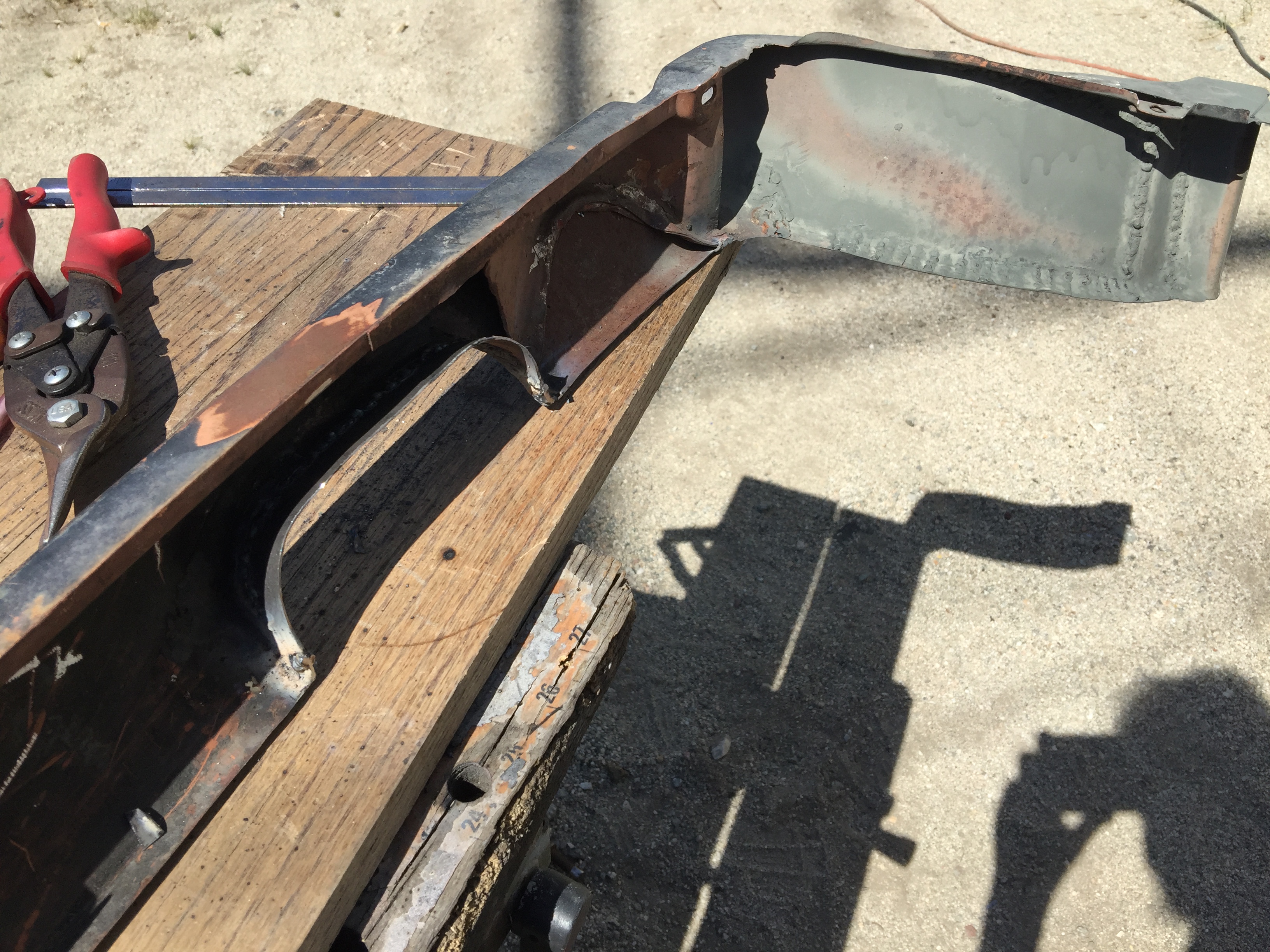 Hood over exhaust cutouts fabed and welded in. The valance ended up just as stiff as it was before I cut two big holes in it. (IMG:style_emoticons/default/wacko.gif) Plus it looks better. Bullet dodged. On to the other side of the valance to fit the flare (IMG:style_emoticons/default/smile.gif) |