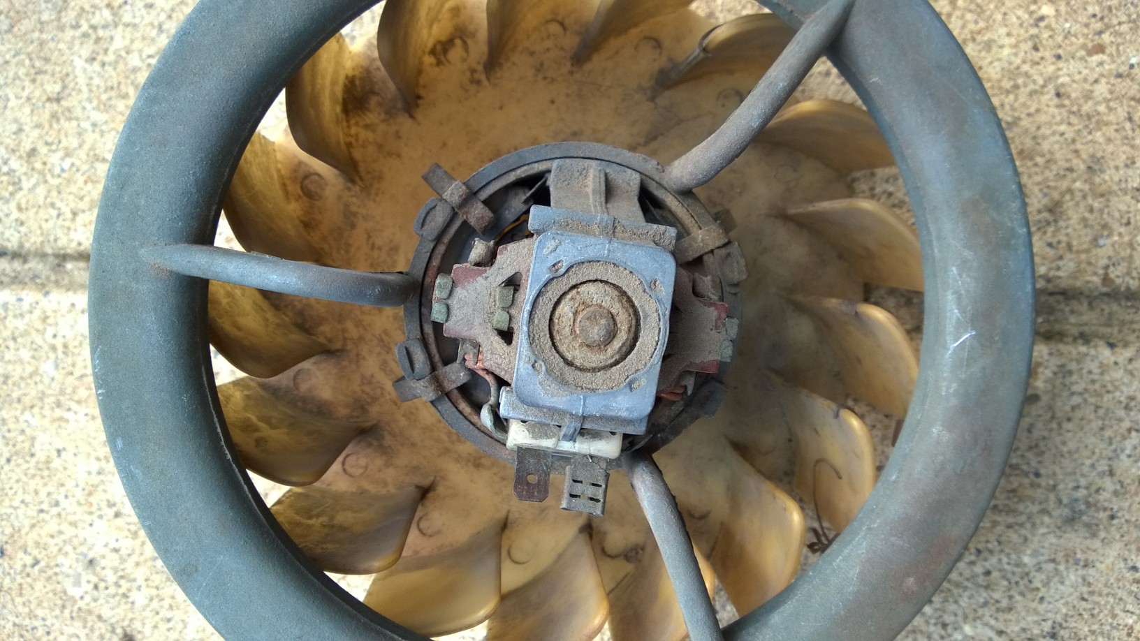 Handle would be a stretch. The electric fan motor has 3 different ground inputs from the dash switch. I would assume each of those has a different resistor to create a different speed. I'm going to open up the fan tomorrow and lube the inside bearing on the fan. I'll see what the motor and windings look like. To eliminate the dash switch you should be able to apply 12volts to the power pin on the motor. Then ground out each of the pins one at a time to start each fan speed. I'll confirm tomorrow. That will let you know which area to work on. Maybe I'll attempt a video with sound tomorrow On a positive note. You can still buy a new Bosch blower motor. With or without the impeller. IMHO, I don't think you could really thoroughly clean the switch contacts without taking the switch apart. There was a lot of corrosion on the bottom of the fingers. Here's what the inside of the fan looks like. I couldn't figure out how you got the motor out of the bushing, although there are four clamp springs that seem to be holding it in the housing. Those can be removed pretty easily, but I'm not sure if you have to press it out or what at that point. Mine seemed to be stuck in there pretty well, so I had to be satisfied with soaking the thing as best I could in penetrating oil and lubricant. I'd be interested in what you find and are able to do. If I had a week or more to wait to put this back in I'd do more testing and servicing before putting it back together, but I need this back on the road in the next few days as it's a daily driver. We may have to start up a thread specifically on this.... |