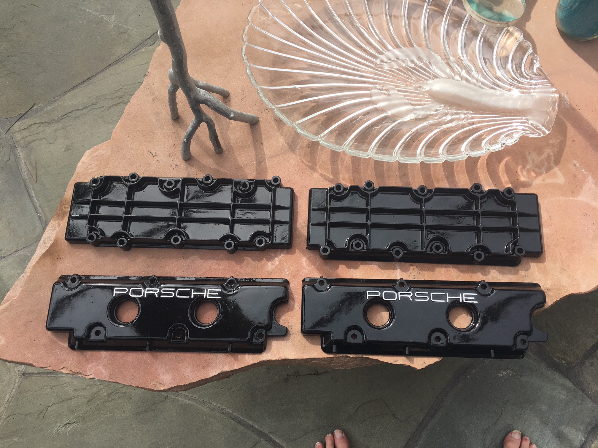 I worked on the valve covers / hot tanked them then cleaned and painted / then stole one of my lovely wife's emory boards to buff off the PORSCHE lettering / the finish looks much beter than the reflections being shown in the photos,,,,, (IMG:style_emoticons/default/sad.gif) Then helped Keith drop his motor yet again......