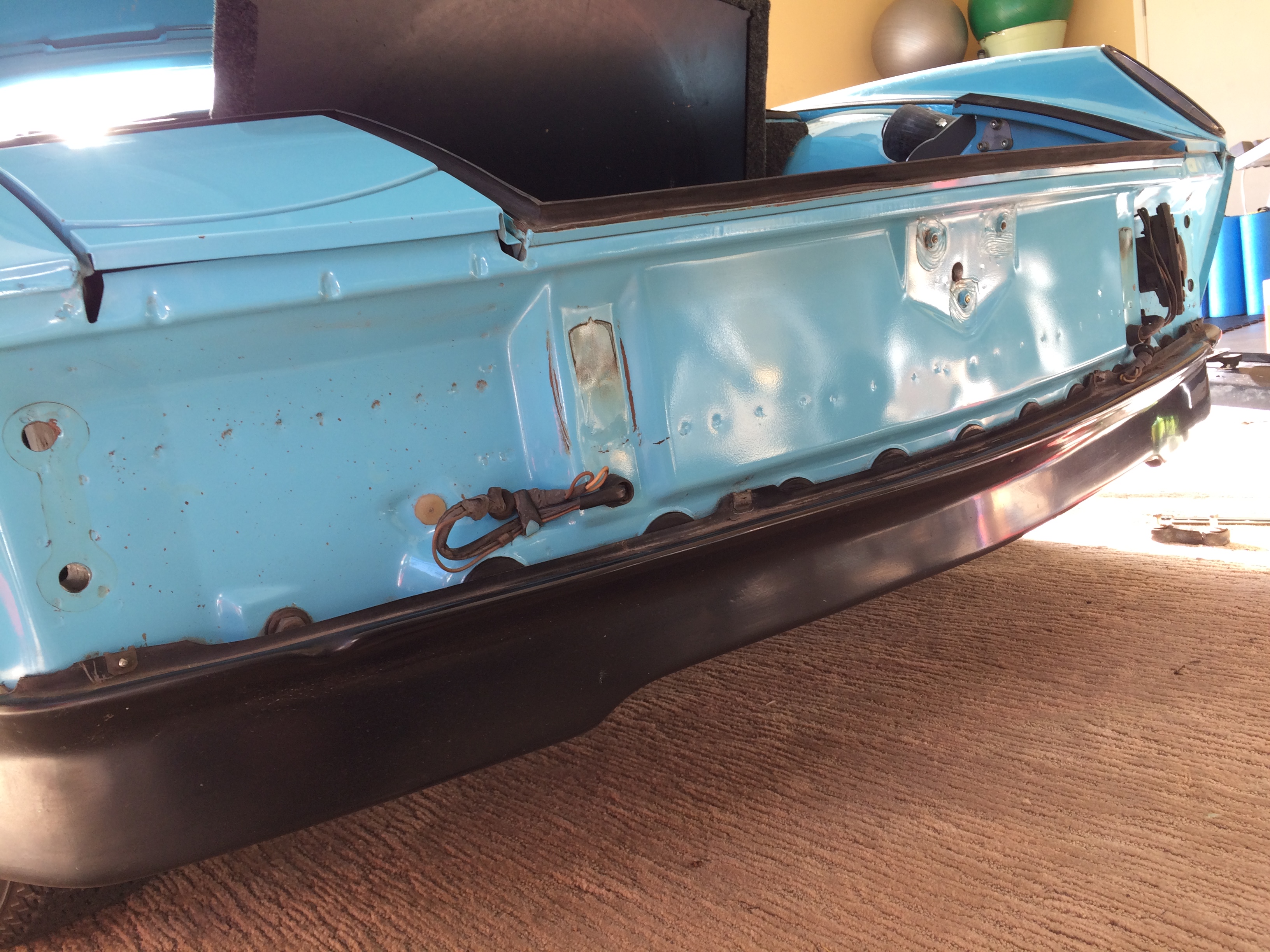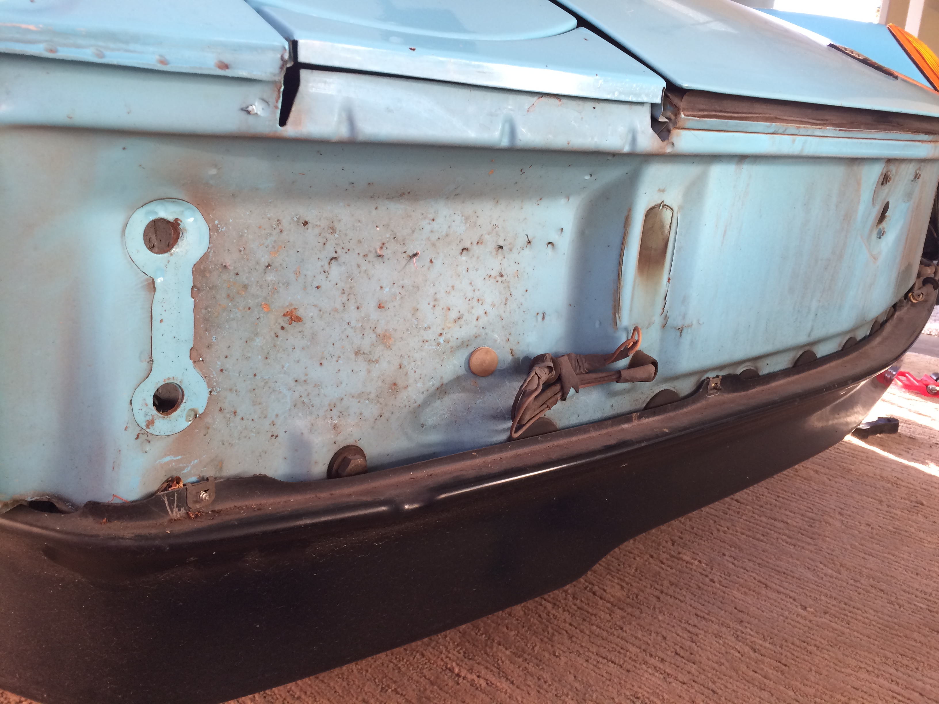 Day 3 resto: Removed the bumper and wife popped the trunk yesterday So I spent the afternoon today I.D.-ing weird wires (CB wires), de-rusting the front latch release, and locating long deceased tenants(talk about finding a good reason to disassemble the car, screw rust dead mice are way more disgusting)