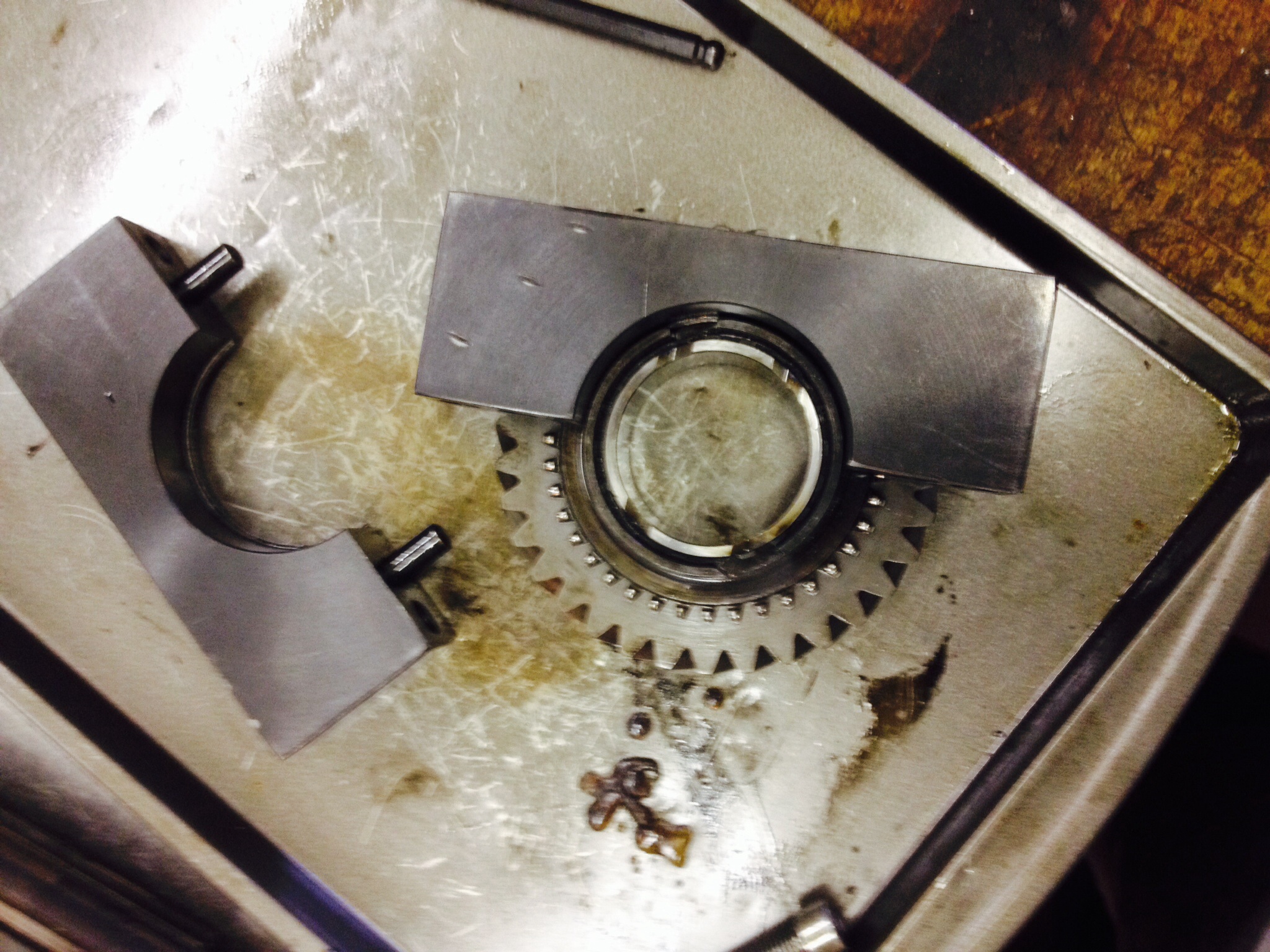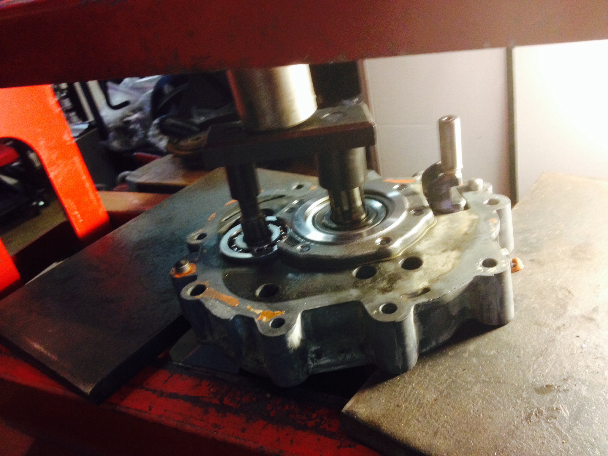 So we pressed out the main shaft and pinion from the intermediate plate. The factory tool is pushing evenly on both shafts so they come out together. Much more accurate than a hammer (IMG:style_emoticons/default/biggrin.gif) |
