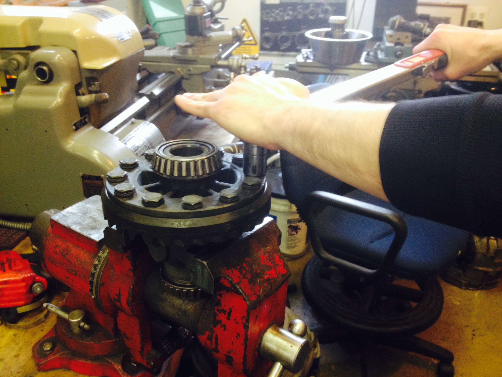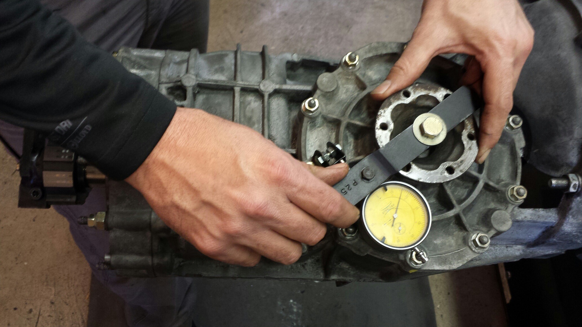 Next we set the lash. This factory tool attaches to the output shaft. We used a spacer to lock the shaft and pinion so the whole assembly rotates. .15-.20mm is optimal. Mine was .17mm. Done! We also set the drag while we were at it. Drag is a product of how much shim installed, lash is adjusted by where the shims are installed, port or starboard side of the diff.