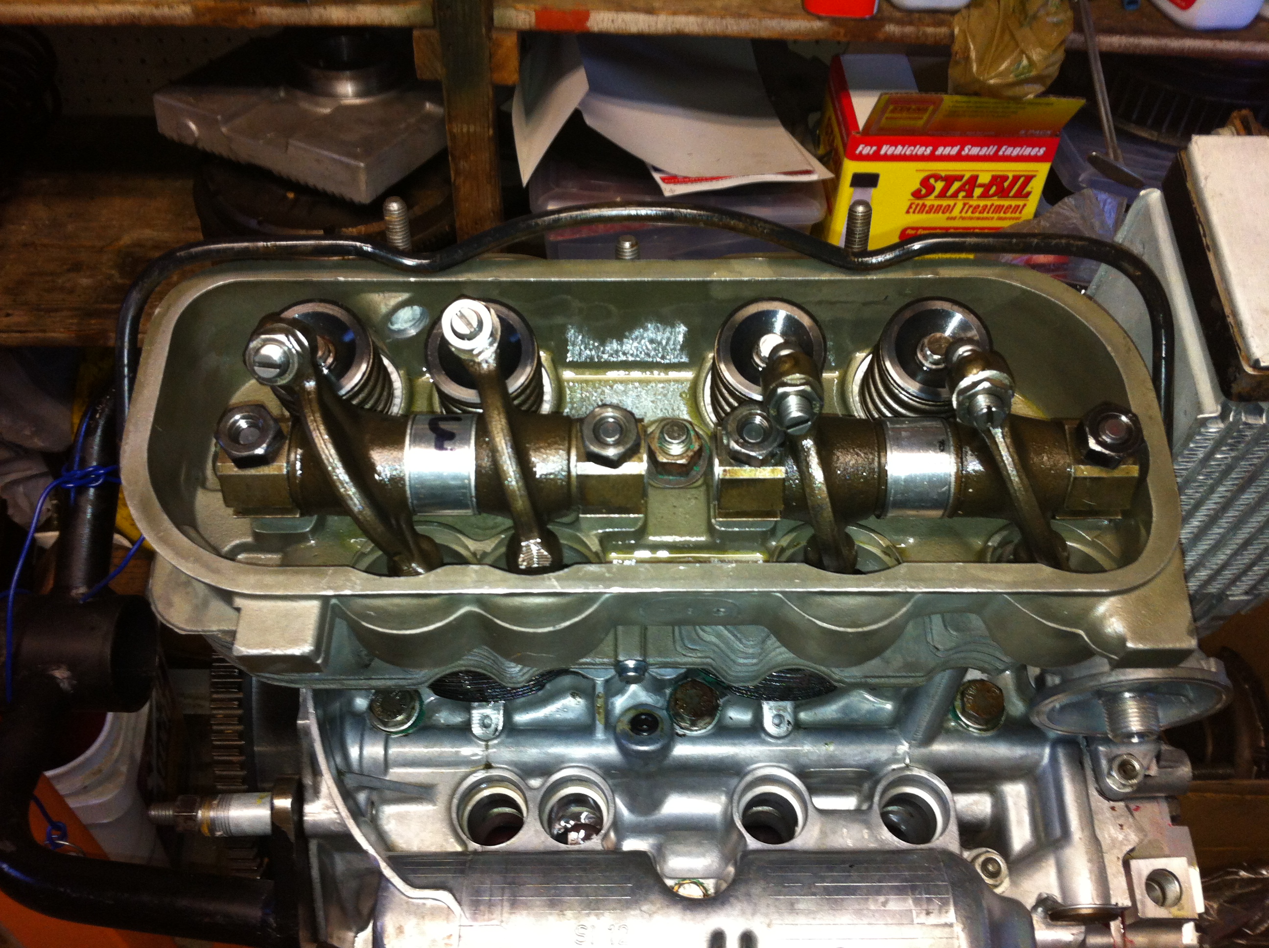 This weekend I finished my valve train. I ended up somewhat redoing my rockers as originally I had ground them by hand on a grinding wheel (over 7 years ago!) and used a caliper to try and keep them square. Previously I was using Ford Courier style adjusters (captured ball), this wasn't good enough for the 911 adjusters...