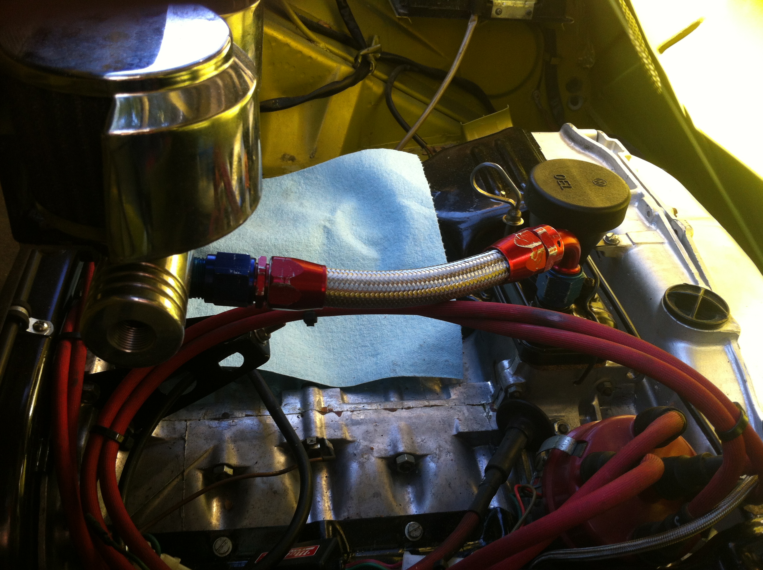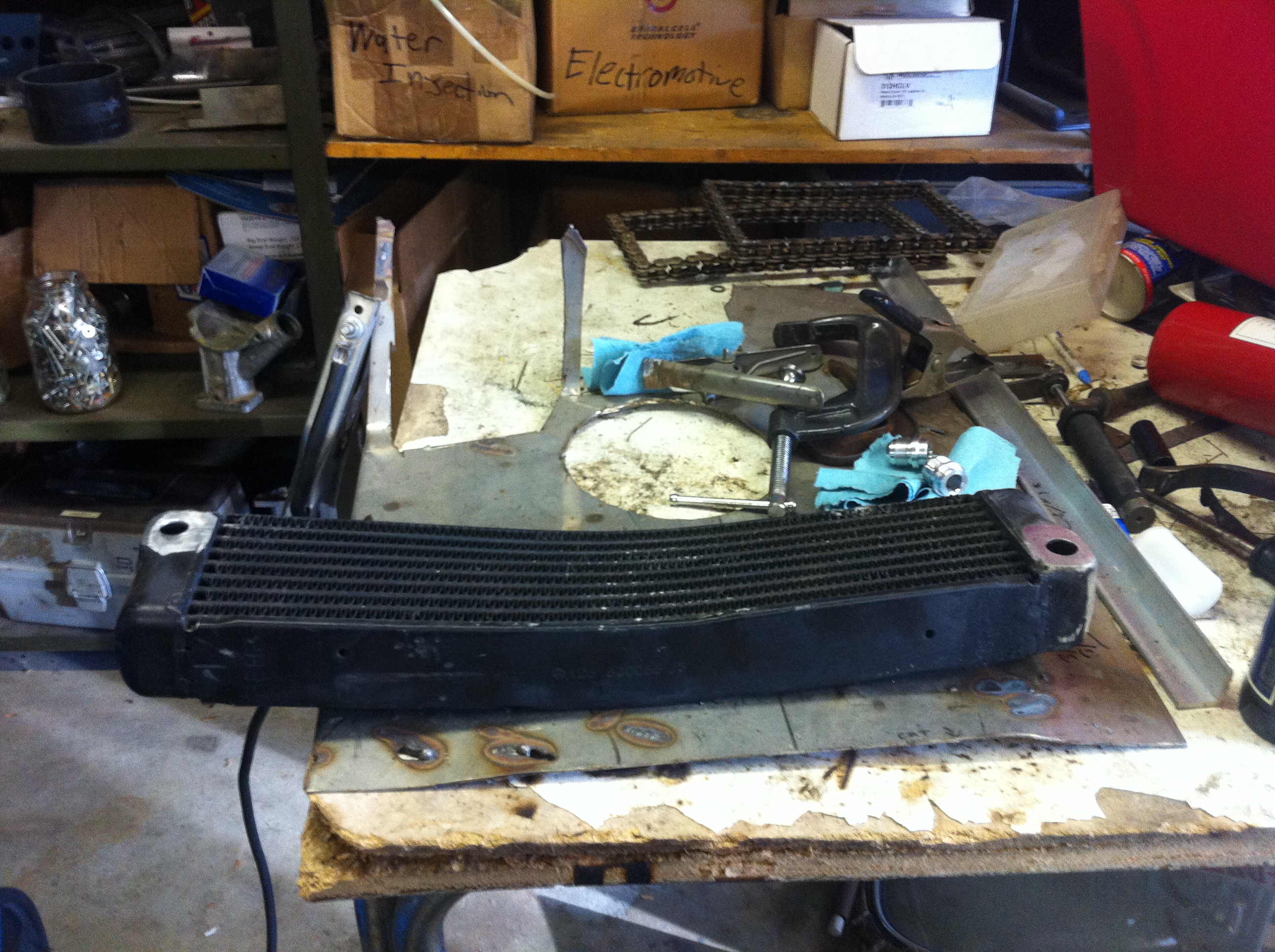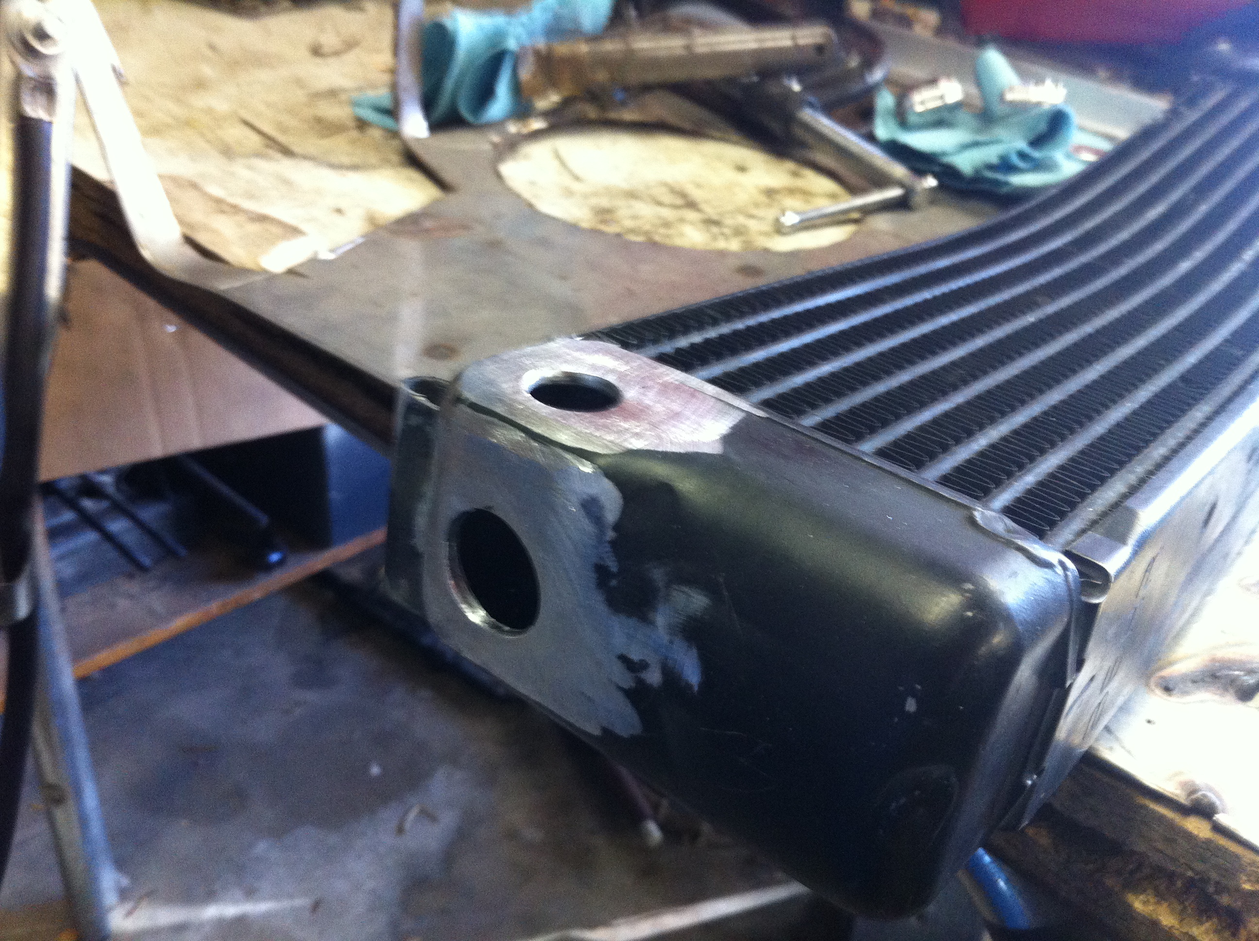 A few more... I have the scavenge line run up the passenger side, so it's time to get the oil cooler going. I got a Mercedes Benz oil cooler from Bruce and put a bend in it to match the curve of the front bumper. I then cut the original fittings off, welded them shut, and added -10AN fittings to the ends of the tank (vs. the face as original).
