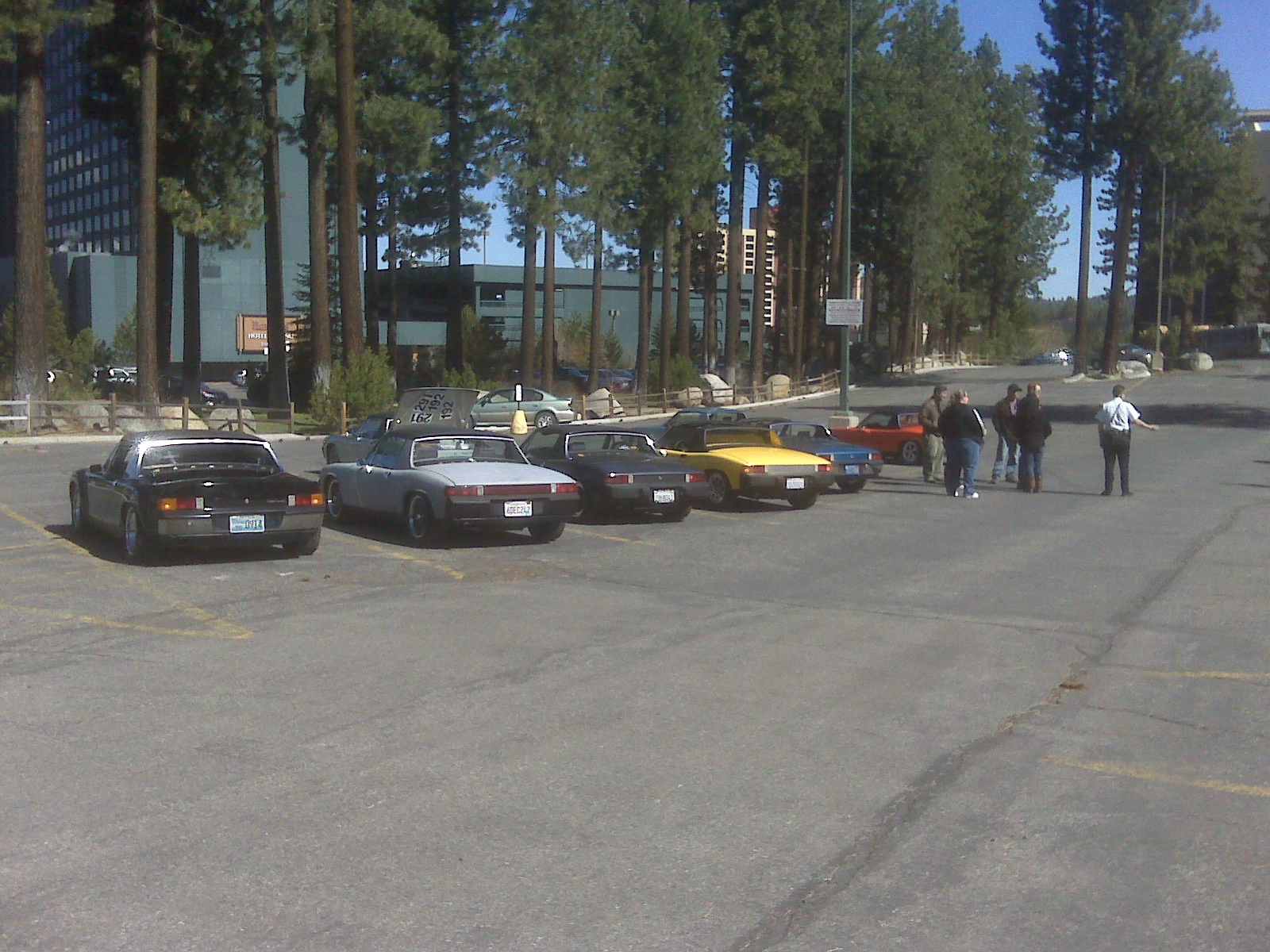 In my room, over looking the lot. Two 914's here already. Jim Hoyland's car that looks to have never seen rain before today. Mine up on the trailer awaiting Original Customs parking lot magic so it will run for more than a few minutes.