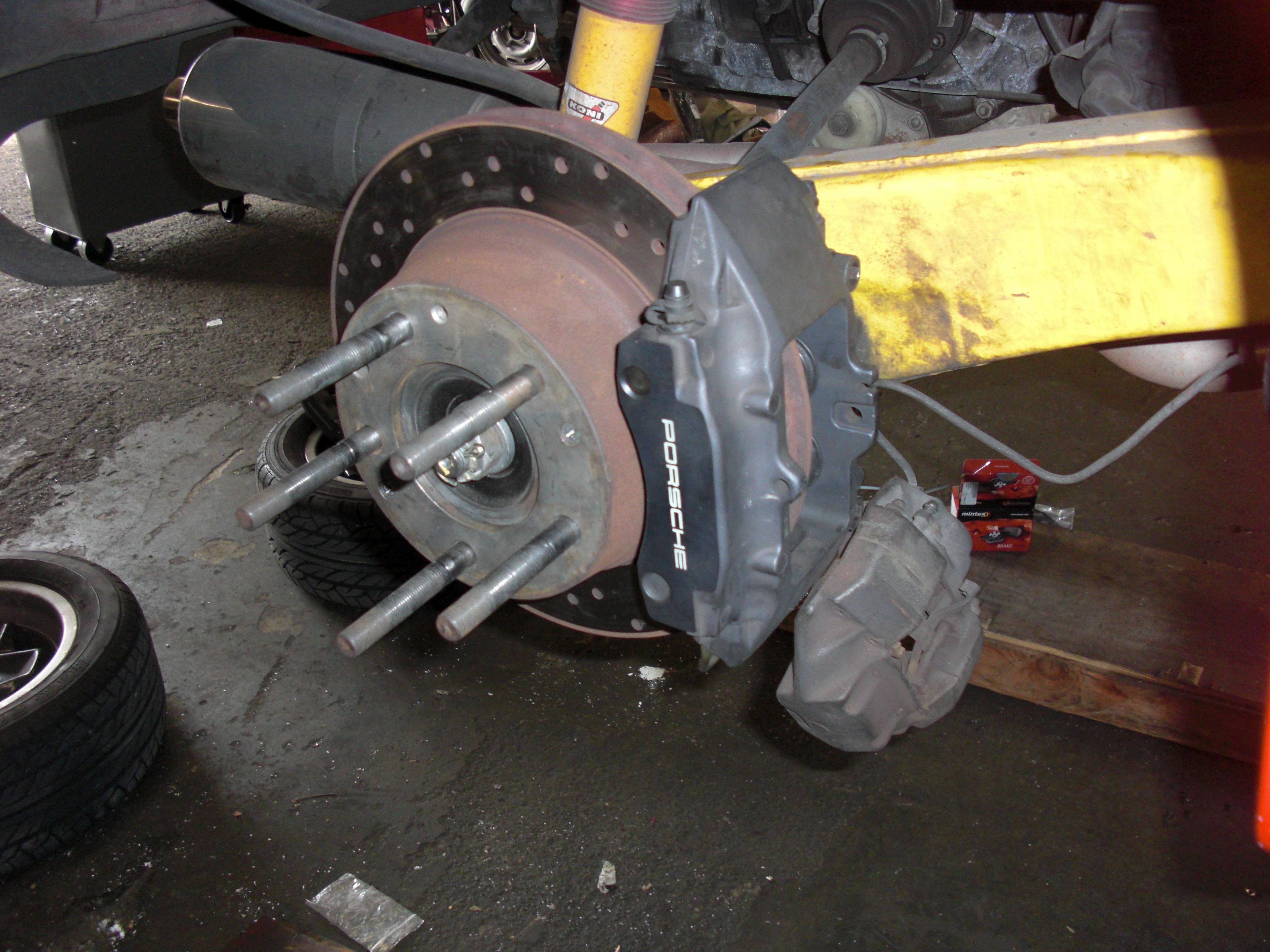 The idea was simple, get rid of the Carrera Calipers and mount Boxster Calipers all around using the mounting adapters from Rich Johnson. Of course, nothing ever goes as planned: (IMG:style_emoticons/default/headbang.gif) First, i failed to read Rich's instructions that clearly state that you have to use a 20mm 911 SC rear rotor. Well, i have 24mm Carrera rear rotors. The Boxster Calipers had to be machined (2mm off each of the brake pad pins) and the adapters had to be milled to center the Boxster Calipers over the wider rotors. (IMG:style_emoticons/default/smash.gif) Then, after everything was bolted together, i recalled reading that the hard brake lines may not be long enough. And sure enough (of course) the front brake lines were about 1" too short. Arrghhh. (IMG:style_emoticons/default/rolleyes.gif) McMark came to the rescue and we made two new lines. (IMG:style_emoticons/default/thumb3d.gif) In the rear, i used banjo fittings on the Calipers (Thanks to Eric Shea for those!) and the rear brakelines were no problem. Mark and i then bled the brakes. I was still getting some air in the front, but it was already 9pm so we decided to call it a night and i drove it home (40+ miles). The brakes actually felt fine, they seem to work great. I'll go back to the OC shop next weekend and we'll bleed them again. (IMG:style_emoticons/default/driving.gif) And now for the pitchers: (IMG:style_emoticons/default/beer3.gif) |