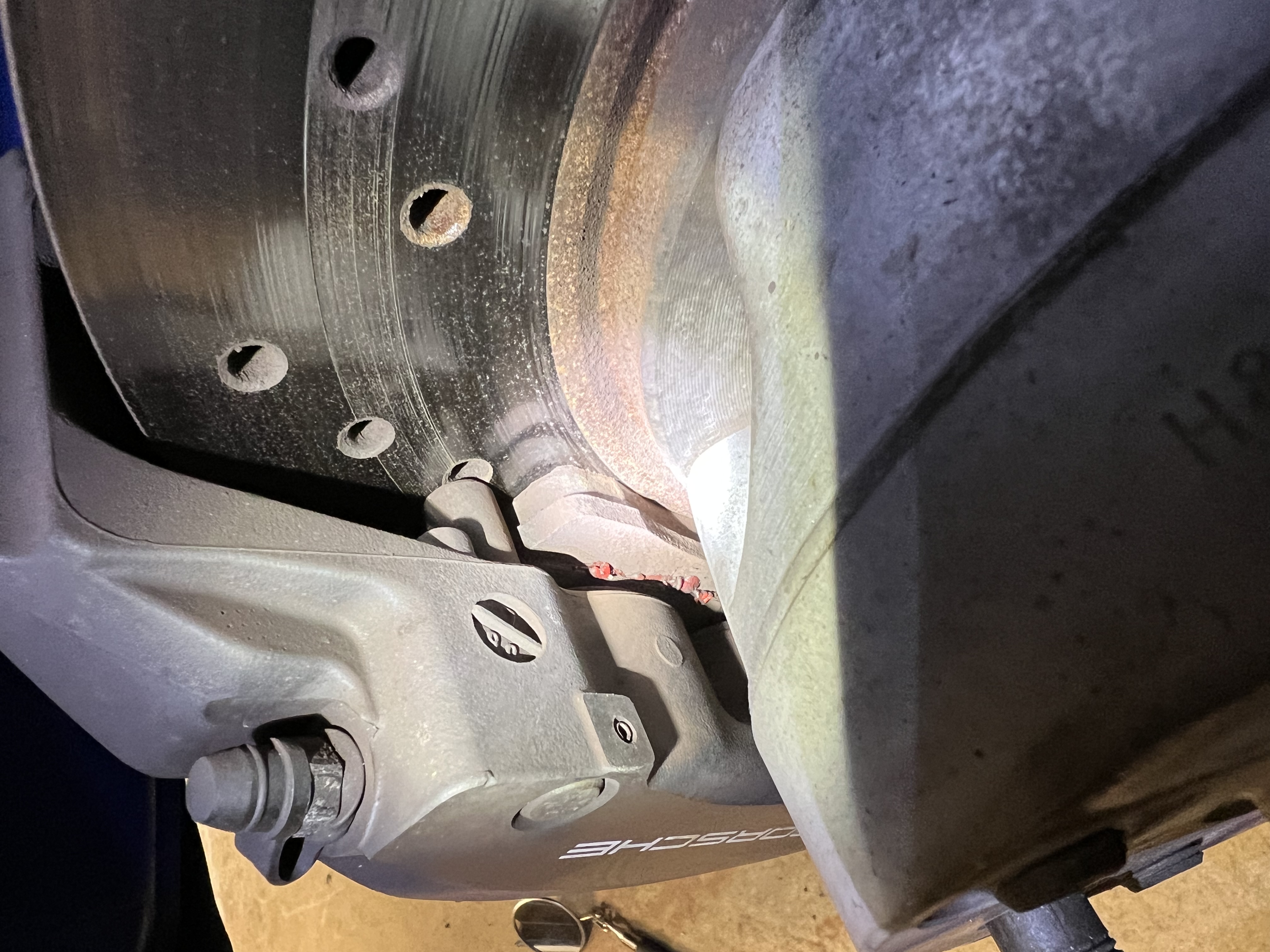 It is running 1st gen Boxster calipers (986-351-421) on a 911 strut (911-341-041) with a misaligned rotor, The rotor is unknown, but is 24mm thick, 11” diameter and is not centered in the caliper. It looks like I might have the wrong rotor on this set up. The questions at this point are: 1. where is this strut from 2. is the Boxster caliper an okay fit (seems spot on from what I’ve read). 3. What rotor should I be running; and 4. what modification are needed to fix the misalignment? The Caliper needs to move .06” (1.5 mm) outward so the rotor will be centered between the pins. I can’t see how one could shim the calipers in the correct direction. Pictures to follow… Attached thumbnail(s) |