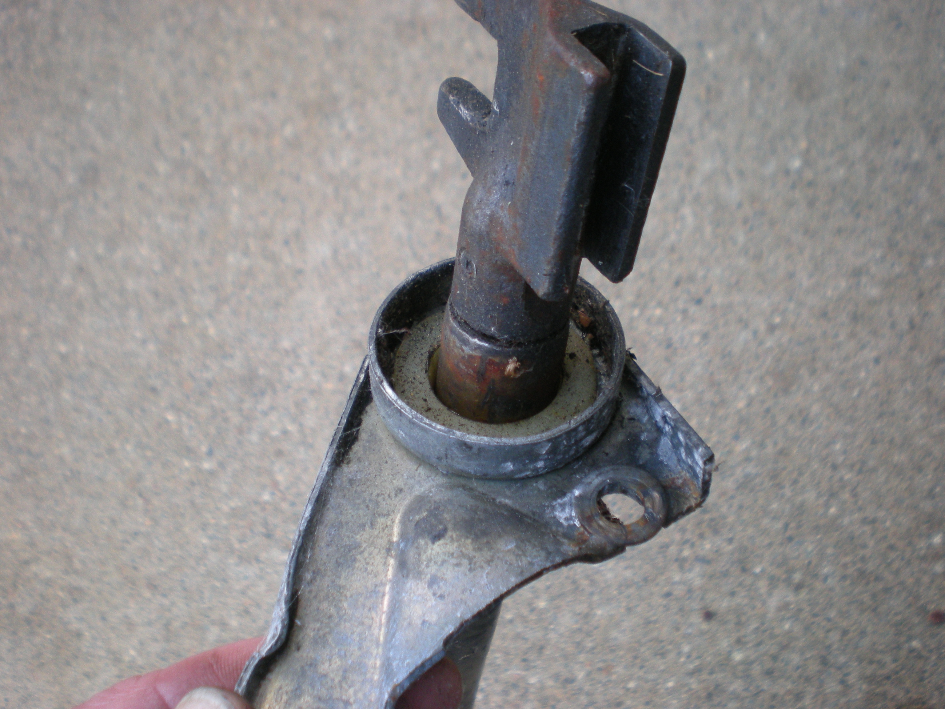 Can't tell for sure, but it looks somewhat like a roll pin. Should be able to punch it out with a drift (perhaps soaking in Kroil or PB Blaster first) and using heat if necessary. QUOTE(sixerdon @ Jun 10 2012, 05:14 AM) Yes, it is a roll pin. Not hard to do as per George Rud's suggestion. Then you can replace both bushings, front & rear. While you're at it, check the parts diagram for all related parts not shown in your pics. You seem to be missing them. Also, check the bushing in the tunnel while you're at it. If there is any play, replace it. QUOTE(stugray @ Jun 10 2012, 08:32 AM) Yeah, that is the AA POS that I tried to use many years ago. It wore out so fast that I put the original (broken one) back in with some JB weld and it worked better for a while. Next post is where I wound up. |