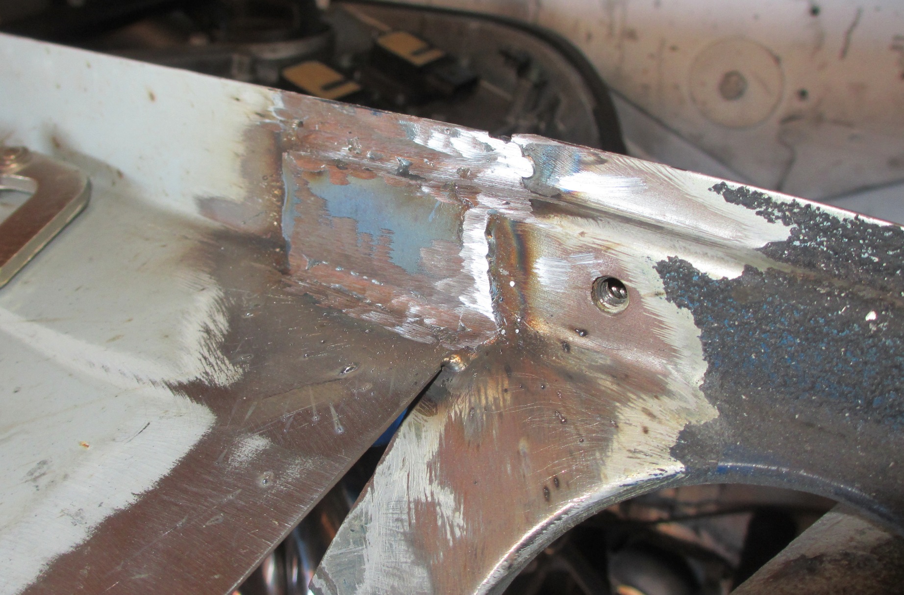 Pretty much sums it up... Rear firewall is being rebuilt. I curved it so it looks better and the seal will sit correctly. Basic hammer and anvil work. I might be able to put the factory latch back in too. Least of my worries. I welded dutchmen next to the plastic targa top holders. One of each mounting nuts got cut off int the process. Now I need to drill and tap. I cut the bottom out of the trunk too. Just up to the cross member. I'm going to make a dropped removable panel. Dropped so I can fit the methanol tank and because there is 4-5" of space from the original trunk to the tranny. I may have to box in the exhaust a little. I tried 2 exhaust manifolds so far. I'm waiting on a third to arrive for mock up. I "frenched" the coolant tank into the new firewall. The top is hammer rolled over a dolly. The placemant was coordinated with the intercooler... Next post |