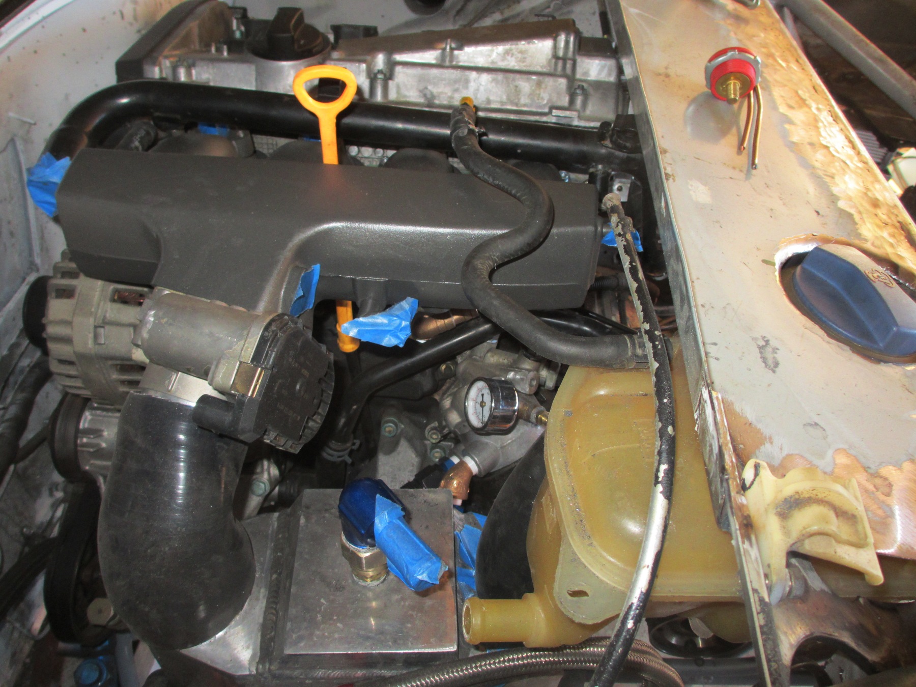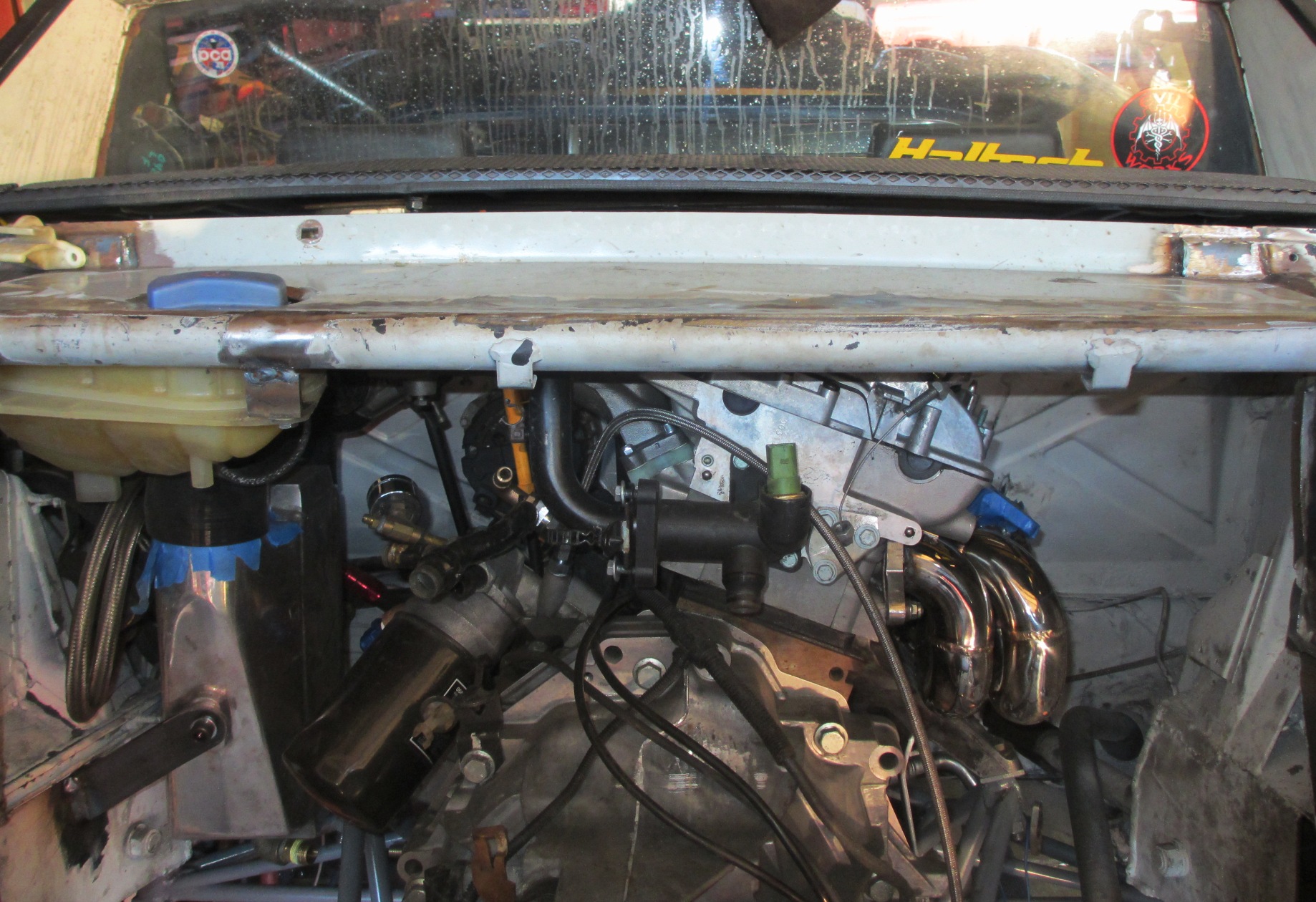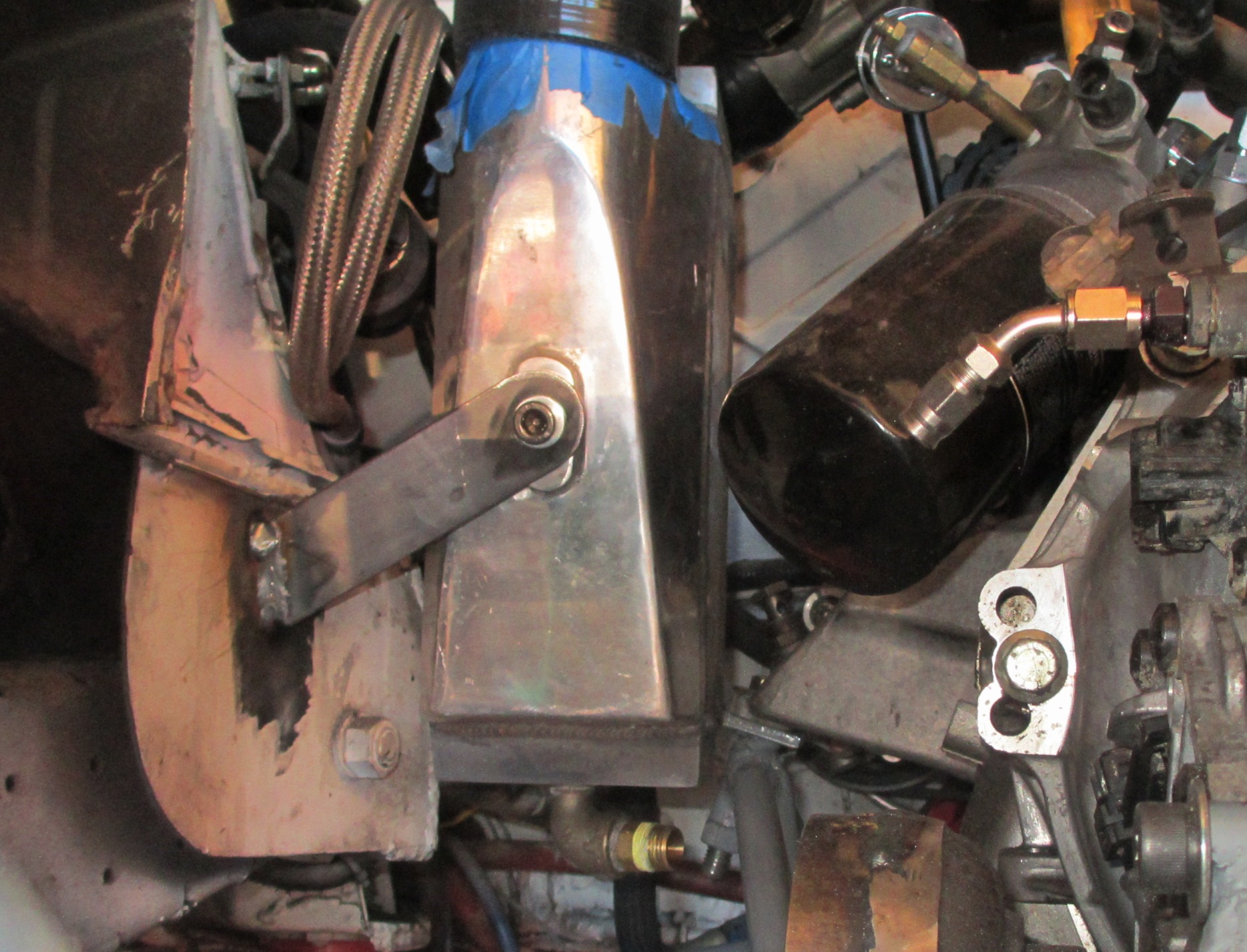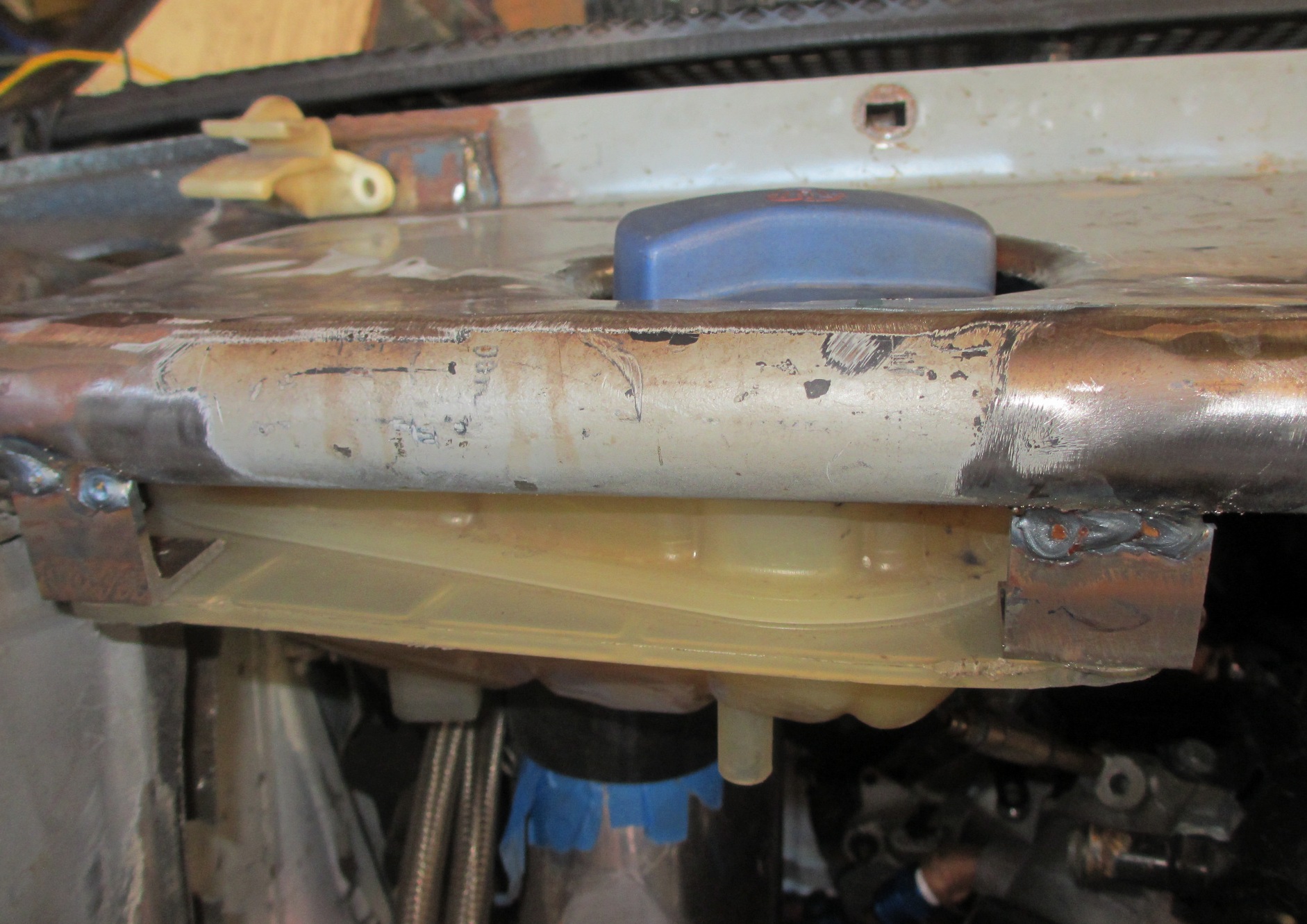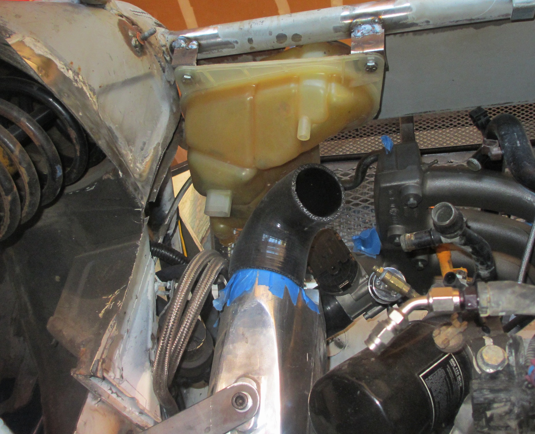 Still not exactly sure why you had to raise the firewall so much. Is it because of the exhaust? Anyways, Lots of work done! Awesome stuff! Valve cover, Water temp sensor, water outlet manifold, exhaust... Those are the reasons for the firewall movement. I just incorporated the roll cage bracing as the corner. It was the best place to make the transition. It had to come back almost to the bar on the cage. With the extra space, I installed the coolant tank and the remaining space will be: Intercooler piping, Diverter valve, crankcase evacuation system, heater plumbing. I may put more in there if it fits. The crankcase evac system will be done with 5/8" aluminum tubing. The heater piping will be 3/4" aluminum tubing. I also have to squeeze the turbo oil and water lines in this space. It will get crowded! The vertical panel will be removable for access to all the stuff. The Meth tank, pump, filter will go in the recessed area (lower cut out). The meth injector and solenoid will be on the intake manifold somewhere. Overall the engine compartment will be clustered with various things... (IMG:style_emoticons/default/smile.gif) |