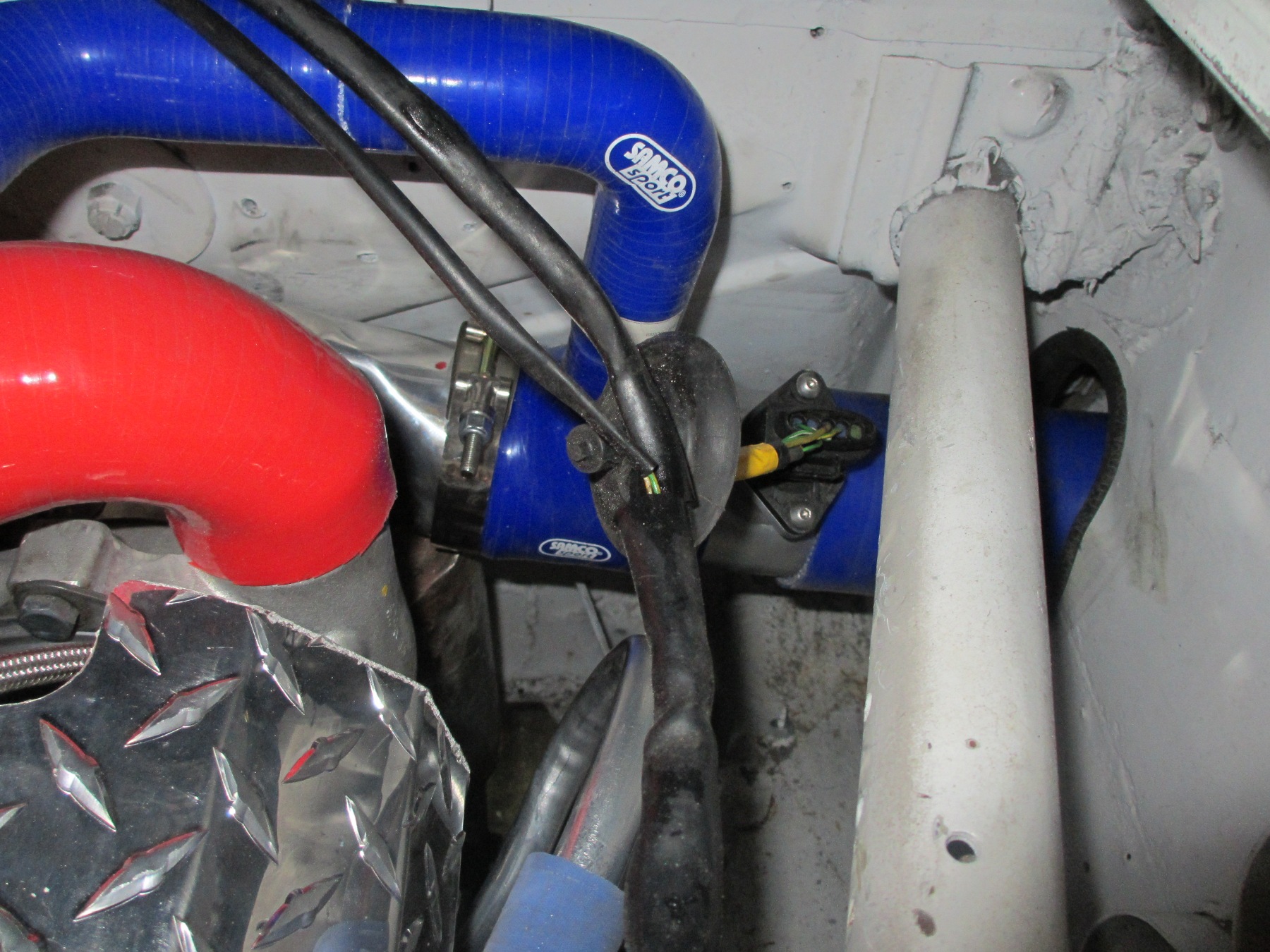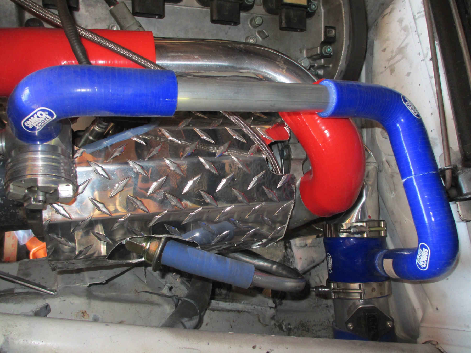 Plumbing, more plumbing... Got most of it licked! The pressure piping is red. I have a recirc valve plumbed into the turbo inlet. The recirc valve can also be a BOV but the ECU likes the missing air back. The cold air intake had to go in the fender. no room for the MAF, air cleaner and bends without hitting the turbo. I am leaving the hold in the side wall open to help draw air through the NACA. I built a inner fender liner out of aluminum to seal the chamber and keep road debris out...