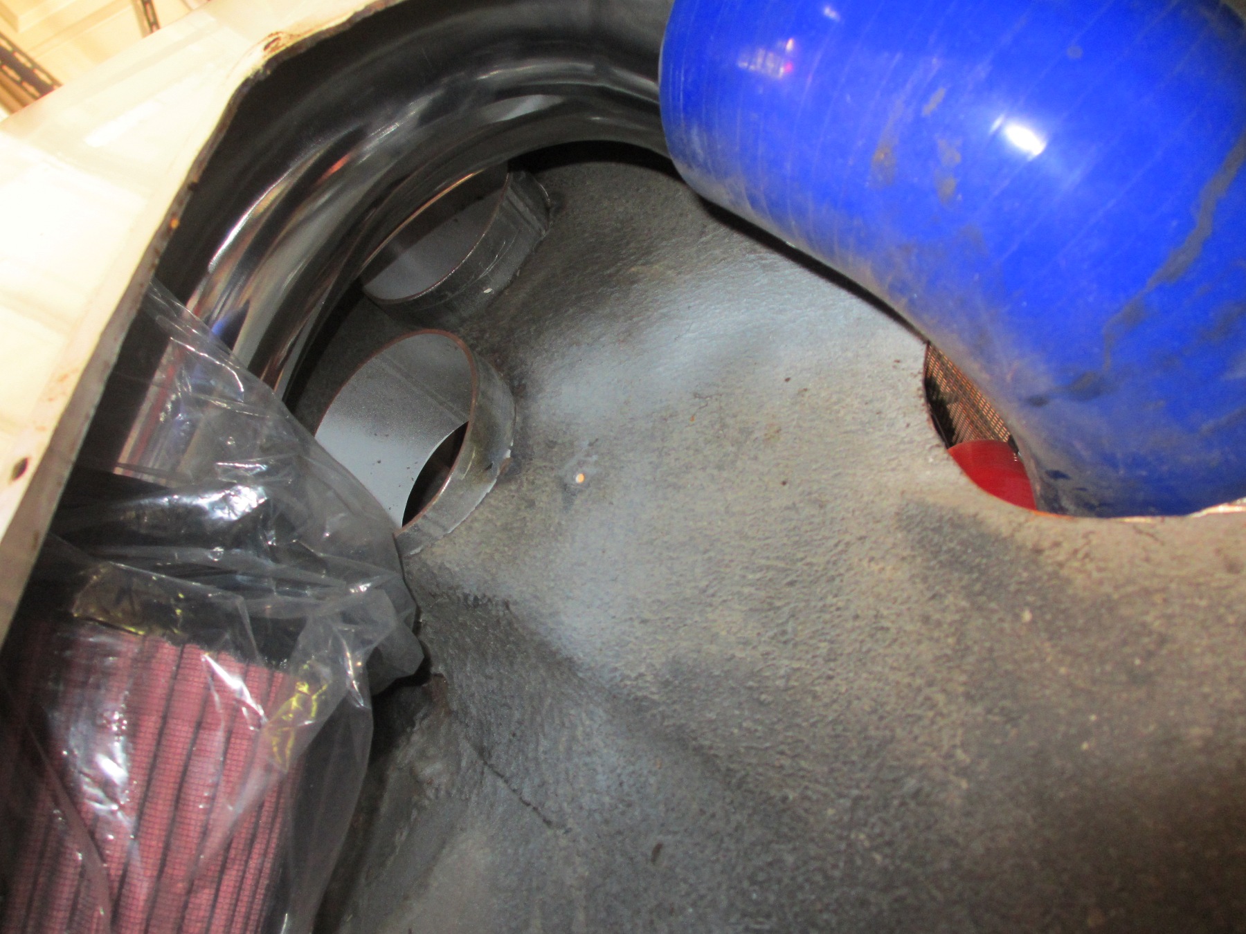 OUTSTANDING! I love the intake box in the fender. May have to steal that idea. Twice (one for each fender) on mine (IMG:style_emoticons/default/smile.gif) (1 each) long silicone 90, (1 each) aluminum 120 and (1 each) air cleaner. It took 2-3 weeks of deciding before I cut the hole. If I didn't have the MAF, I think I could have squeezed it into the engine bay. I did not want a short 90 before and after the MAF. Since I already had it cut for the NACA, it seemed like the best solution. When done, you can see the filter through the NACA duct. I used thick copper wire to make a wire frame template of the inner fender. Worked out great! |