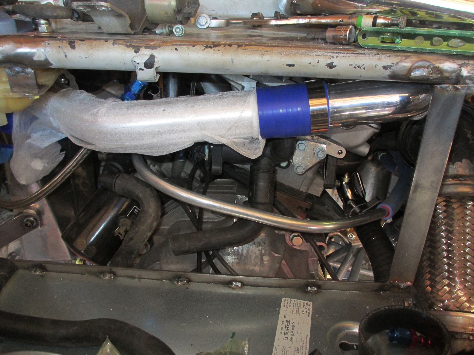 The intercooler was a challenge. I went back to the stock intake manifold and managed to wedge the intercooler into place. I have 1/4" clearance from the engine and from the side wall. I used a reducing 45 from the TB and a reducing 90 that is rotated 45 deg under the coolant tank. It all fits! This will plump to the turbo outlet with the bypass valve.