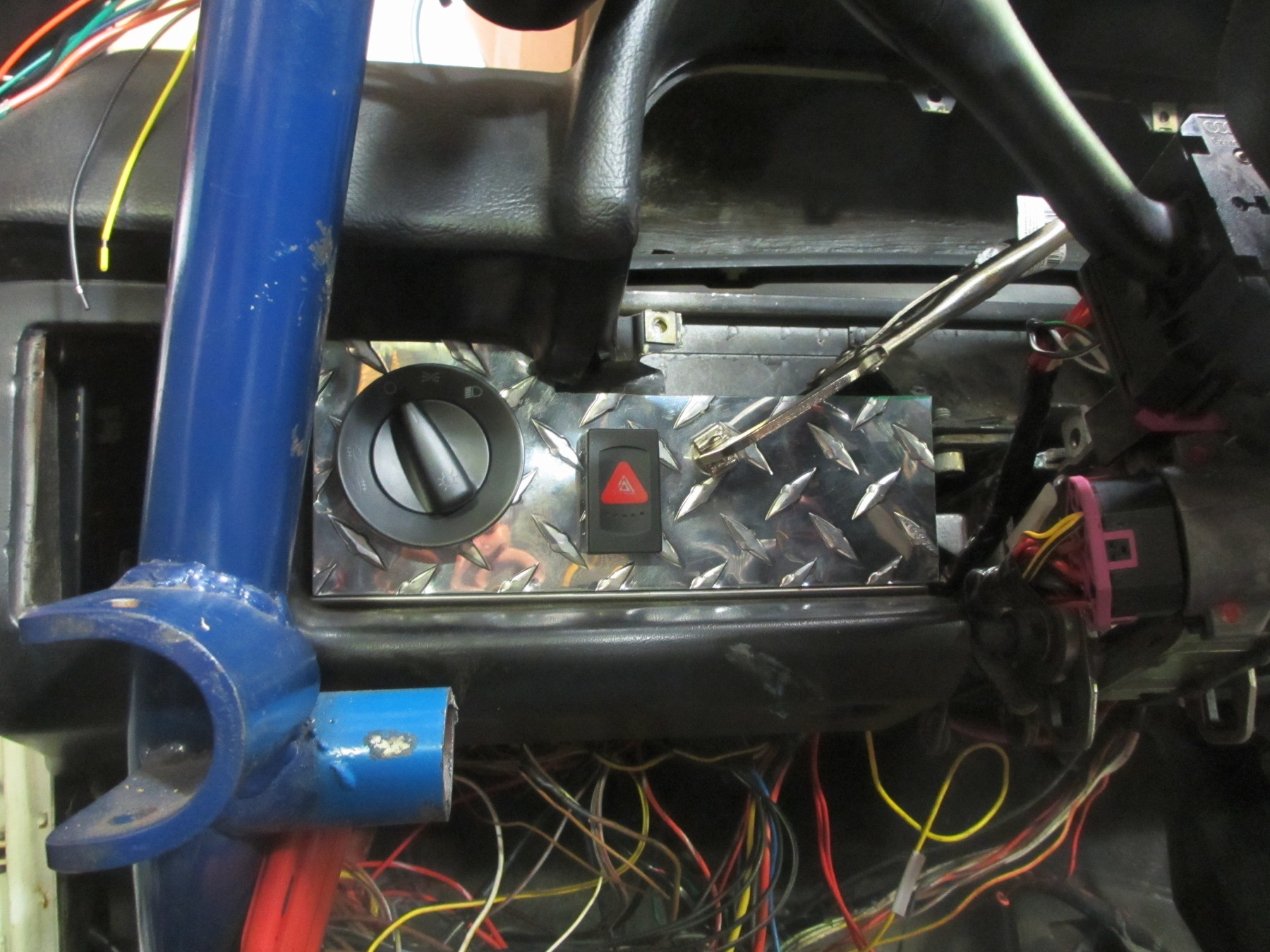 Grafted in the headlight switch and hazard switch/relay. I am building it into some aluminum diamond plate. Once complete, it will get painted black to match the other diamond plate in the cabin. I have eliminated the 914: headlight switch, hazard switch, flasher relay, fog light switch, Hi/Lo relay and all associated wiring... I still need to install the dimmer rheostat. I ordered 2 different Passat types to see which one looks best. The Passat stuff eliminates some of the 914 complexity in the wiring. Since I'm on a roll, I will finish the wiring before any more major fab. It also helps since it's raining and welding in a closed garage sucks! I scored a broken Passat fuel sender to check the resistance range. 300 Ohms full and 40 ohms empty. I need to find a sender to fit or have the old one modified. Here is a pic. I'm using a clamp to hold in place for now. There is no going back without swapping the entire dash... The switch rotates to turn the headlights on and pulls out (2 notches) for front and rear fogs. It also pushes in while off, not sure what that does yet. I am missing some pins on the harness plugs (Euro Version), so I ordered another pigtail to get parts... |