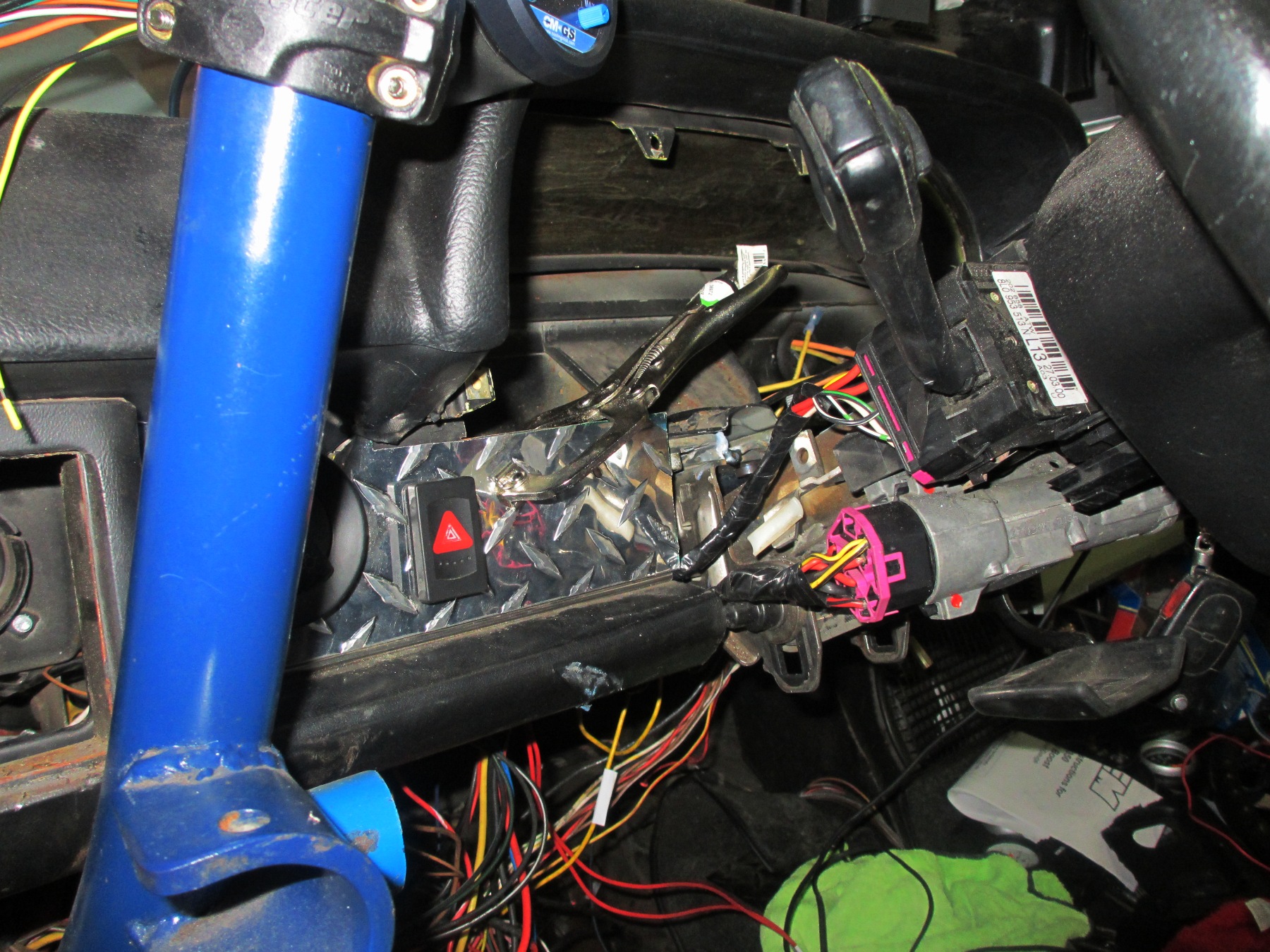 1) Cruise control 2) Intermittent wipers 3) Functioning immobilizer circuit 4) key that will crank the starter (I had a push button) 5) Tilt and telescoping wheel I have been spending the last couple weeks knitting the electrical system together. I got to hand it to the Germans! Many of the 914 wire colors match the Passat wiring. It looks like they have stuck to their wiring standards after all these years. The exterior light wires match perfectly. This allows for the use of the Passat flasher and hazard relay and switches. The switch contacts match too. Super easy! The cruise control is built into the ECU and pre-wired to the column. The windshield wiper/washer circuit is just as easy. Now I need to source a water bottle and pump. Everything else is a connection from the ECU to the dash cluster. I'm running multi-conductor cable for this. The old ignition switch wiring matches (mostly) to the new one and the wires to the engine bay will be reused. I'm not saying this is/has been easy but it is doable if you take your time and take a lot of notes. On top of that I have photoshoped the schematic into a color drawing. I also have a large color plotter at work to blow up the diagrams. Shown here without the air bag (just in the way) and with only the top trim in place. Note the dual gauge pod on top of the column... Here is one of my diagrams... |