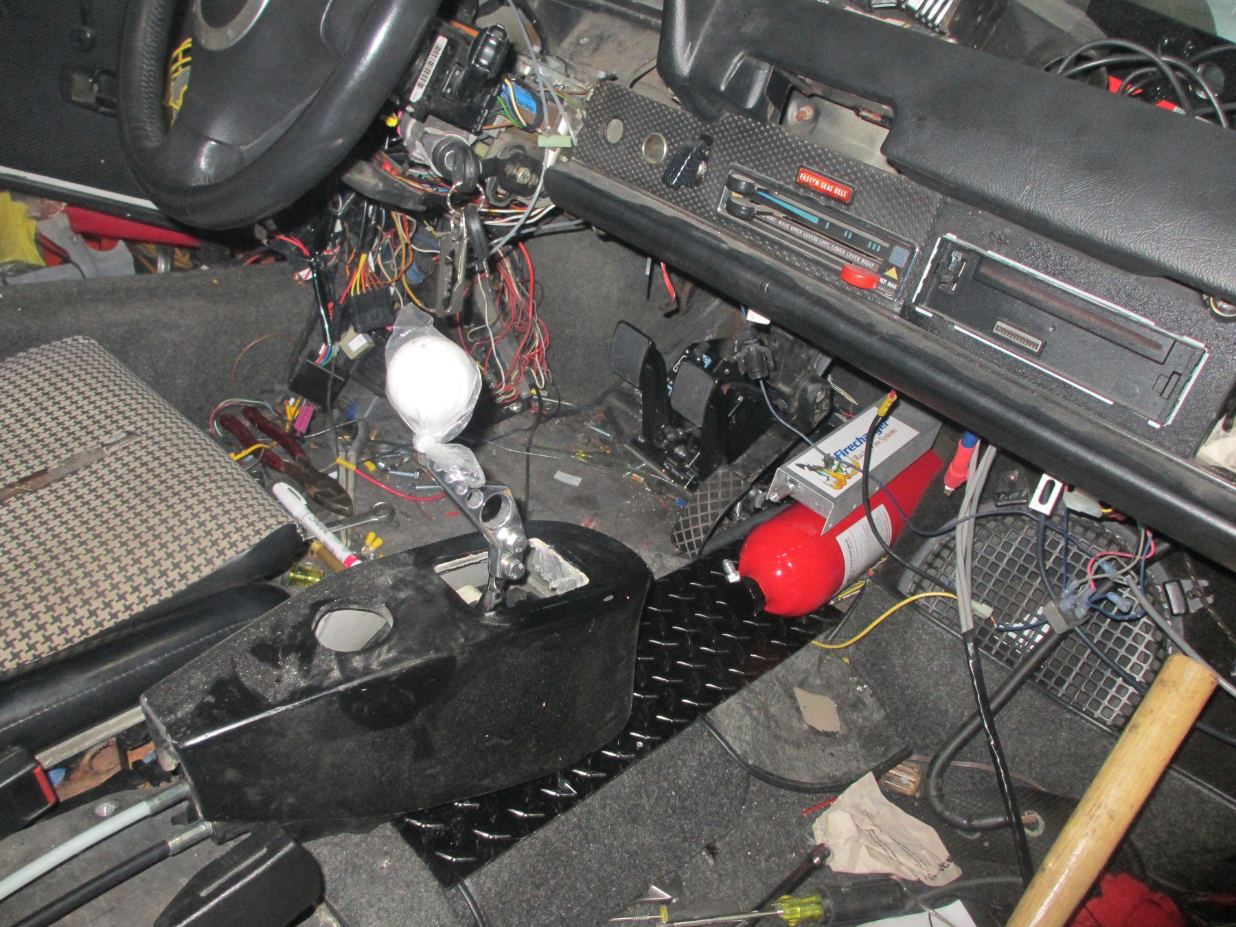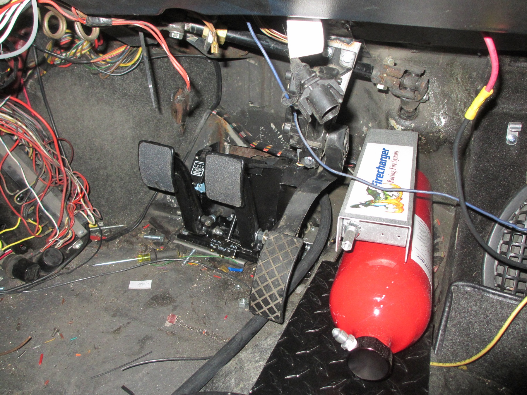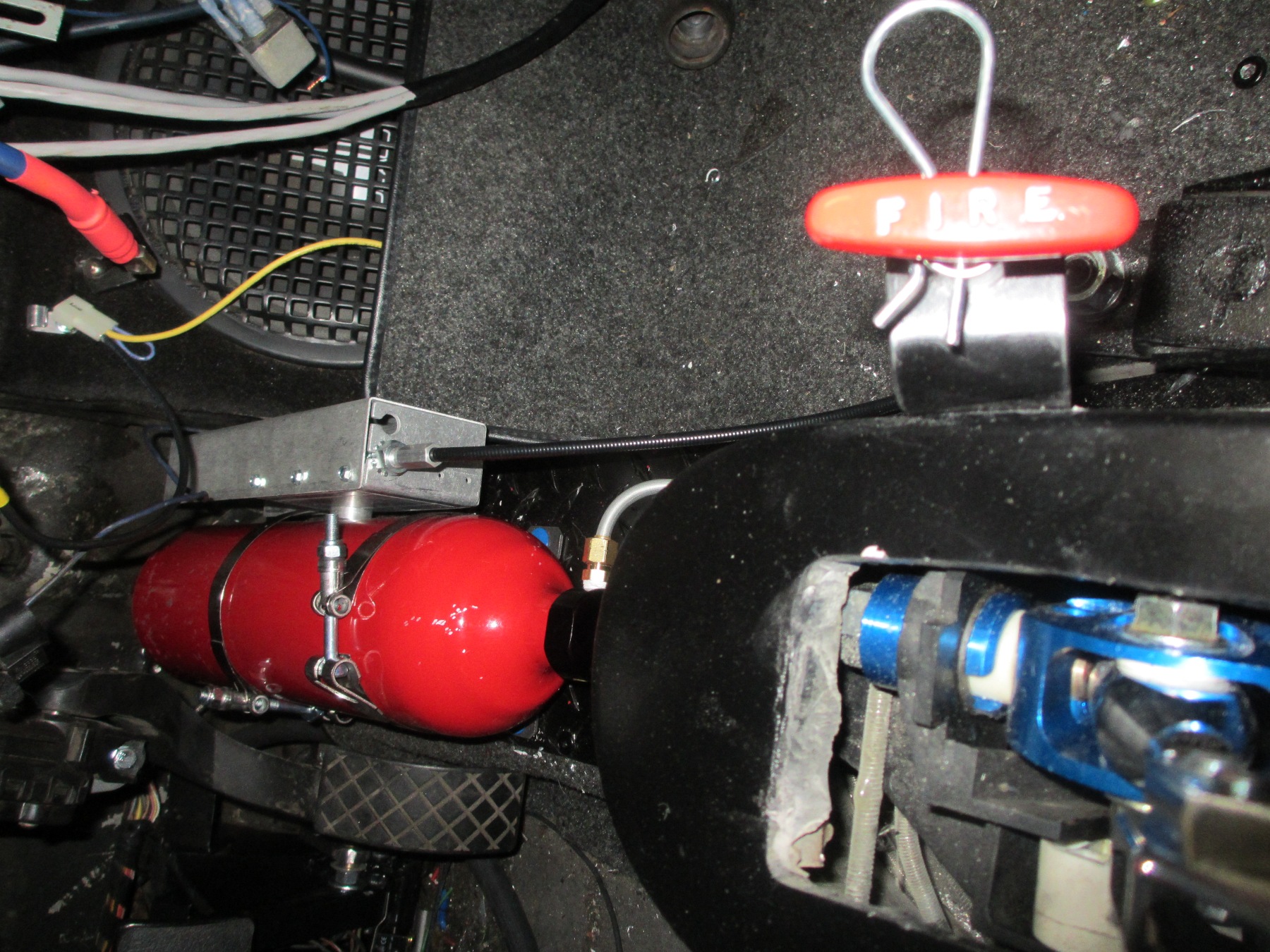 As I mentioned before, an AFFF fire system has been installed. This system is approved by many racing sanctioning bodies. This system from FireCharger is also refillable by me at any time. I runs off a compressed CO2 cylinder. You just need a refill kit and water. Very easy! I am more concerned with putting out a fire than weather or not the car will pass tech. I still keep fire extinguishers in the car any way.