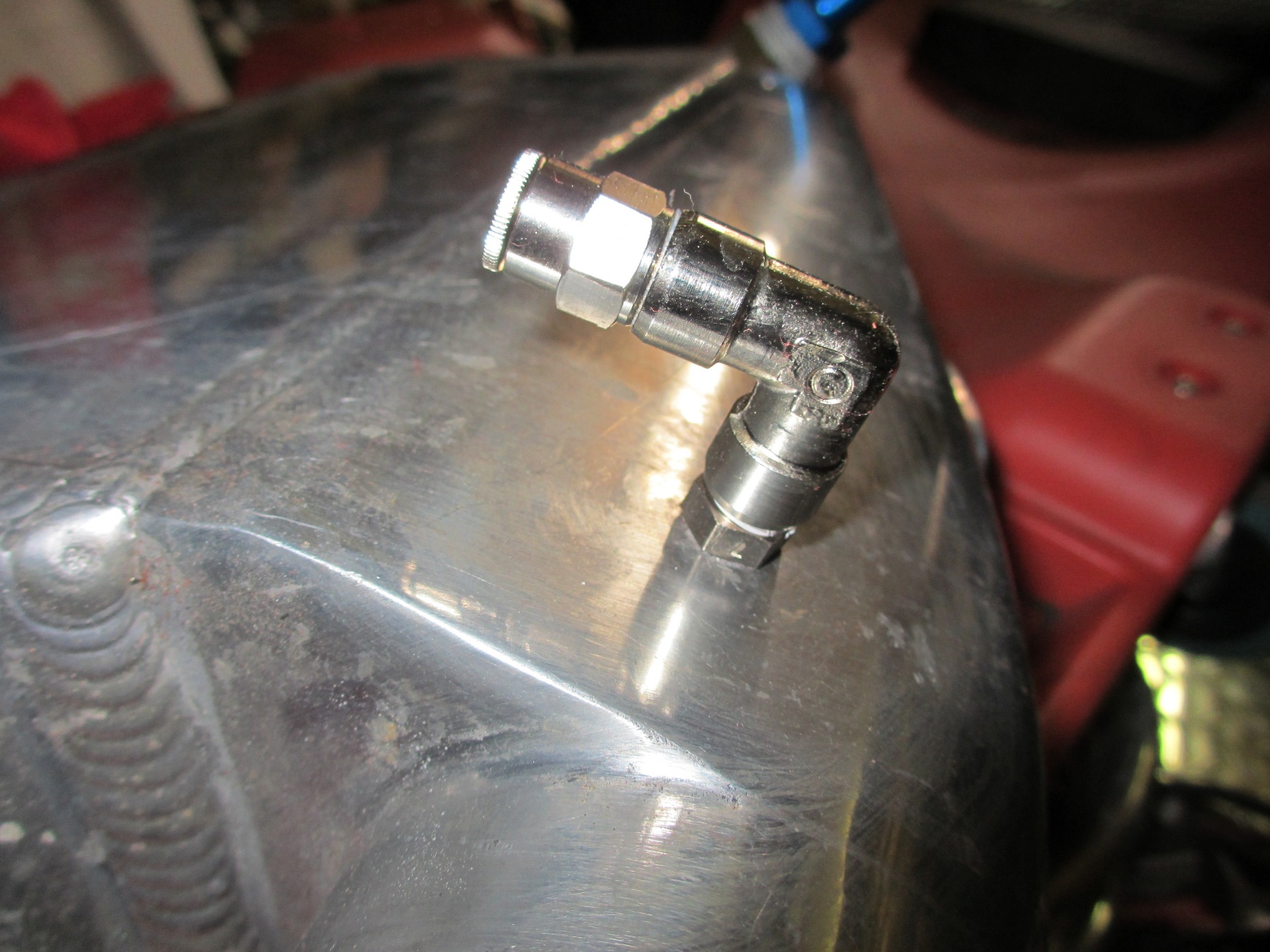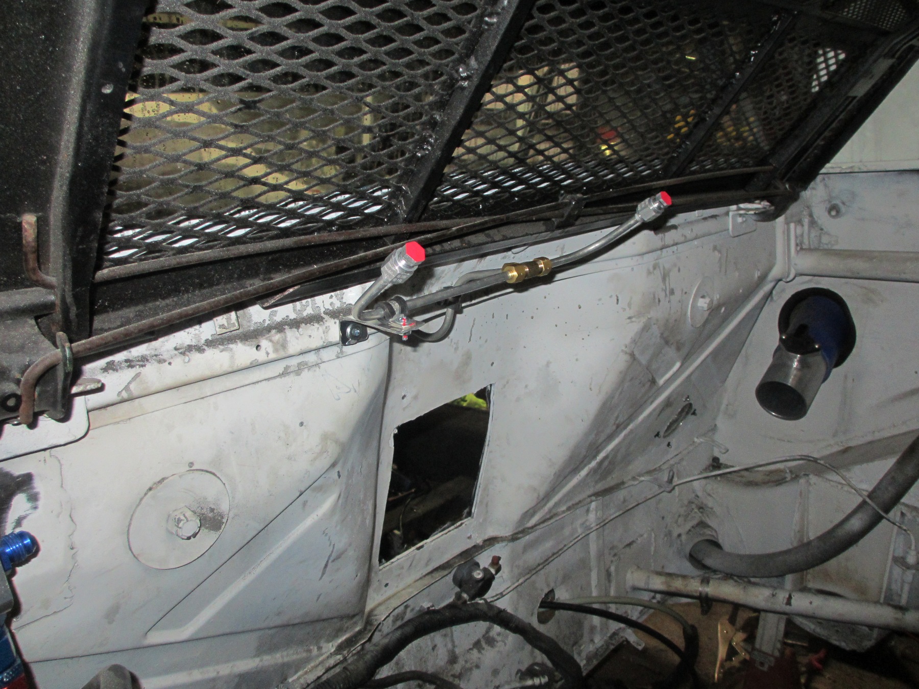I was drilling for some rivets to hold down the aluminum diamond plate tunnel cover. The fourth one I drilled I sment gas. (IMG:style_emoticons/default/sad.gif) I had to cut the tunnel open to get to the hard line. Yep... Hole through and through. Since the fuel system is already complete and I didn't fell like re-plumbing, I got a compression coupler from HD supply and fixed it. The aluminum hard lines use -6AN compression fittings anyway. They are designed for a brass ferrule, so I figured the brass compression fitting will be fine. It was a pain cutting the tunnel open with my air saw. No sparks! There is a small boxed section on the passenger side next to the shifter. When I ran the hard lines, one of them made it into this small cavity. It is just big enough for the 3/8" line to fit through. (IMG:style_emoticons/default/dry.gif) Good thing I picked up some .023 wire last week. This made rewelding the thin sheet metal easier. All fixed! I then switched to plumbing the fire system. Might come in handy some day... (IMG:style_emoticons/default/biggrin.gif) Lesson of the day... Know where your fuel lines are! |