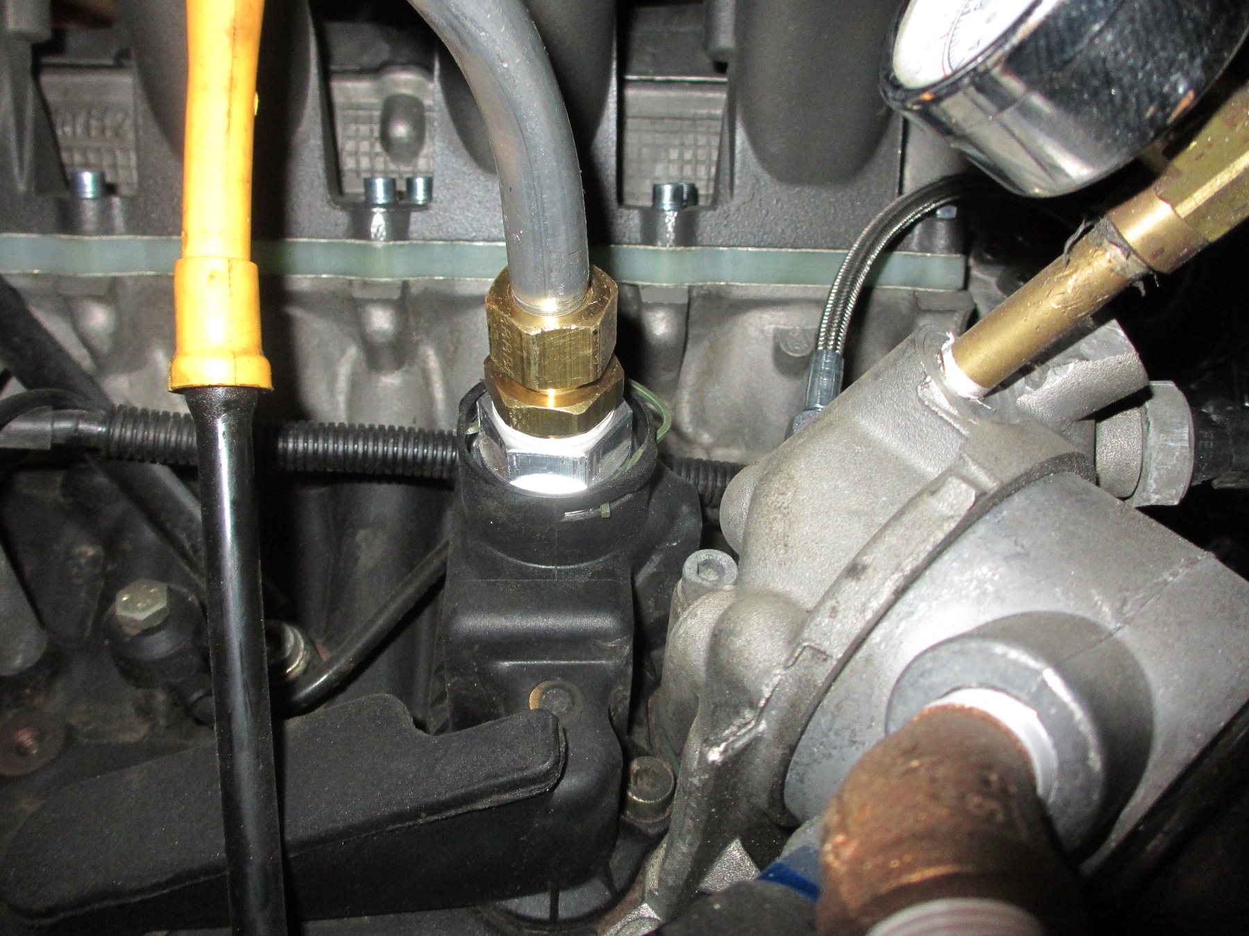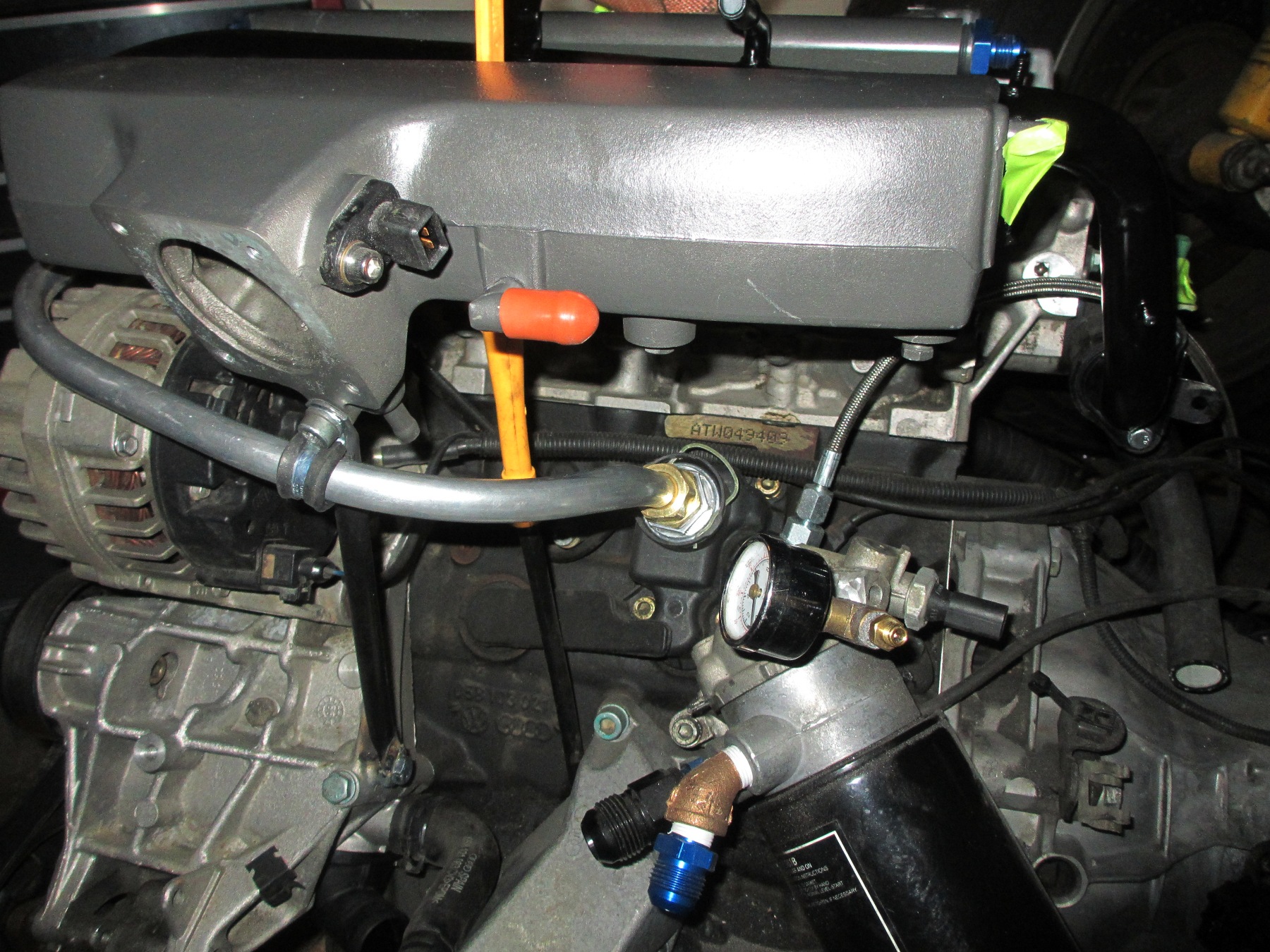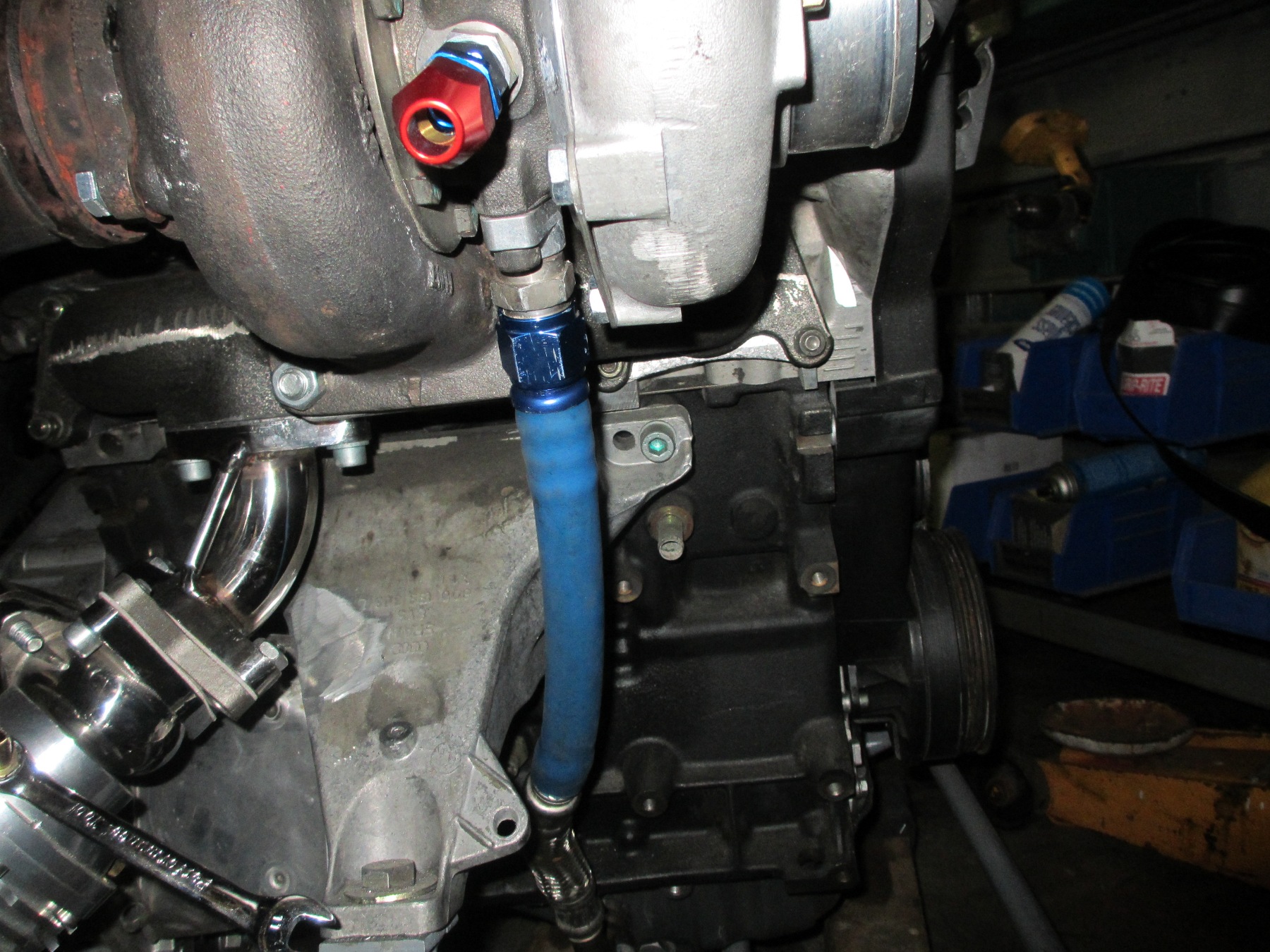 The methanol injector was mounted to the outlet of the intercooler. This is a 330cc injector good for 350hp @ 7500 rpm. Right in my range. Notice the tip is recessed. In theory, this allows the spray to form a "cone" before the air flow (passing by) cuts into the stream. By doing this it promotes better atomization. There is some debate on other forums about installing the injector within the intercooler. The argument revolves around pooling inside the cooler. In my case, I am running a solenoid before the injector to prevent dribble thus avoiding pooling. In addition, the injector will not open below 10psi and/or an analog signal from the MAF. The Audi/VW motors suffer from sludge build up in the PCV system. There was even some law suit over it. I decided to mitigate problems by using a crankcase evacuation system. 034 Motorsport hooked me up with a machined aluminum fitting that plugs into the system. I added some 5/8" aluminum hard line and brass compression fittings. This is the main line that heads to a custom built 1 gallon catch can. From the catch can the line continues to the vacuum venturi welded to the exhaust. This type of system is usually found on V8 drag cars. As the exhaust flows past the venturi a vacuum is pulled on the system- on the engine crank case. It was originally designed to help seal rings on high HP engines. So I get the best of both worlds. Reduced sludge and better sealing combustion chambers. Here is a pic of the turbo oil drain. I used the lower original oil drain and some high temp hose with an -10AN fitting. After cutting the factory stainless hard line, I rolled a bead on it to keep the hose in place. I finally got to use my mini bead roller! |